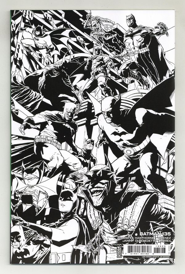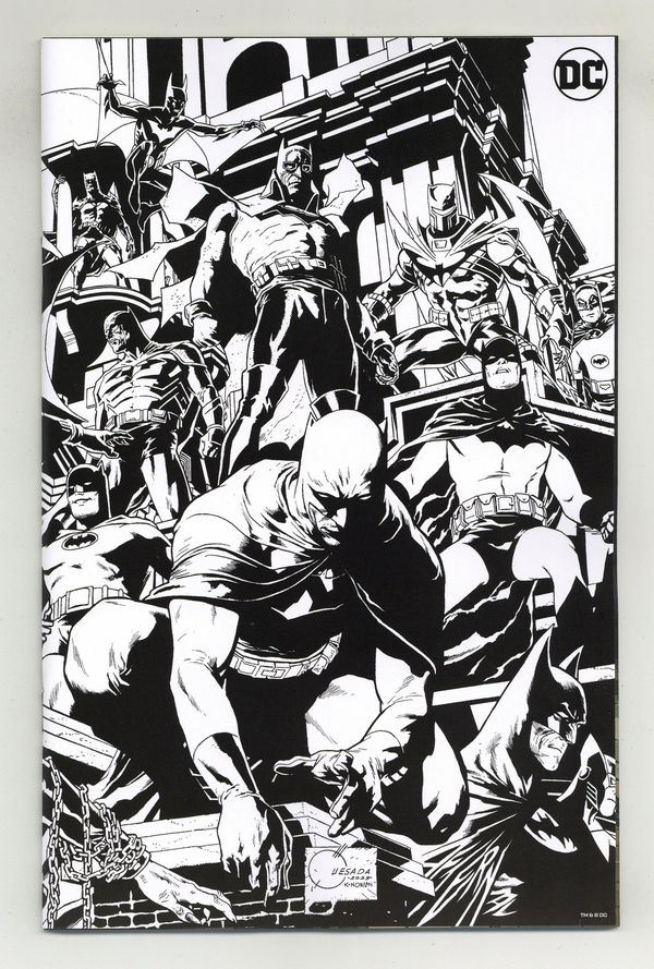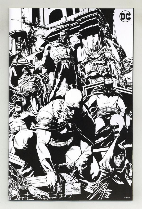 Tags: Batman, Dawn of DC (2023)$32.00Limited 1 for 100 Retailer Incentive Variant Cover. Written by Chip Zdarsky. Art by Jorge Jimenez - Mike Hawthorne - Adriano Di Benedetto. Cover by Joe Quesada. It's Batman versus Red Mask in a brutal Gotham that's never known hope! Can the Dark Knight overcome the terrifying infection that Red Mask has unleashed? Only one thing is certain: he won't be able to do it alone. The conclusion to the bestselling The Bat-Man of Gotham is so big it could only be contained in an oversize #900 anniversary issue featuring the return of fan-favorite artist Jorge Jimenez and a wild collection of guest stars! Full of wild revelations and a new path for Batman, this is one issue you won't want to miss! 56 pages, full color. Rated T+ Cover price $7.99.