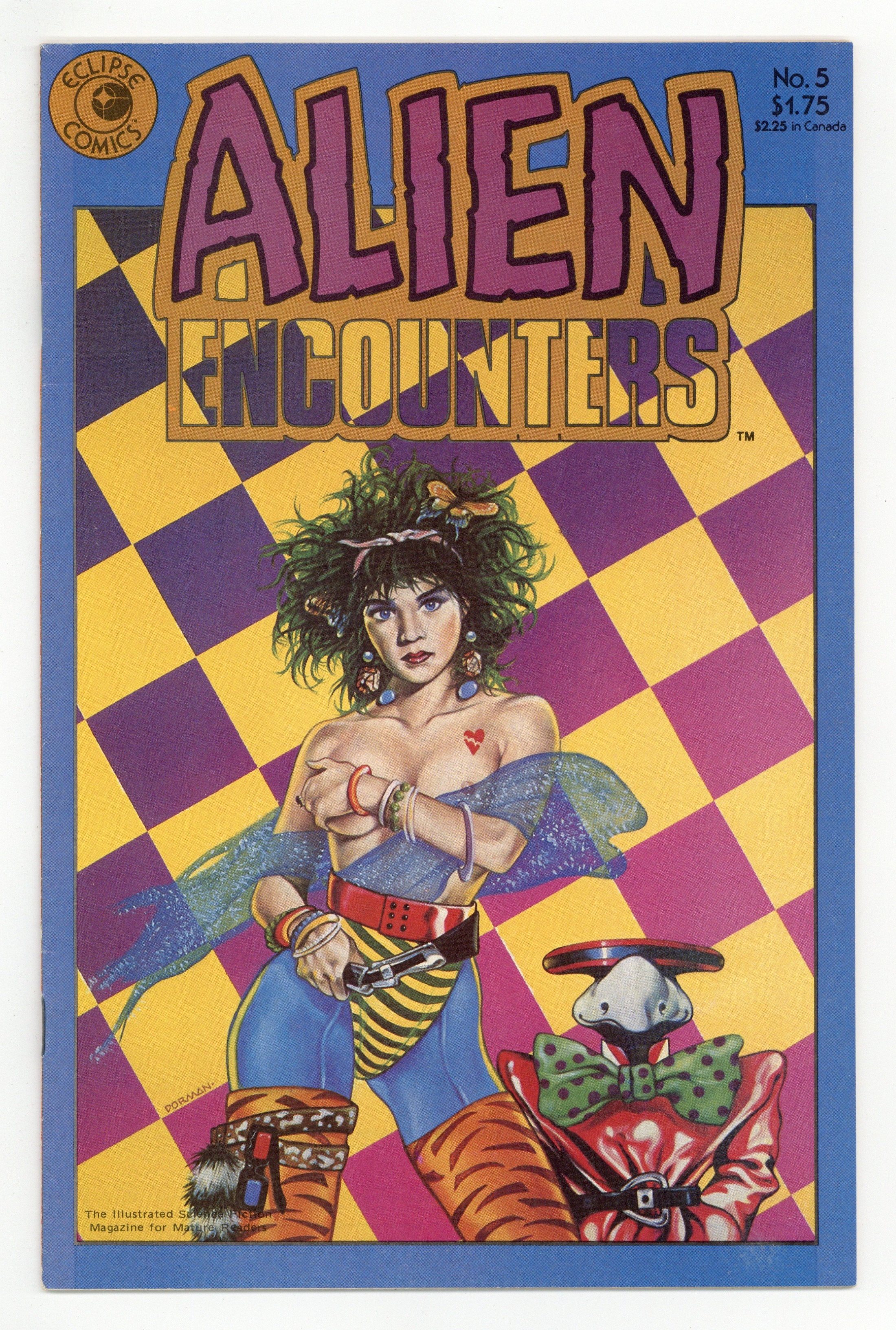 $24.00The illustrated science fiction magazine for mature readers. The value of friendship is discovered in "Night of the Monkey." Story by Simon Revelstroke, art by Richard Corben. Zoot returns to complicate Berlin's life in "Casa Blanco." Story & art by David Dorman, dialogue by Craig Boldman. A fantasy world gone awry when travelling in "Another Man's Shoes." Story by Tim Burgard, art by Chuck Beckum. A rescue attempt doesn't go as planned in "Journal of a Space Traveller." Story & art by David Lloyd. Cover by David Dorman. Cover price $1.75.