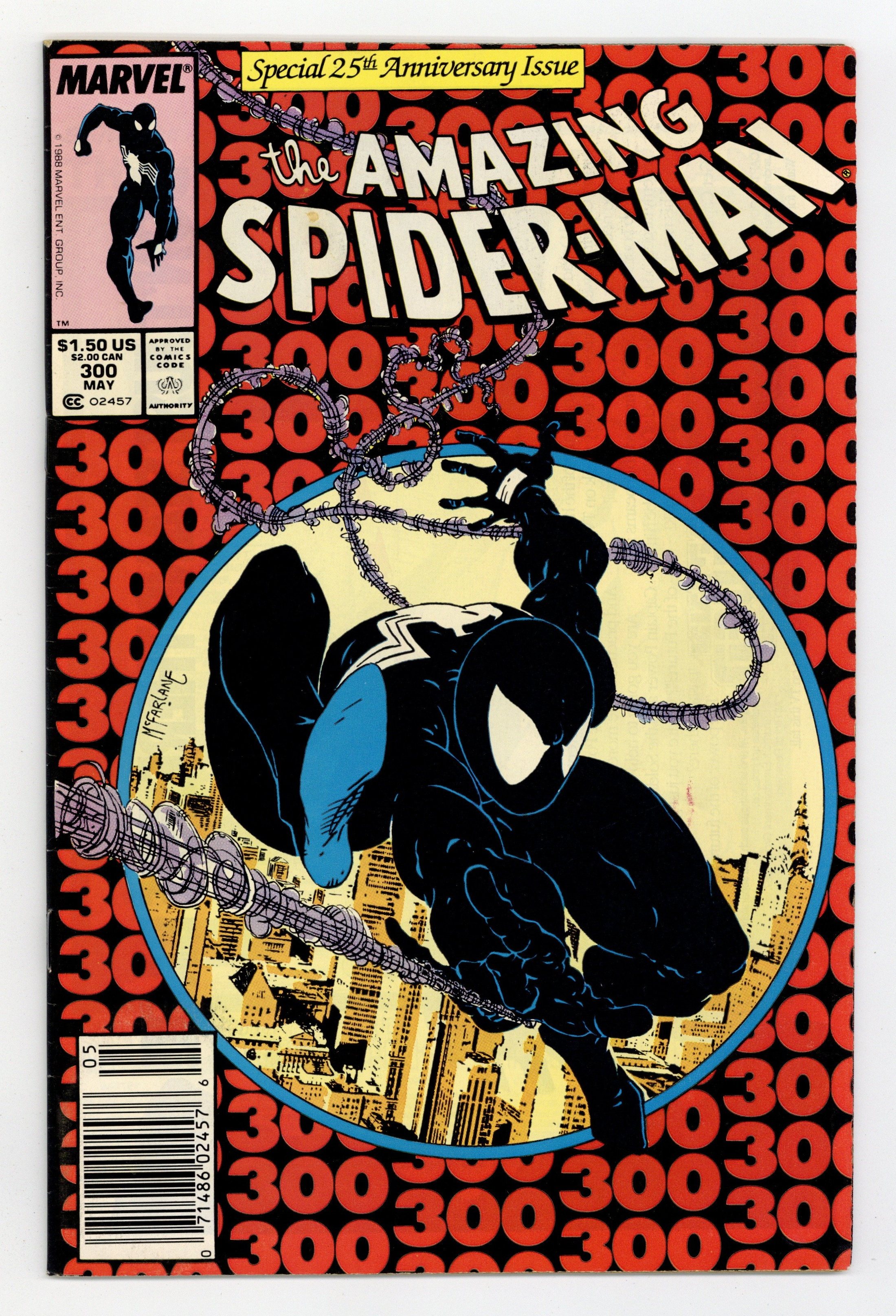 Newsstand Edition. Giant-sized 25th anniversary issue. First full appearance of Venom in "Venom!", script by David Michelinie, art by Todd McFarlane; Spidey's old alien costume has merged with reporter Eddie Brock who thinks his career was ruined by Spider-Man and the symbiote of the two, Venom, takes on the web slinger; At MJ's request, Spidey returns to the blue and red costume as she now finds his black duds way too creepy; This is the last issue in which Spider-Man appears in his black costume; Thing (of the Fantastic Four) cameo.. Stan's Soapbox Special in place of letters page: Full page editorial by Stan on the occasion of Spider-Man's 300th issue. 52 pgs., full color. Cover price $1.50.