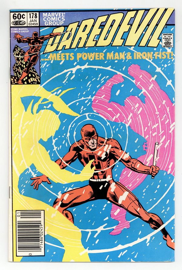 $9.00Newsstand Edition. "Paper Chase" Written by Frank Miller. Pencils by Frank Miller (breakdowns) and Klaus Janson (finished art), inks by Klaus Janson. Cover pencils by Frank Miller with inks by Klaus Janson. Foggy hires Power Man and Iron Fist to help protect the stooge who is going to help Nelson and Murdock link Mayoral candidate Cherryh to the Kingpin. Kingpin talks to Elektra about employment opportunities. Appearance by J. Jonah Jameson. Notes: Story continued in Power Man and Iron Fist #77. Promo Pin-Up for Power Man and Iron Fist #77 with art by Denys Cowan. First 60-cent issue. Cover price $0.60.