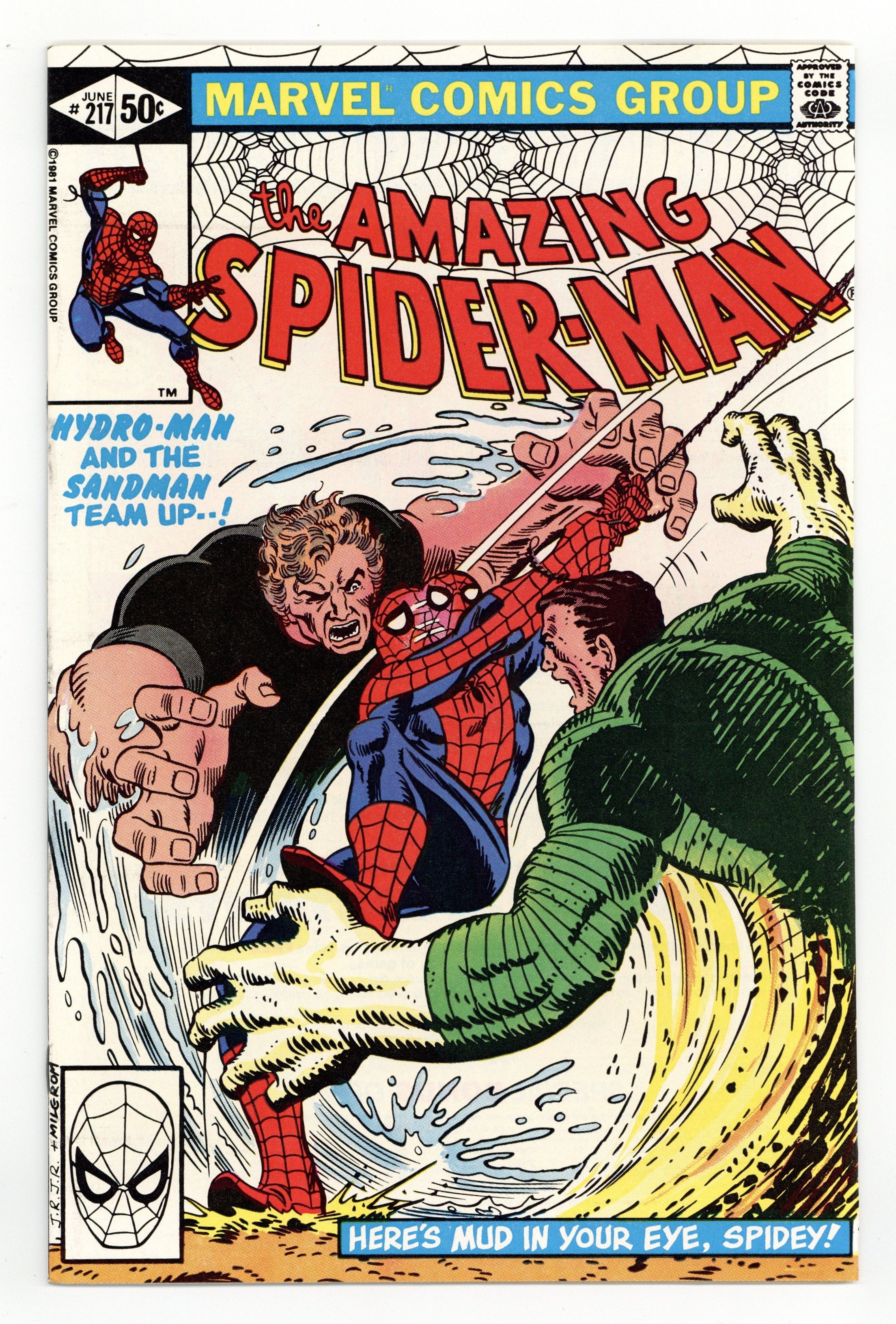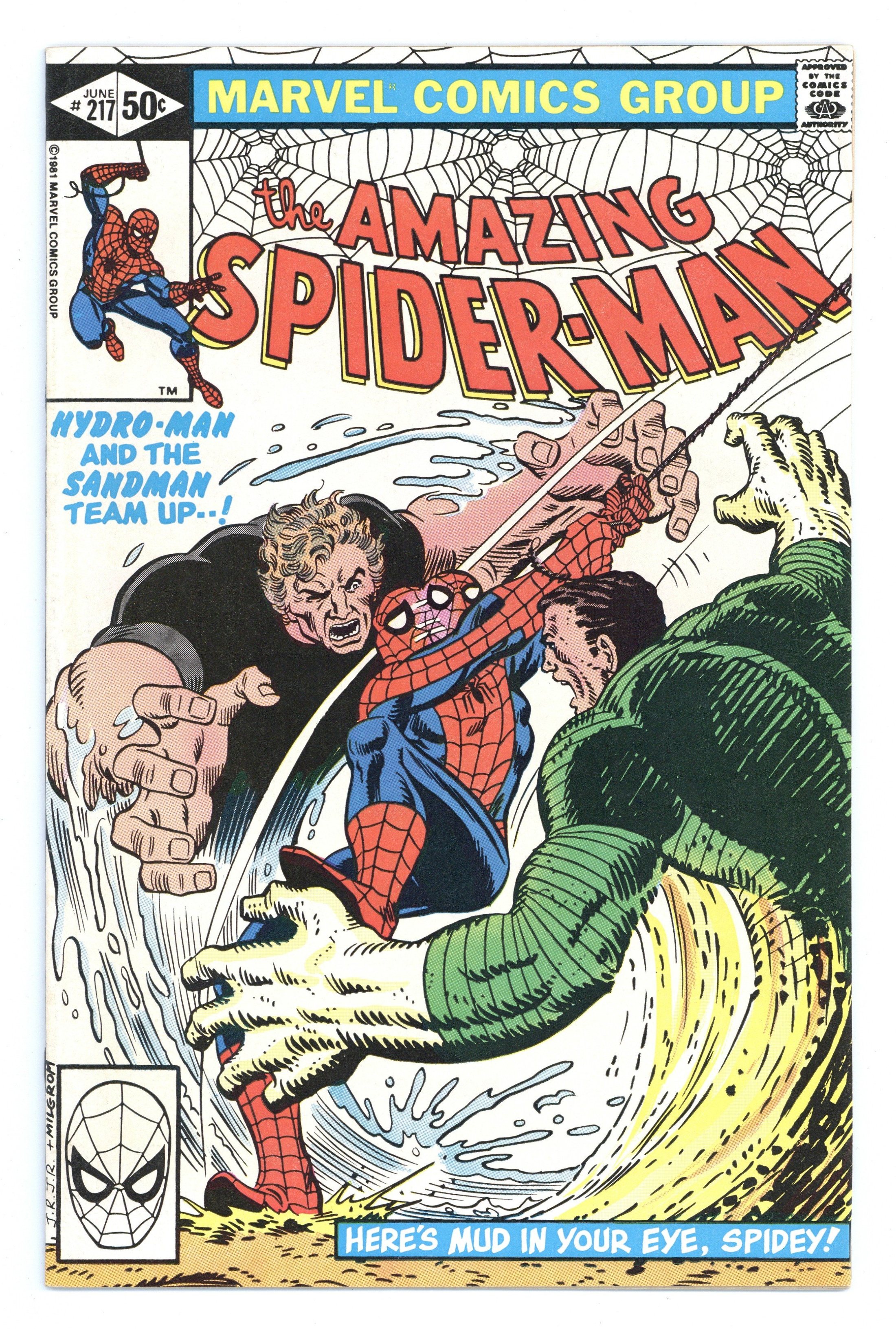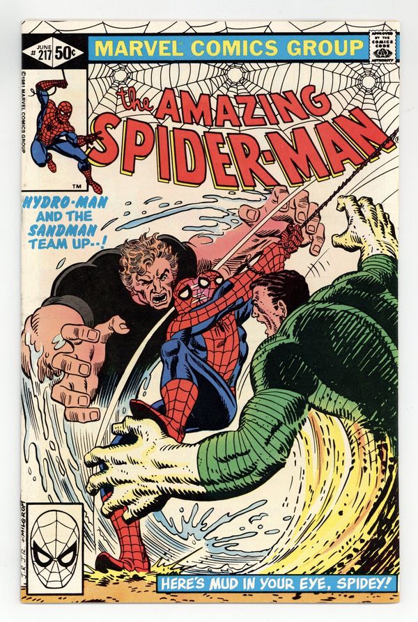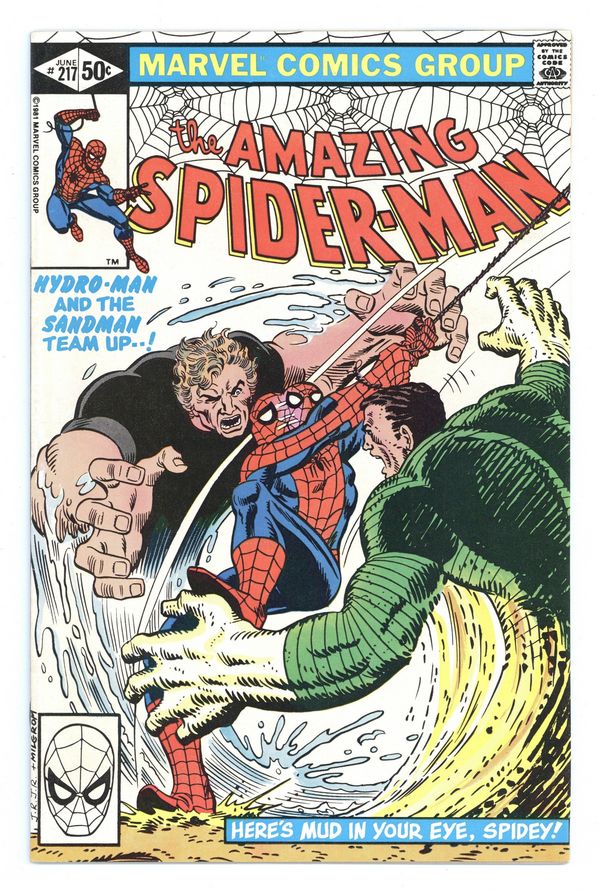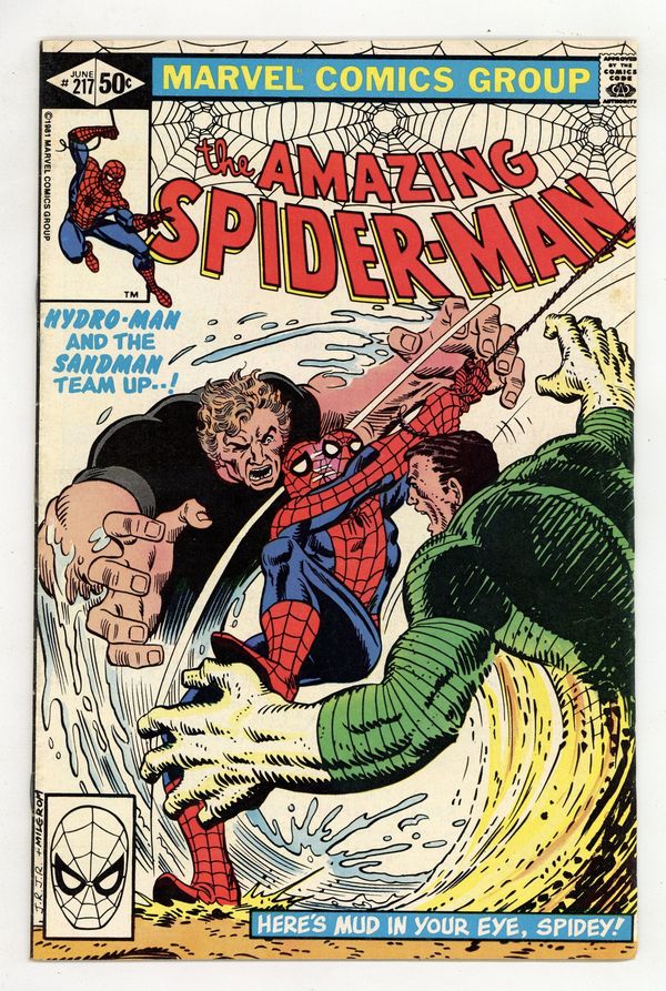 Direct Edition. "Here's Mud in Your Eye!" Part 1 of 2. Script by Denny O'Neil. Art by John Romita Jr. (breakdowns) and Jim Mooney (finishes). Cover by John Romita Jr. and Al Milgrom. At a shady west side bar, two super-villains bump into each other! The Sandman and Hydro-Man! Initially they fight one another over the affections of a sleazy barmaid, but eventually the duo decides to go after their mutual enemy...the wondrous wall-crawler! Typically sand and water is not a flammable mixture, but in this case, it could be a lethal combination for your friendly neighborhood Spider-Man! 36 pages. Cover price $0.50.