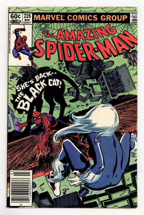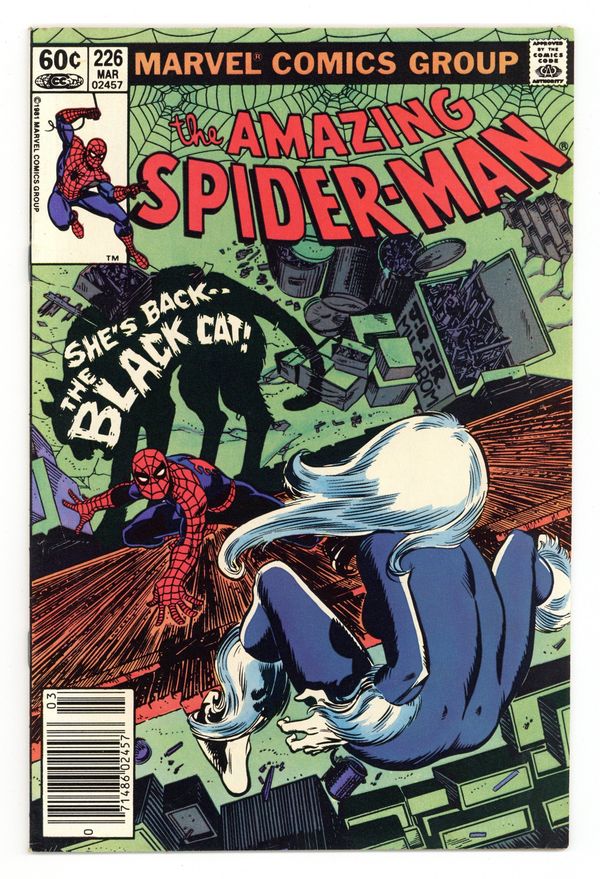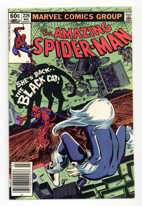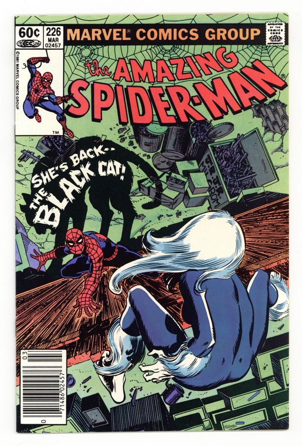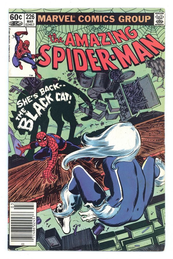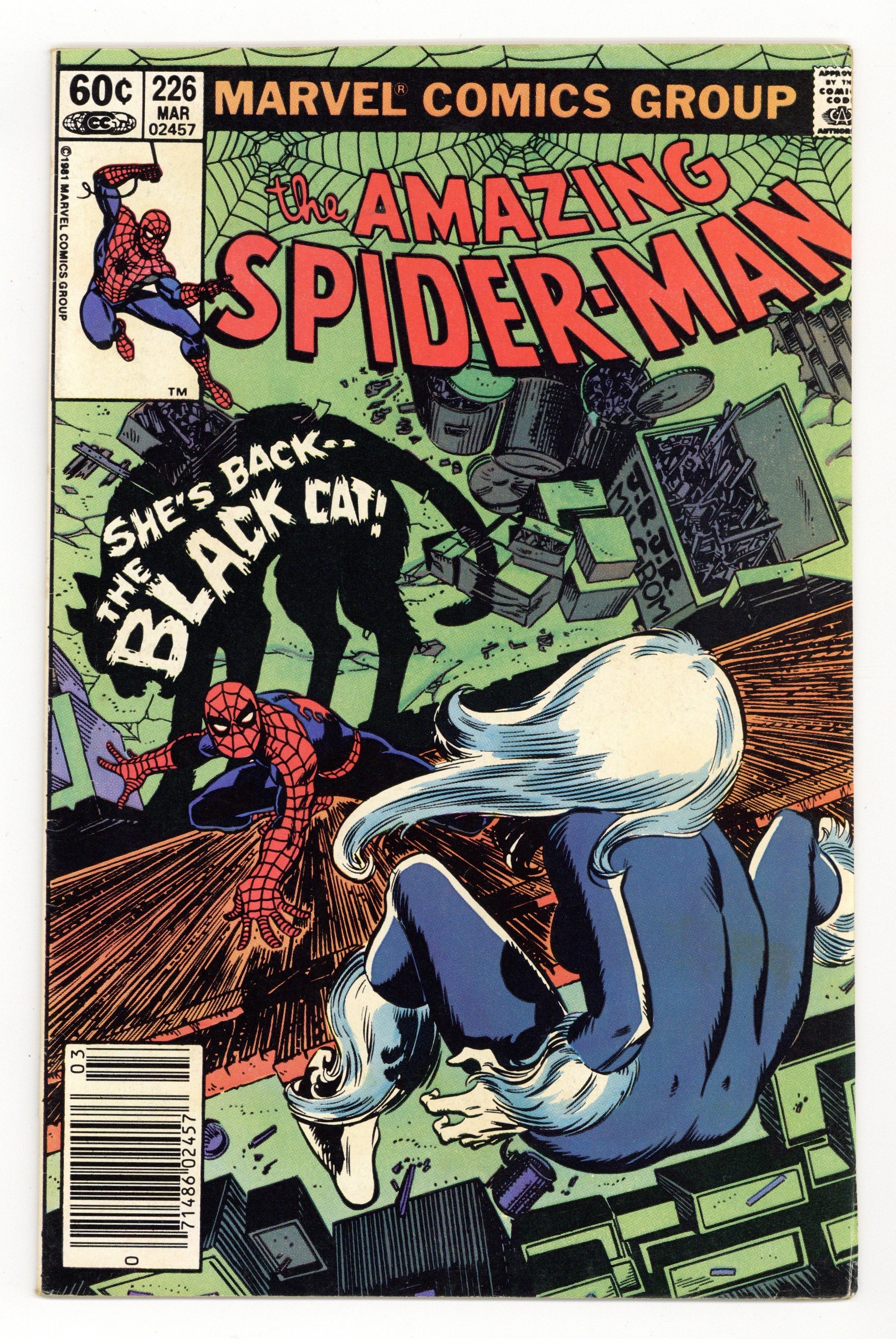 Tags: Spider-Man$30.00Newsstand Edition. "But the Cat Came Back" Part 1 of 2. Script by Roger Stern. Art by John Romita Jr. (breakdowns) and Jim Mooney (finishes). Cover by John Romita Jr. and Al Milgrom. Because the fans demanded her, the Black Cat is back! And flirting and fighting with the web-slinger all over again! After Felicia escapes from the psychiatric hospital, she resumes her high-dollar heists! But soon realizes that it's not as much fun without Spider-Man chasing her! So the cat burglar extraordinaire arranges an evening rendezvous with her favorite wall-crawler at their first date location (from Amazing Spider-Man 194). Will the enchanting cat mesmerize the Spectacular Spider-Man once more? Or can the web-slinger resist her feline charms? An excellent issue! Cameo appearances by the Foolkiller and Captain Jean DeWolff. (Notes: This was a highly anticipated issue for fans of the wall-crawler; and Stern & Romita Jr. did not disappoint. The Black Cat previously appeared in Amazing Spider-Man 205. This story was reprinted in Spider-Man Magazine 2 and also in the trade paperback: Spider-Man vs. the Black Cat (2005). The back cover features a full-page ad for Dungeons & Dragons with art by Bill Willingham.) 36 pgs. Cover price $0.60.