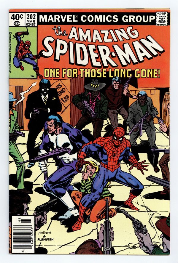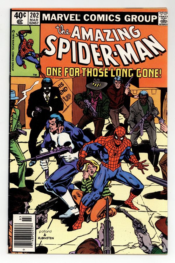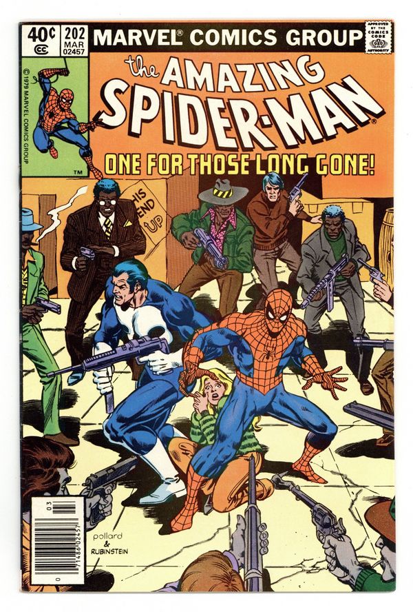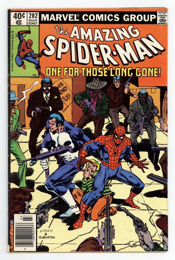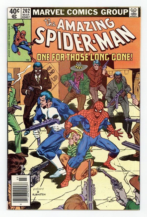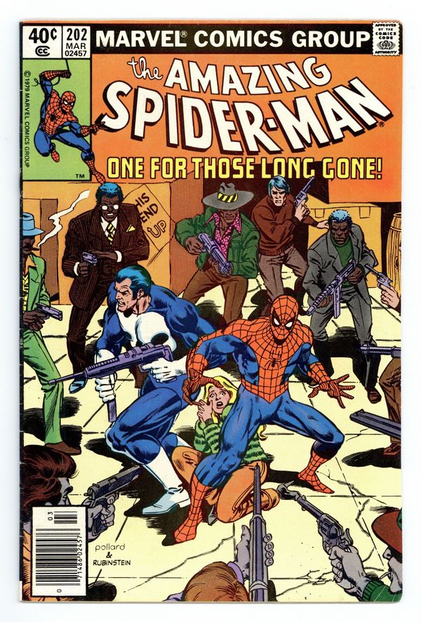 Newsstand Edition. "One for Those Long Gone!" Part 2 of 2. Guest-starring the Punisher. Script by Marv Wolfman. Art by Keith Pollard (breakdowns) and Jim Mooney (finishes). Cover by Keith Pollard and Joe Rubinstein. After surviving his nervous encounter with the Punisher, Peter Parker slips on his red and blue costume and joins the gun-toting vigilante's pursuit of the drug lords! Spider-Man wants to capture them. The Punisher wants to kill them. Something has got to give! Will the superhero or the anti-hero win the battle of wills? Cameo appearances by J. Jonah Jameson, Joe Robertson, and Dr. Jonas Harrow. (Notes: Spider-Man and the Punisher tangle again in Amazing Spider-Man Annual 15. This issue includes a sideways full-page ad featuring Batroc the Leaper promoting Crazy Magazine. This story was reprinted in Marvel Tales 219.) 36 pages Cover price $0.40.