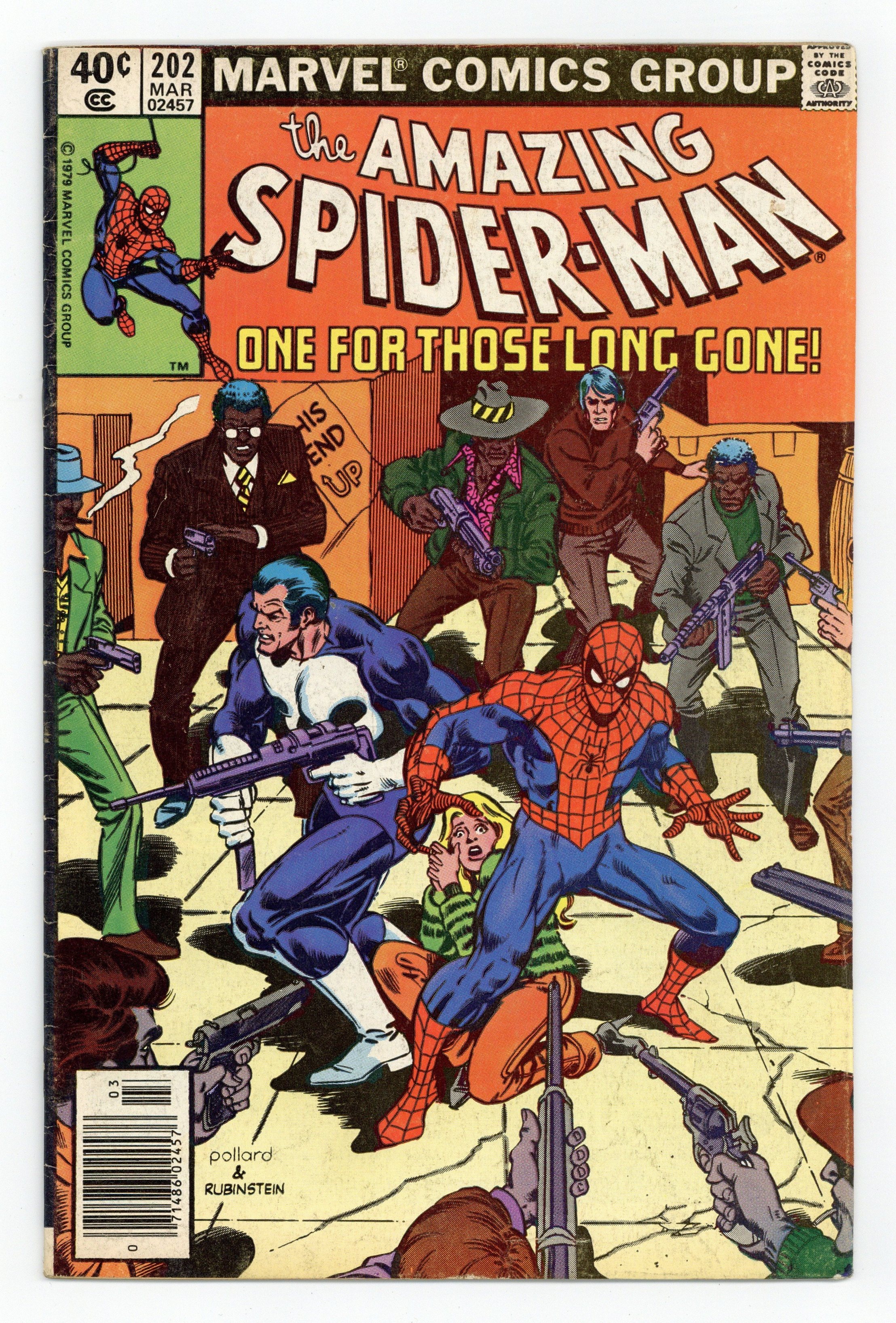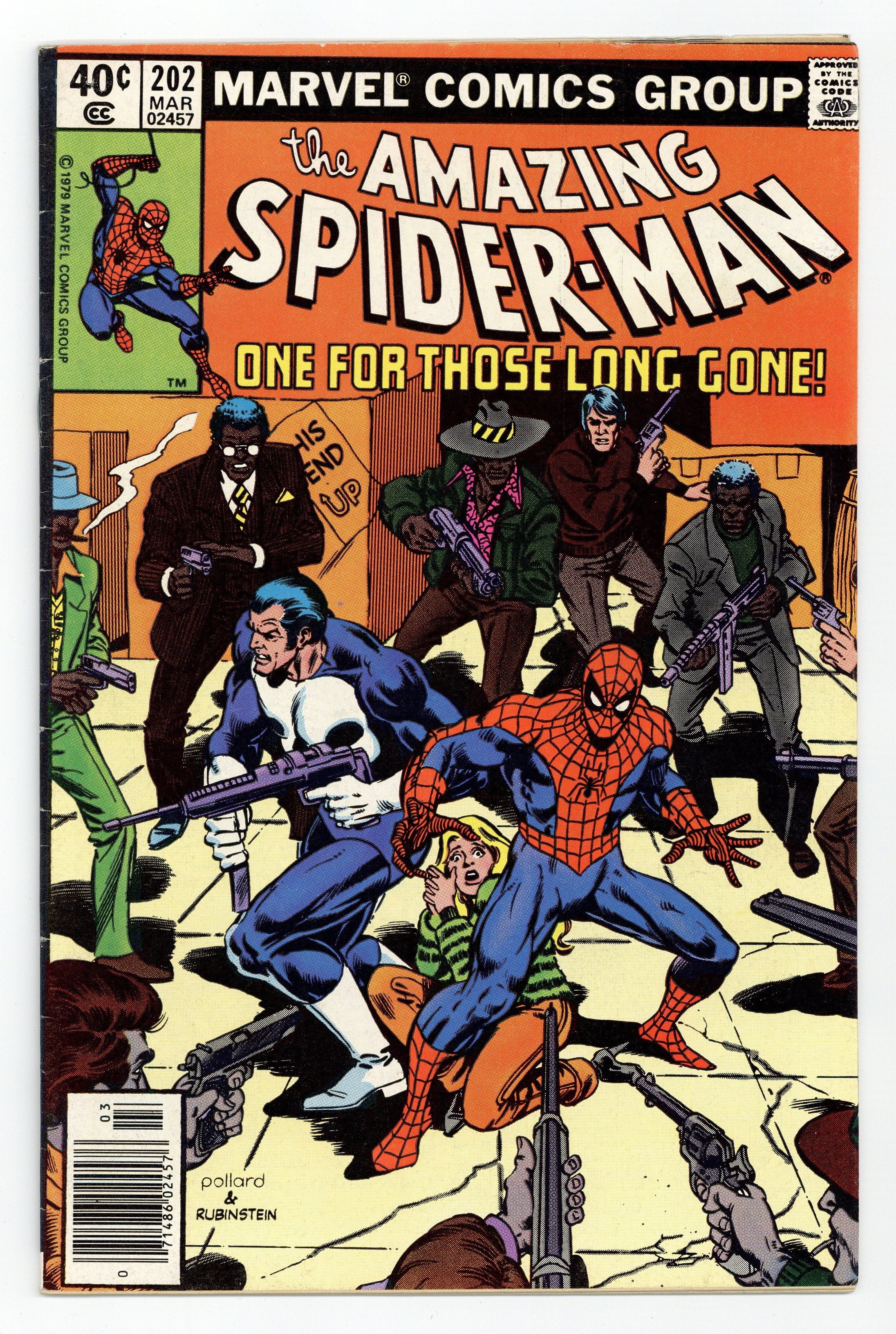 Tags: Spider-Man$23.50Newsstand Edition. "One for Those Long Gone!" Part 2 of 2. Guest-starring the Punisher. Script by Marv Wolfman. Art by Keith Pollard (breakdowns) and Jim Mooney (finishes). Cover by Keith Pollard and Joe Rubinstein. After surviving his nervous encounter with the Punisher, Peter Parker slips on his red and blue costume and joins the gun-toting vigilante's pursuit of the drug lords! Spider-Man wants to capture them. The Punisher wants to kill them. Something has got to give! Will the superhero or the anti-hero win the battle of wills? Cameo appearances by J. Jonah Jameson, Joe Robertson, and Dr. Jonas Harrow. (Notes: Spider-Man and the Punisher tangle again in Amazing Spider-Man Annual 15. This issue includes a sideways full-page ad featuring Batroc the Leaper promoting Crazy Magazine. This story was reprinted in Marvel Tales 219.) 36 pages Cover price $0.40.
