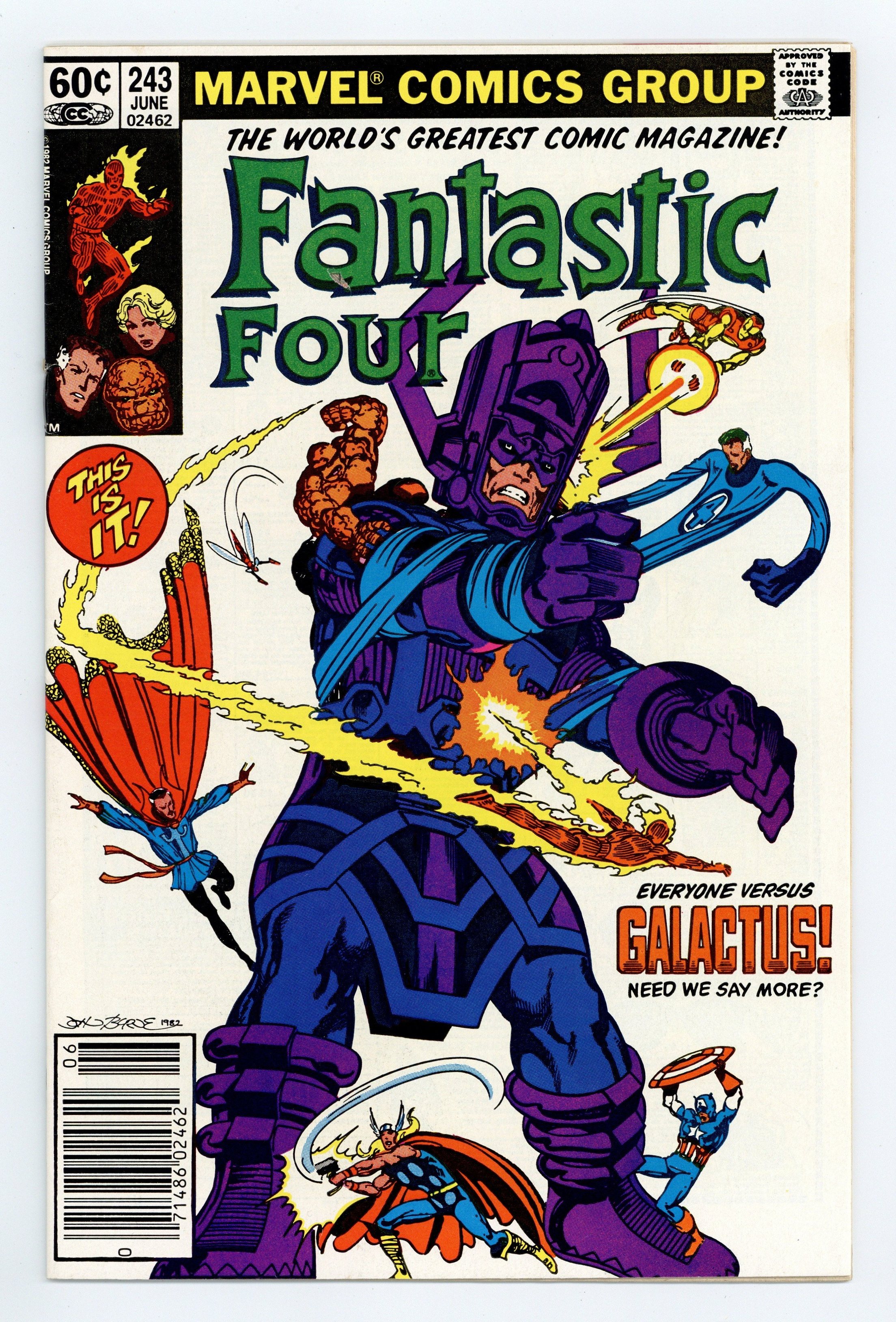 Newsstand Edition. "Shall Earth Endure?" Part 2 of 3. Script and Art by John Byrne. Cover by John Byrne. Guest-starring the Avengers and Doctor Strange. The situation has come down to this...the Fantastic Four, the thunder god, the golden avenger, the star-spangled avenger, the winsome Wasp, and the Master of the Mystic Arts vs. Galactus, the Devourer of Worlds...for the life of the Earth! Everything is on the line as the blockbuster battle rages on top of the World Trade Center! Will the 'Ravager of Worlds' finally add the Earth to his list of conquests, or can the greatest heroes on the planet do the impossible: defeat Galactus? Cameo appearances by Daredevil and Spider-Man. 36 pgs. Cover price $0.60.