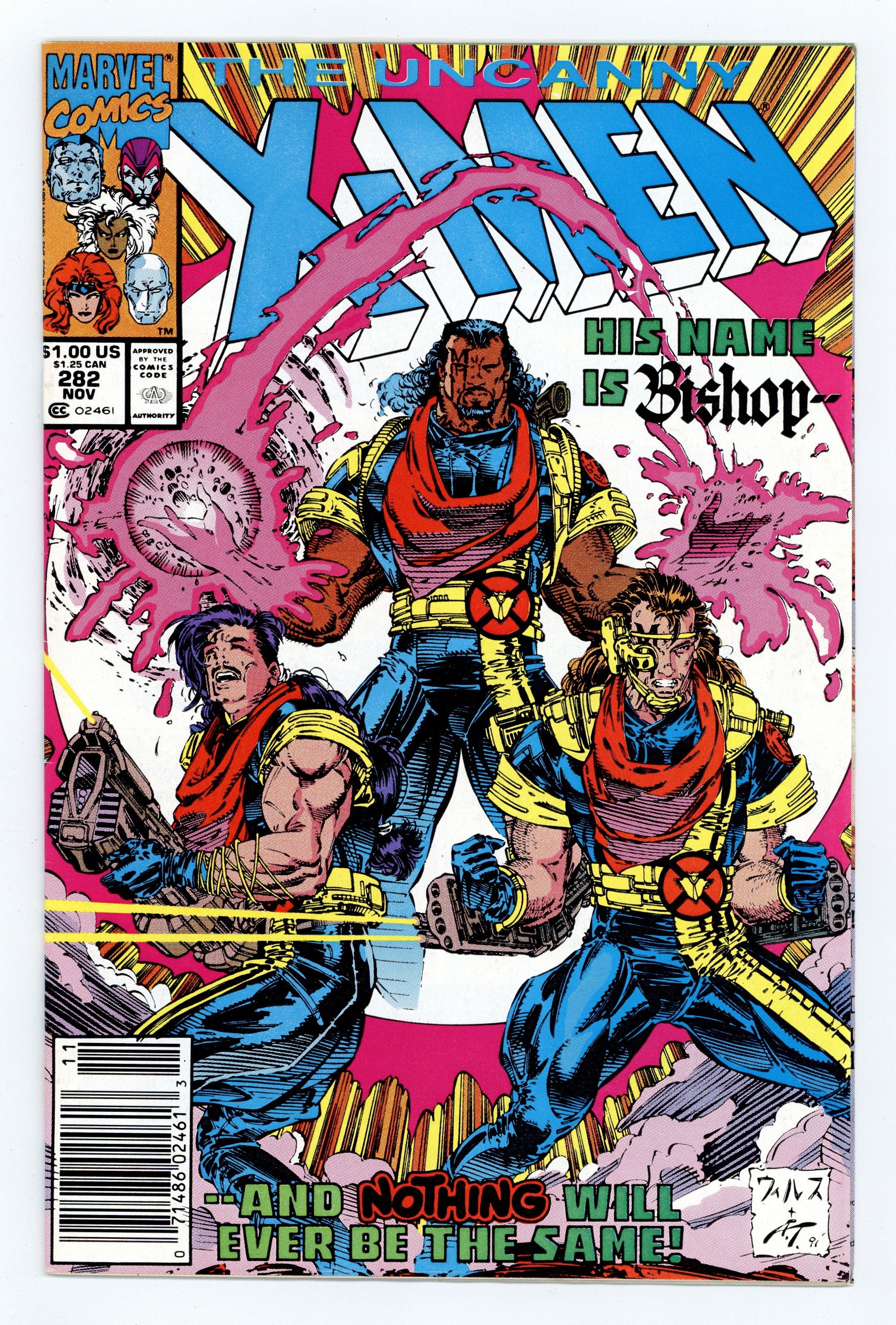 Newsstand Edition. "Payback!" Story by Whilce Portacio and John Byrne. Art by Whilce Portacio and Art Thibert. In one fell swoop the Upstarts have destroyed the Reavers and crippled the Hellfire Club. Next up, the Mutant Liberation Front. Who can stop these powerful new foes? Enter: Bishop! NOTE: 1st appearance of Bishop 40 pgs. Cover price $1.00.