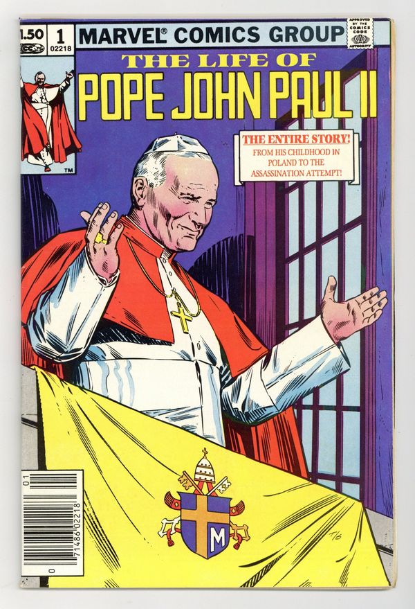 Newsstand Edition. Written by Steven Grant, plus an introduction by Cardinal Jose Saraiva Martins. Art and cover by John Tartaglione. Marvel commissioned this ad-free title, one of the earliest biographical comics from a mainstream publisher, shortly after the ordination of John Paul II. Father Mieczyslaw Malinski, a lifelong friend of the first non-Italian pope, and two Marvel staffers present the Popes life story, including his youth in Poland, his support of the Resistance during World War II, and the unsuccessful attempt on his life in 1981. 64 pages, Full Color. Cover price $1.50.