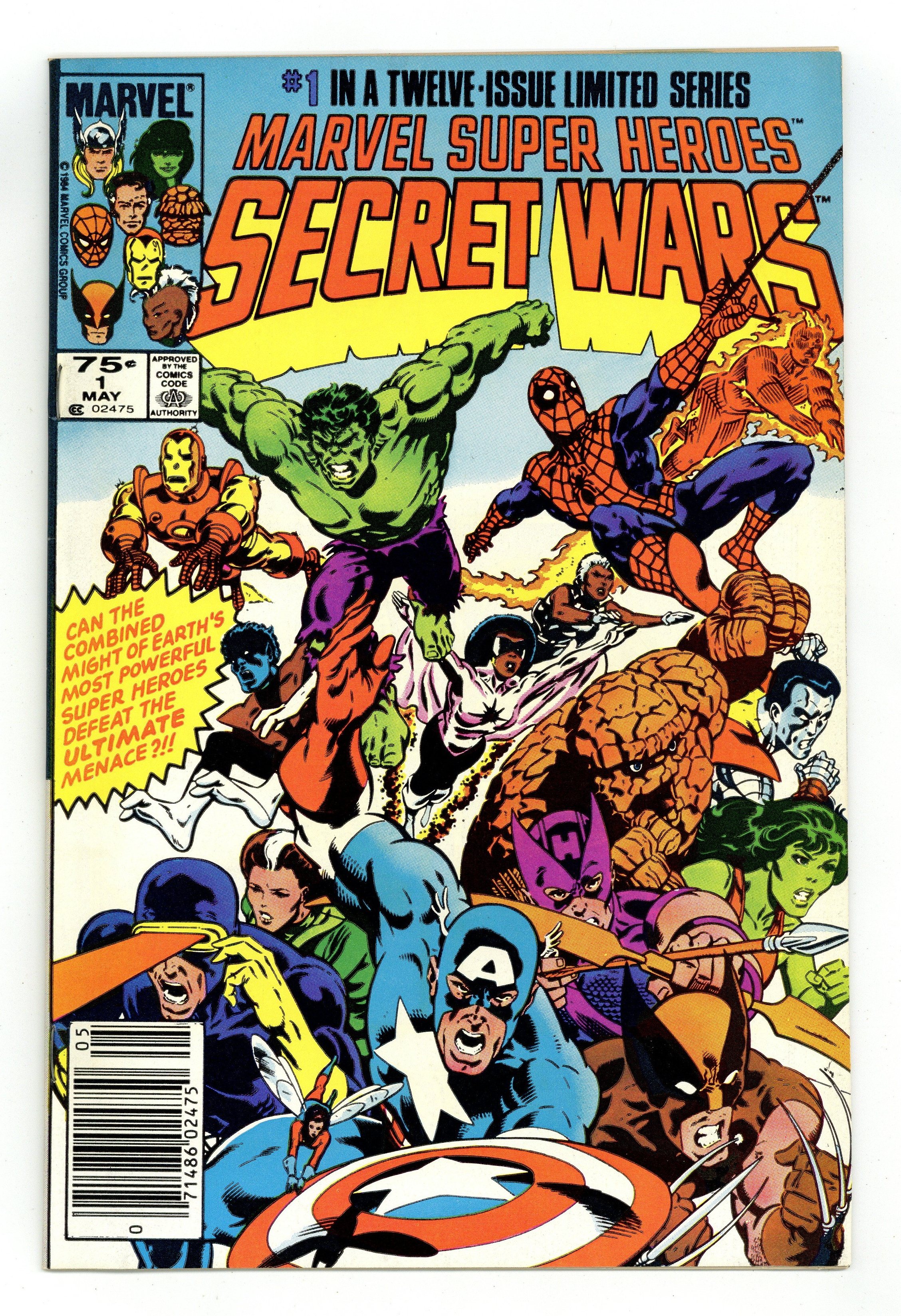 Newsstand Edition. "The War Begins!" Part 1 of 12. Story by Jim Shooter. Art by Mike Zeck and John Beatty. This is it, the granddaddy of all epic events. Before Identity Crisis, Infinite Crisis, House of M, Civil War, and Infinity Gauntlet there was Secret Wars. A nigh omnipotent being from beyond has, for lack of a better word, kidnapped the greatest heroes and deadliest villains in the Marvel Universe and whisked them to the far side of the universe to battle for the ultimate prize. One thing is for certain, the lives of these heroes and villains will never be the same again. - This is the first printing. Any 2nd printing will have the words "Second Printing" at the bottom of the first page. NOTE: Nearly all first printings contain a "Blue Galactus" from a printing error (a lack of magenta printing plates) that was corrected in later printings. While small number of First printings may have the correct colors, the majority of copies will have "Blue Galactus". Due to the frequency, "Blue Galactus" variants should be treated the same as other First Printings. 36 pages, full color. Cover price $0.75.