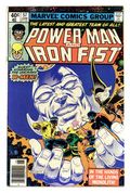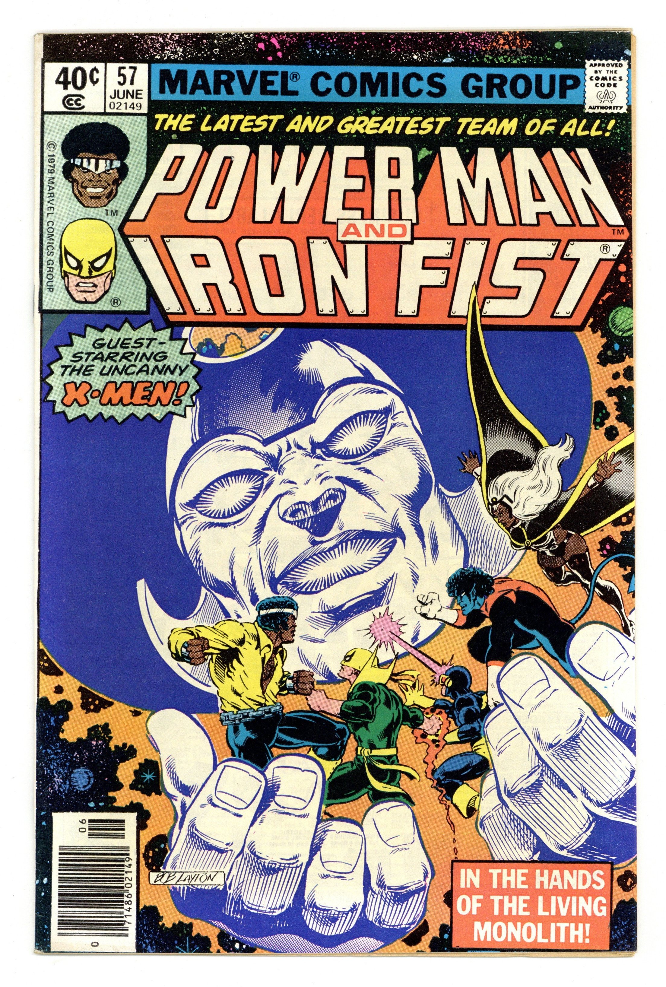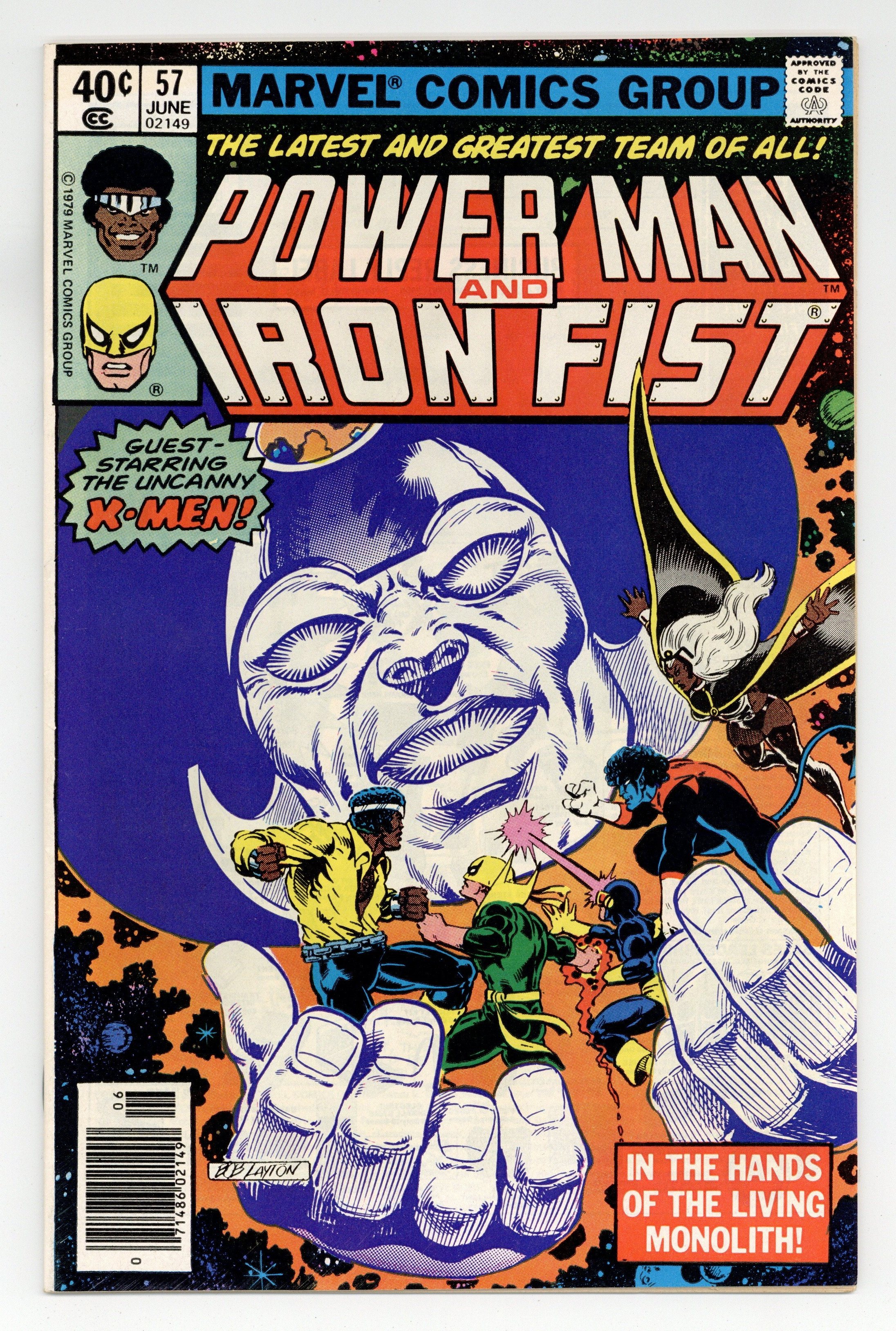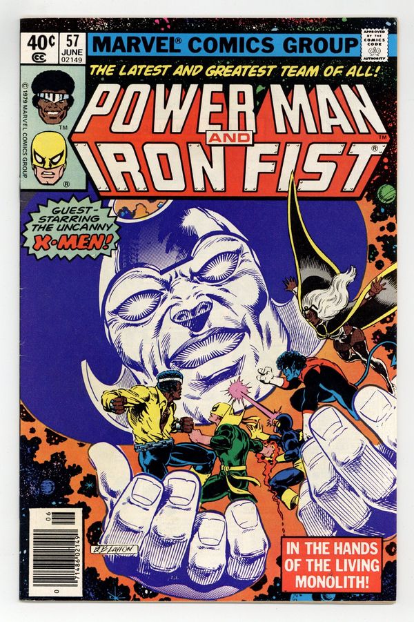 Newsstand Edition. "The Living Monolith!" Guest-starring the Uncanny X-Men. Story by Mary Jo Duffy. Art by Trevor Von Eeden and Frank Springer. Sure, Power Man is strong, and Iron Fist has very few rivals in the martial arts, but even the Heroes for Hire are as nothing next to the raw power of the Living Monolith. Luckily, they'll get some help from the Children of the Atom when they take on this titanic menace. 32 pages. Cover price $0.40.