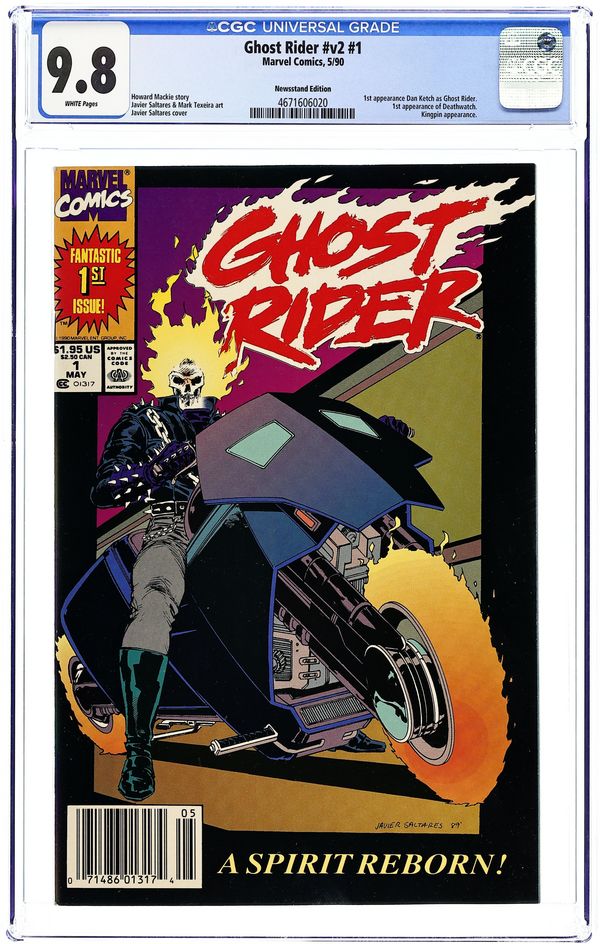 Newsstand Edition. "Life's Blood!" Written by Howard Mackie. Art by Javier Saltares and Mark Texeira. The Spirit of Vengeance returns! But who is this new Ghost Rider and what is his new mission. The House of Ideas redefines the supernatural for the 90s! Kingpin cameo. 32 pages, FC. NOTE: 1st appearance of Danny Ketch (Ghost Rider II) and 1st appearance of Deathwatch. Cover price $1.95.