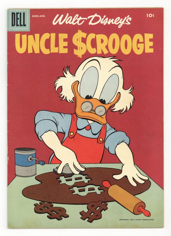 Published Jun 1956 by Dell/Gold Key/Whitman.$15.00No ads in book. Entire issue from cover to cover is comic stories and one page strips. Uncle Scrooge in "The Lost Crown of Genghis Khan" in which Scrooge, Donald and the nephews search for the treasure of Genghis Khan. Issue also has Scrooge in an untitled story, Gyro Gearloose in "Inventor of Anything" and a one-page text feature "The Mysterious Celebration." Stories by Carl Barks. 36 pages, full color. Cover price $0.10.