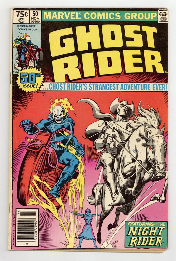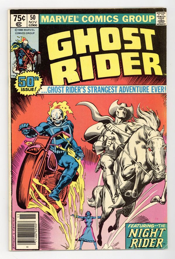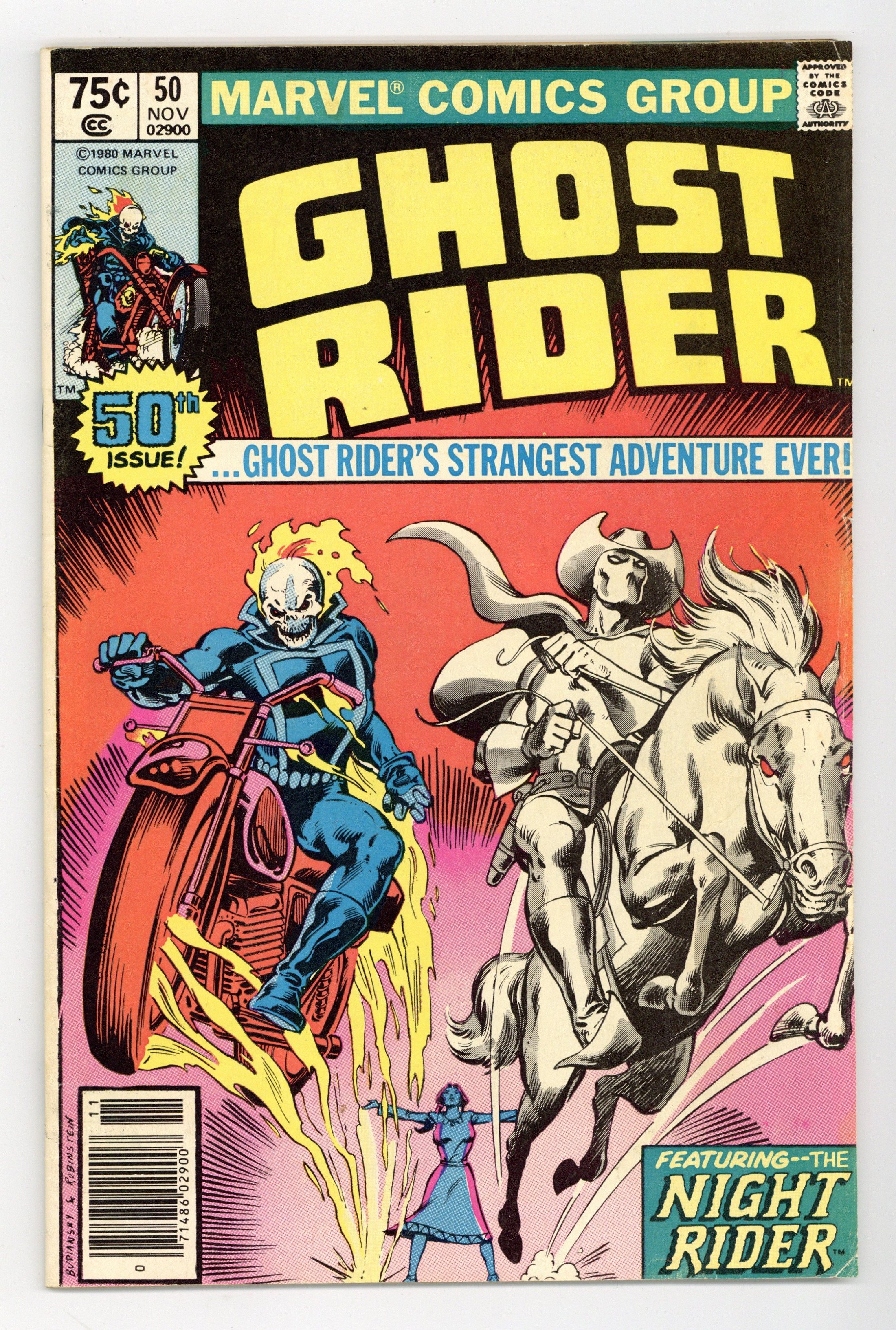 Newsstand Edition. Giant size 50th issue - "Manitou's Anger...Tarantula's Sting!" Guest-starring the Night Rider. Story by Michael Fleisher. Art by Don Perlin. Cover by Bob Budianski and Joe Rubenstein. Get ready for the most macabre team-up yet as the modern day Ghost Rider meets the Night Rider from the Ghost Rider of the Old West. 48 pages, FC. NOTE: Mr. Fantastic stars in Hostess ad "The Power of Gold!" Cover price $0.75.