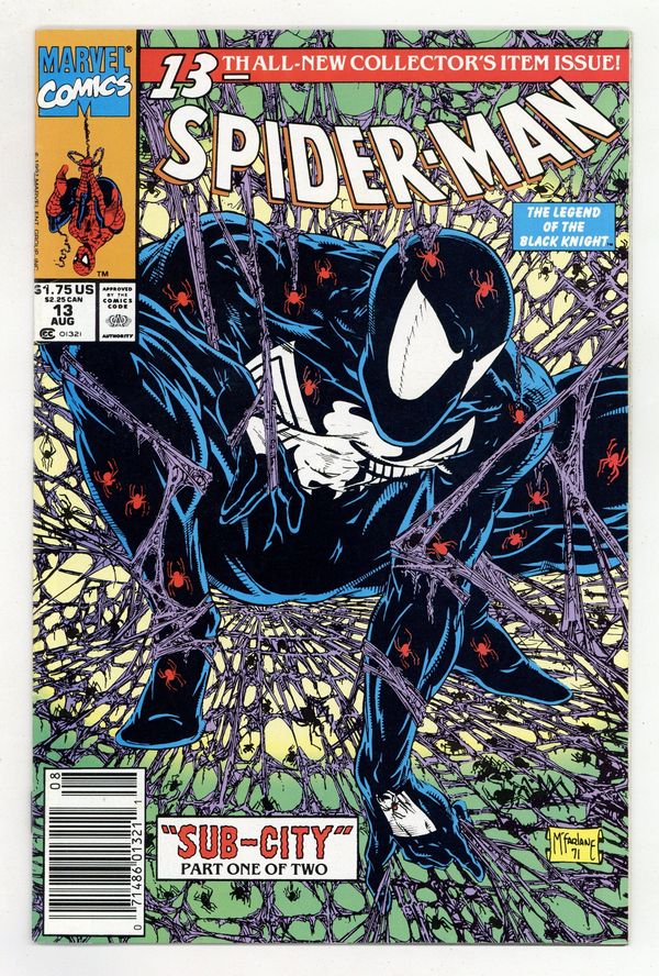Newsstand Edition. Sub-City: Part 1 of 2. Story, art and cover by Todd McFarlane. To investigate mysterious disappearances, Spidey dons his old black and white suit and enters the macabre world of "Sub-City." The horror of his situation becomes most apparent when Spider-Man come face-to-face with the leader of the underground dwellers - Morbius the Living Vampire! Cover price $1.75.