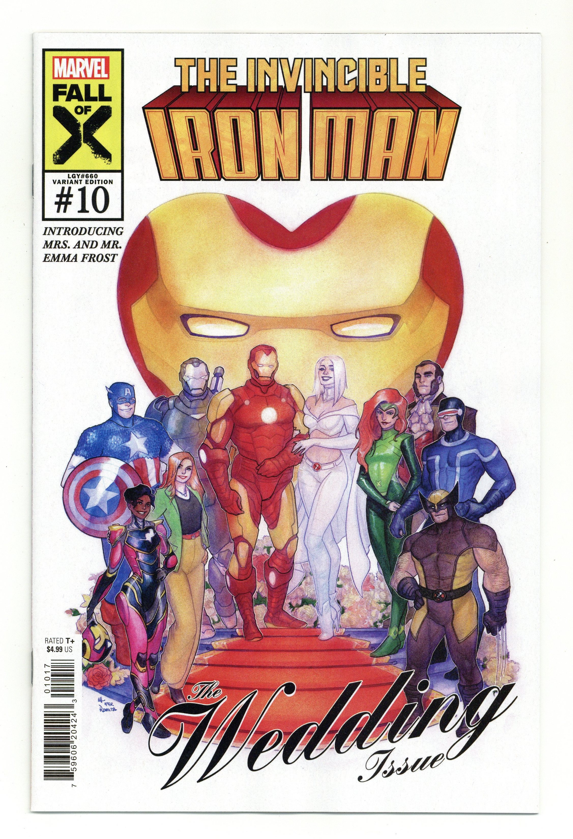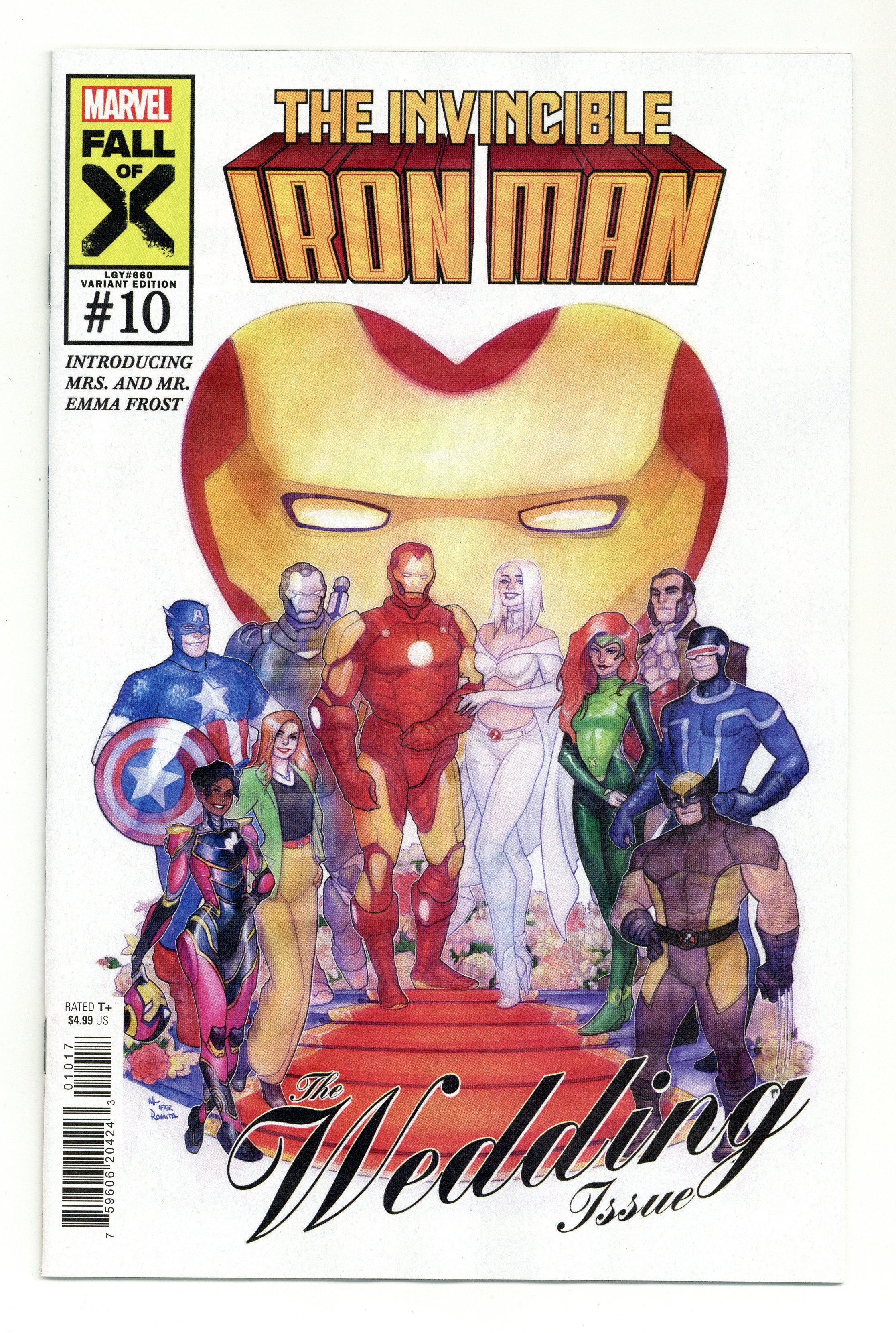 Limited 1 for 50 Retailer Incentive Variant Cover. Written by Gerry Duggan. Art by Juan Frigeri. Cover by Meghan Hetrick. You are cordially invited to the wedding of Anthony Edward Stark and Emma Grace Frost…Come join the lucky couple as they exchange vows. Attire is Hellfire formal. Orchis raid to follow. Plus some exclusive wedding extras! 36 pages, full color. Rated T+ Cover price $4.99.