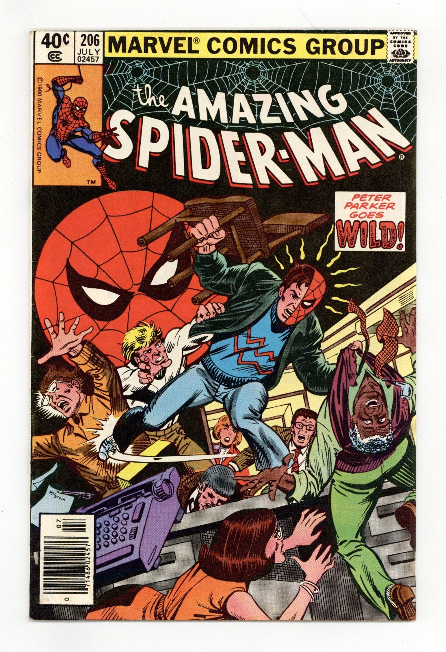 Newsstand Edition. "A Method in His Madness!" Script by Roger Stern. Art by John Byrne (breakdowns) and Gene Day (finishes). Cover by Al Milgrom. For the past few weeks, the devious Dr. Jonas Harrow has tormented J. Jonah Jameson with his Mental Attitude Response Variator (MARV) ray! And after forcing the Daily Bugle's publisher to have a nervous breakdown, the twisted doctor turns his attention to the city editor: Joe Robertson! While blasting Robbie (from afar) with the MARV ray, Dr. Harrow decides to radiate the entire Bugle city room! But the mad scientist is not aware that Spider-Man's alter-ego has stopped by for a visit! One thing leads to another...and the web-slinger, Jonah, and Jonas rendezvous for a meeting of the minds! May the craziest man win! (Note: This is one of only three issues John Byrne penciled for the Amazing Spider-Man title (1st series): issues 189, 190, and 206.) 36 pgs. Cover price $0.40.