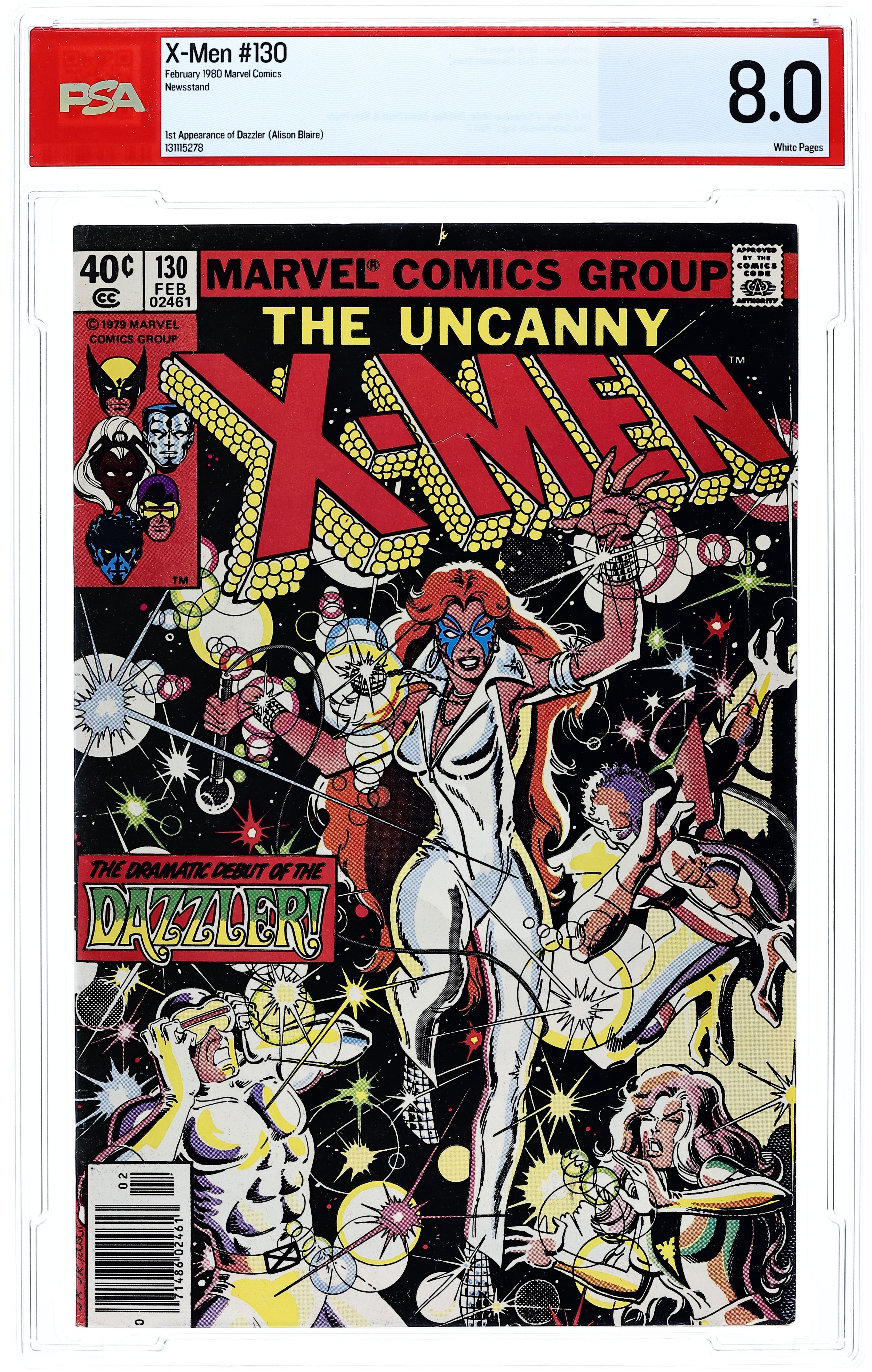 Newsstand Edition. The Dark Phoenix Saga: Part 2 of 9 - "Dazzler!" Story by Chris Claremont and John Byrne. Art by John Byrne and Terry Austin. Wolverine, Colossus, and Storm have been taken captive by the sultry and dangerous White Queen, but for what purpose. Only the young new mutant Kitty Pryde can warn the rest of the team, but will she be in time to save her new friends? Meanwhile, Cyclops and Phoenix encounter another "new mutant" called Dazzler. Plus, Jason Wyngarde continues his mental seduction of Jean Grey. NOTE: 1st appearance of Dazzler. Cover price $0.40.