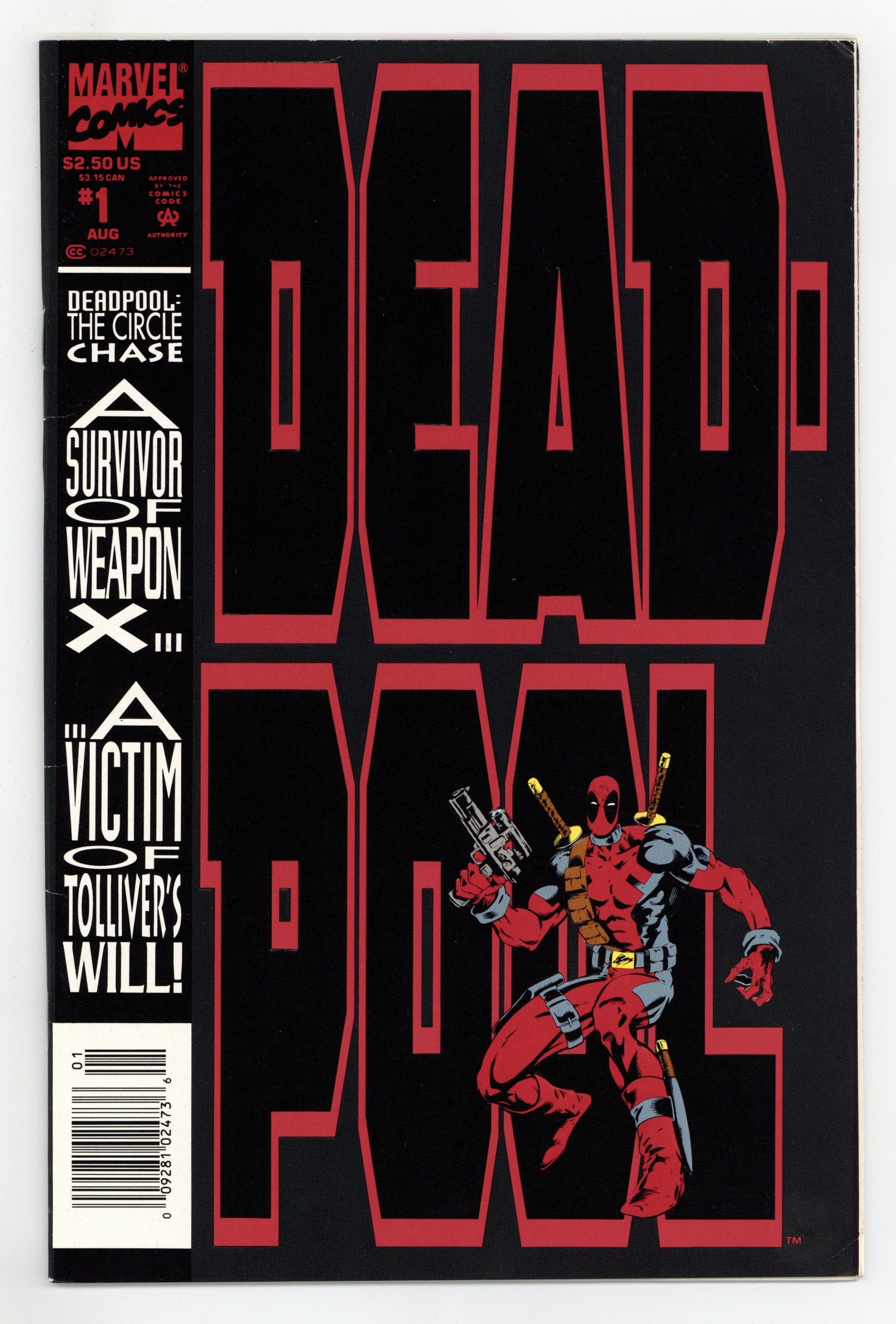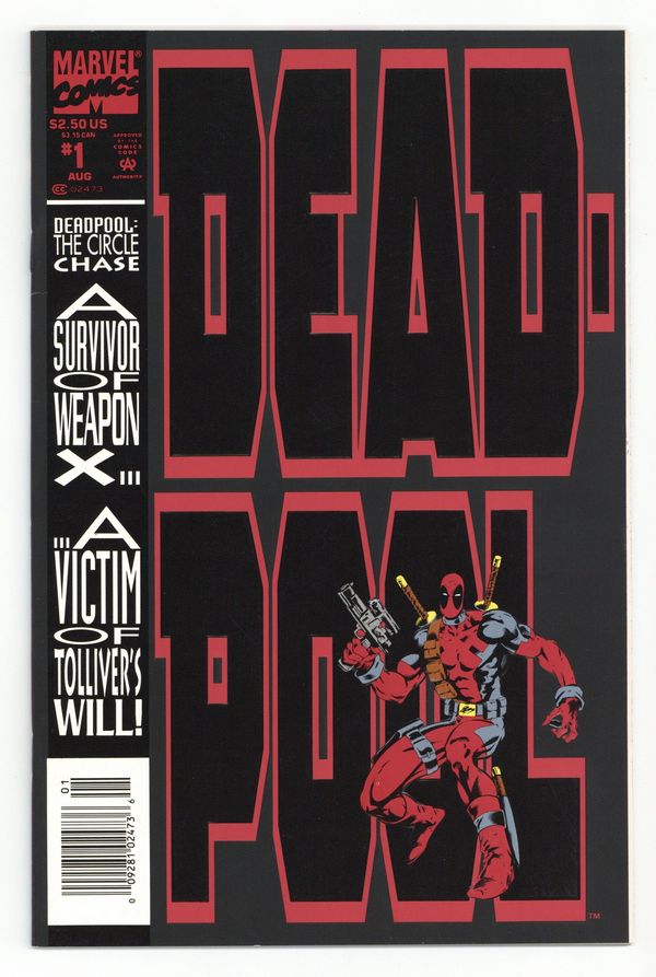 Newsstand Edition. The Circle Chase Round 1: Ducks in a Row - Written by Fabian Nicieza. Art and Cover by Joe Madureira and Mark Farmer. Sporting an outrageous cover -- an embossed figure of Deadpool is positioned leaning against a full cover sized embossed logo. This series pits Deadpool against Juggernaut, Black Tom Cassidy, Nyko and a wicked new villain, Slayback! 32 pages, full color. Cover price $2.50.