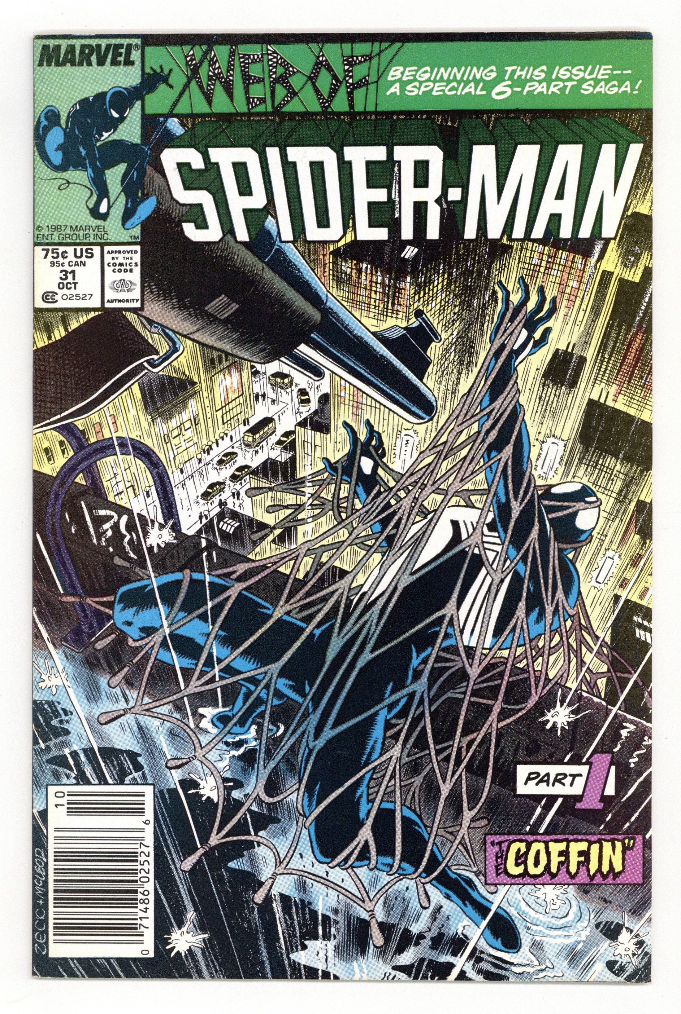 Newsstand Edition. Kraven's Last Hunt - Part 1 of 6 - "The Coffin" Story by J. M. DeMatteis. Art by Mike Zeck and Bob McLeod. This is the first issue of the Kraven's Last Hunt storyline. A deranged Kraven begins his final quest to exterminate Spider-Man. He ambushes the web-slinger and successfully captures him. Now it appears that a comatose Spider-Man has been buried alive. The situation does not look good. Story continues in Amazing Spiderman 293. 32 pages Cover price $0.75.