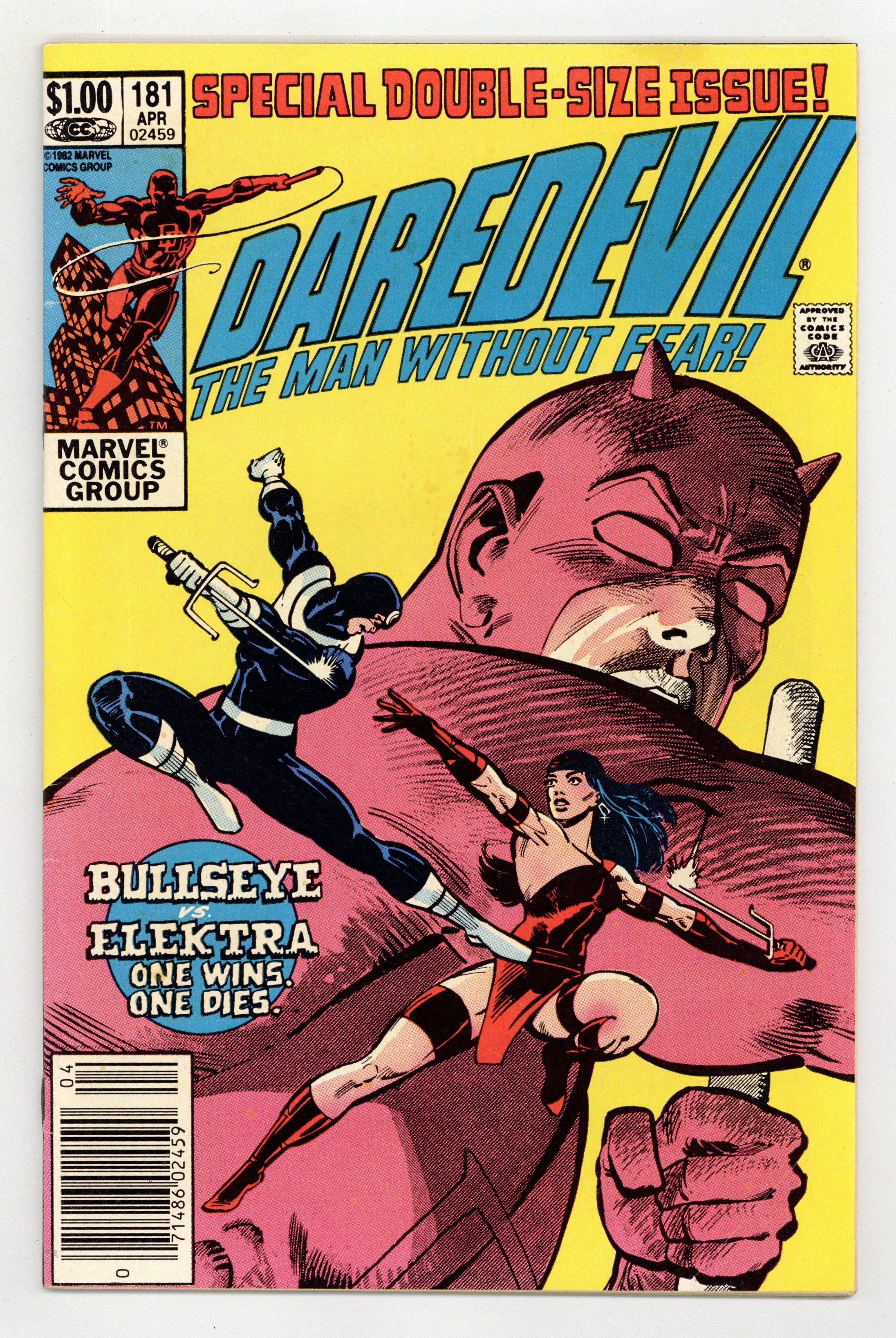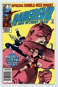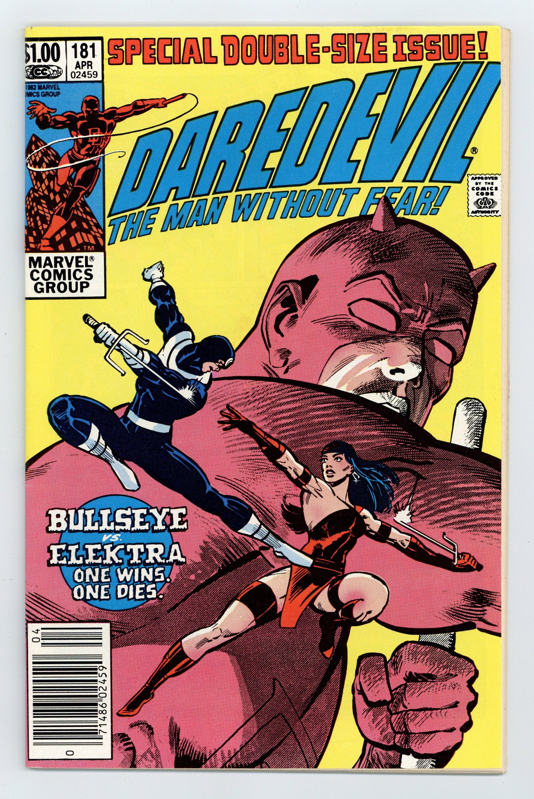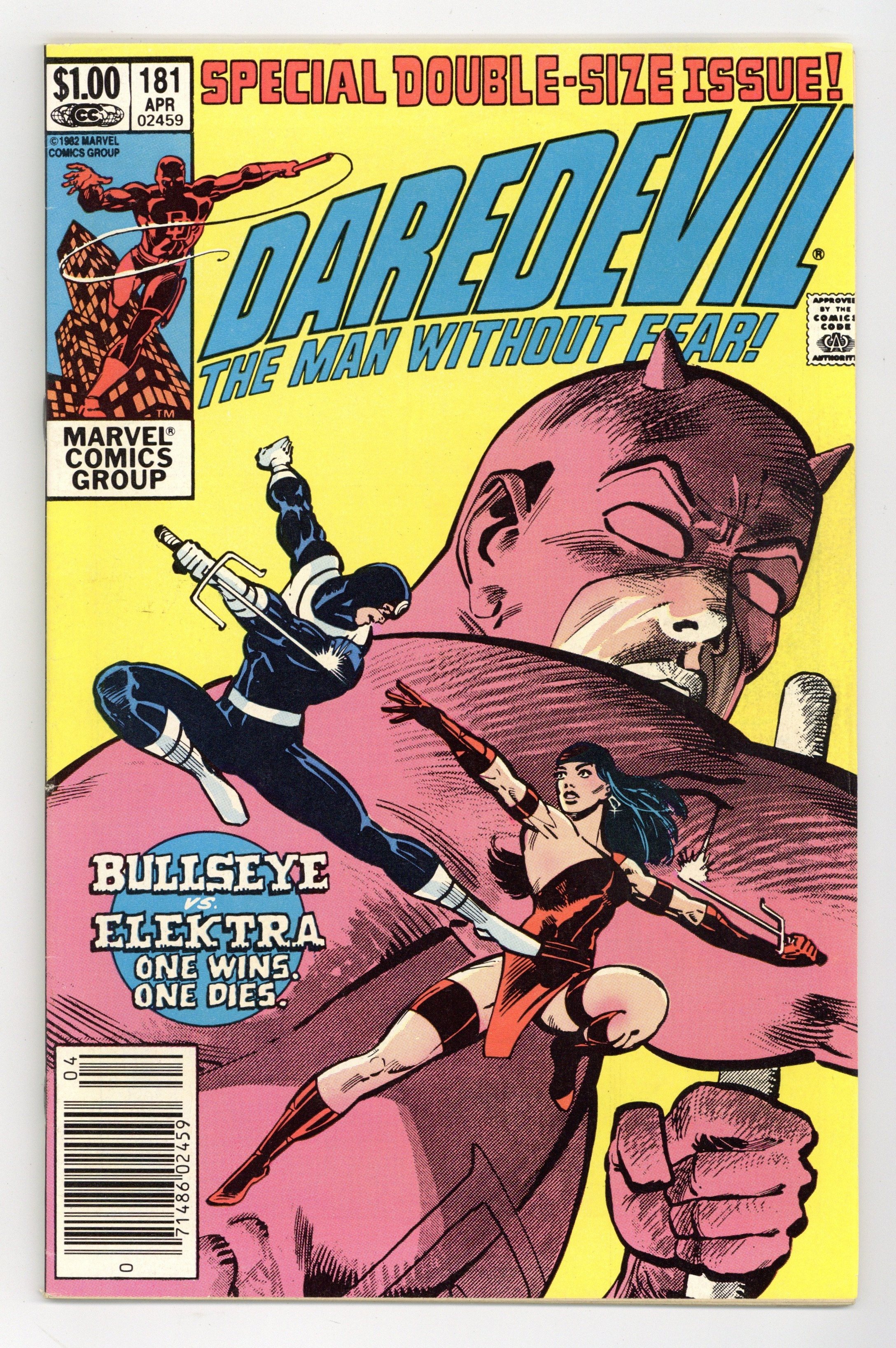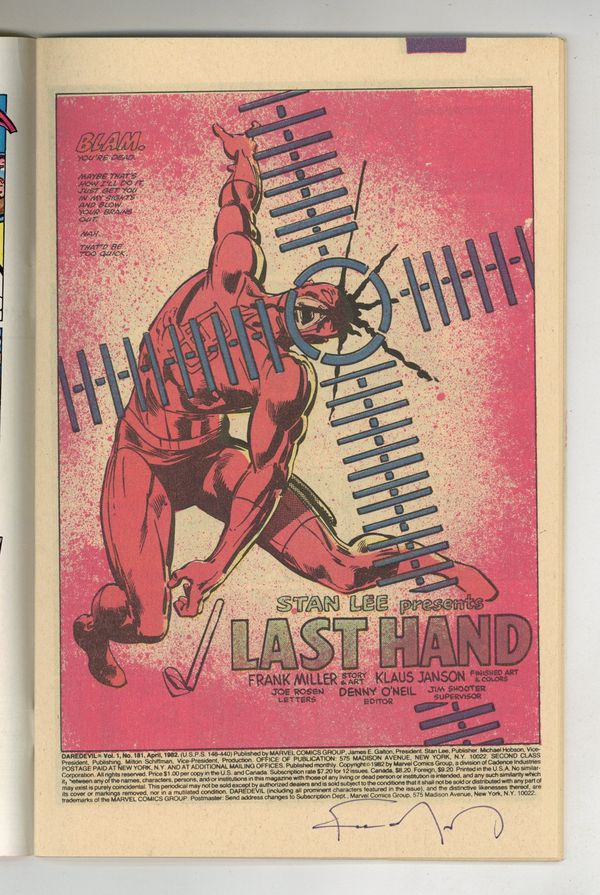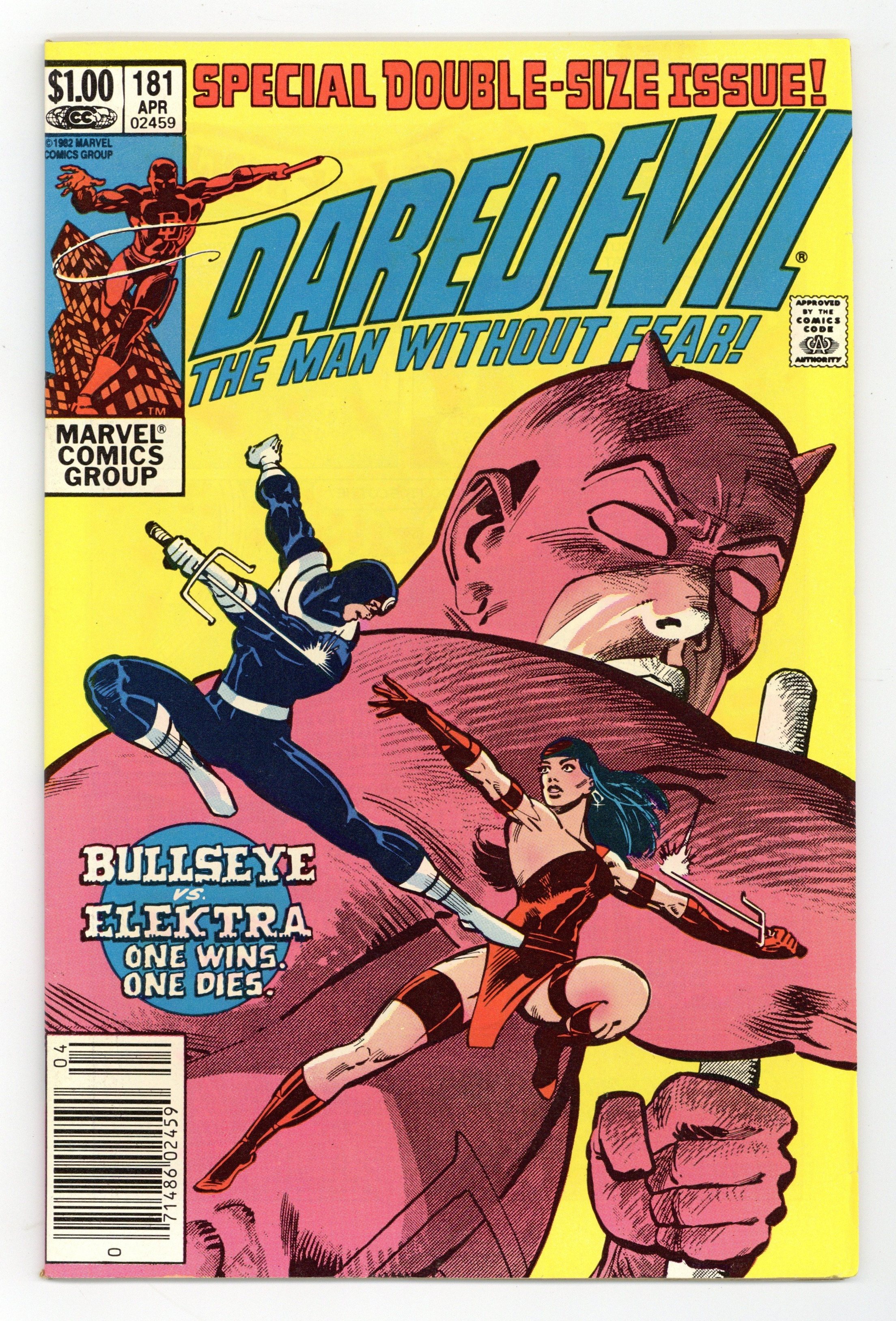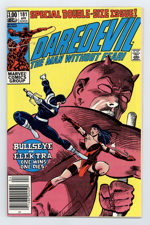 Newsstand Edition. Cover pencils by Frank Miller, inks by Klaus Janson. Last Hand, script by Frank Miller, pencils by Frank Miller (breakdowns) and Klaus Janson (finished art), inks by Klaus Janson; Bullseye breaks out of prison; Elektra hunts down Foggy and is about to kill him until she recognizes him as Matt's buddy from college; Bullseye fights Elektra and kills her with her own sai; DD goes after Bullseye and ends up dropping him from a great height, breaking every bone in his body; Kingpin appearance; story narrated by Bullseye; story dedicated to the memory of Wally Wood 1927-1981. Full page pin-up ad for Marvel Fanfare, art by Michael Golden. Statement of Ownership average # of copies in preceding 12 months: 276,812. 36 pgs. Cover price $1.00.