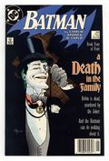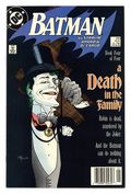 First printing. Newsstand Edition. Cover art by Mike Mignola. "A Death in the Family" part 4 of 4, script by Jim Starlin, pencils by Jim Aparo, inks by Mike DeCarlo; Batman and Superman talk to CIA agent Ralph Bundy about the Joker's diplomatic status; The agent tries to get Batman to leave the Joker alone; Batman goes to the Joker's hotel room; The Joker confirms that he killed Jason; The Joker pulls a gun, but Batman is already gone; At the UN the Joker tries to poison the audience; Fortunately, Superman sucks up all the poison and flies out of the room to release it; The Joker activates bombs; Batman pursues him. NOTE: Most issues from 397-432 were reprinted in 1989 and sold in multipacks. These 2nd and 3rd prints have back cover ads dated 1989. 36 Pages, Full Color. Cover price $0.75.