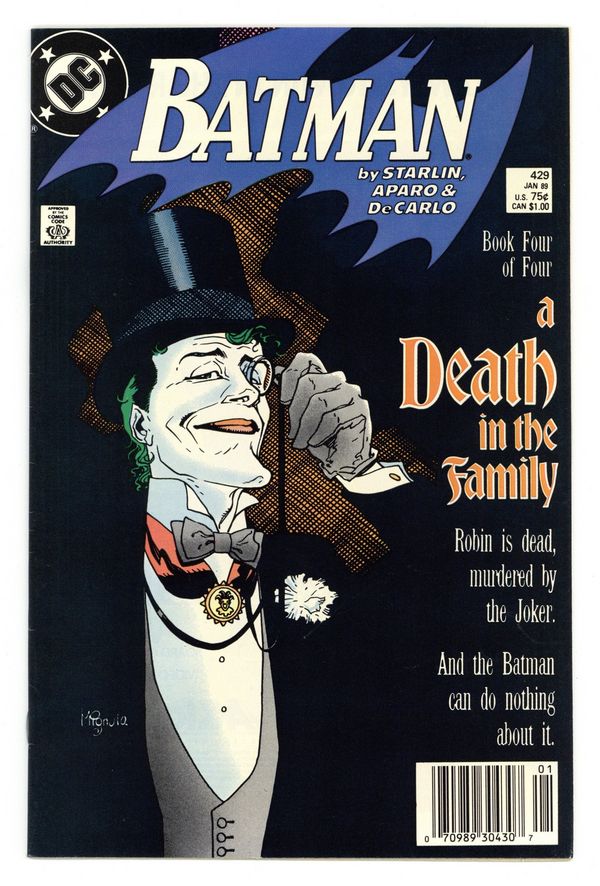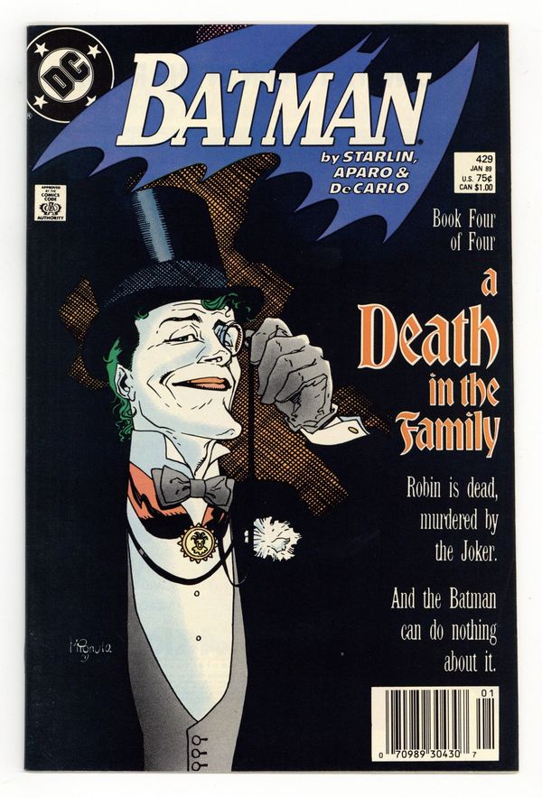 Tags: Batman$15.25First printing. Newsstand Edition. Cover art by Mike Mignola. "A Death in the Family" part 4 of 4, script by Jim Starlin, pencils by Jim Aparo, inks by Mike DeCarlo; Batman and Superman talk to CIA agent Ralph Bundy about the Joker's diplomatic status; The agent tries to get Batman to leave the Joker alone; Batman goes to the Joker's hotel room; The Joker confirms that he killed Jason; The Joker pulls a gun, but Batman is already gone; At the UN the Joker tries to poison the audience; Fortunately, Superman sucks up all the poison and flies out of the room to release it; The Joker activates bombs; Batman pursues him. NOTE: Most issues from 397-432 were reprinted in 1989 and sold in multipacks. These 2nd and 3rd prints have back cover ads dated 1989. 36 Pages, Full Color. Cover price $0.75.