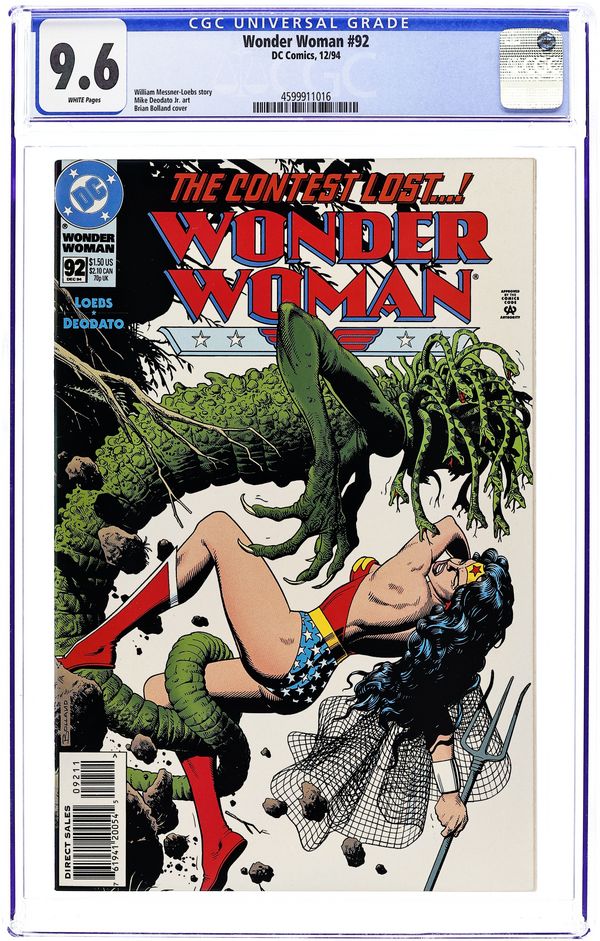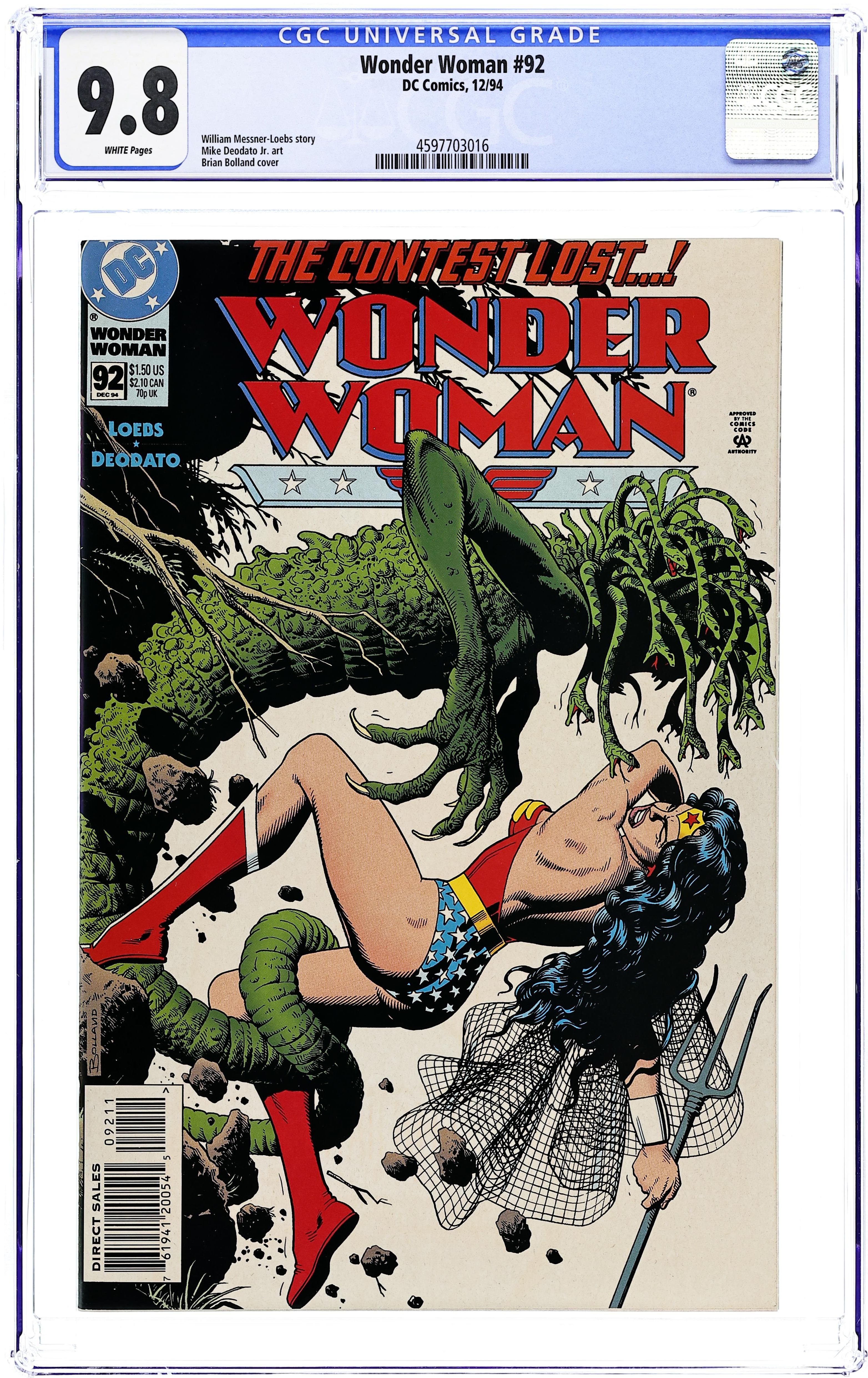 Part 4 of the 5-part 'The Contest,' continued from the previous issue. It's the startling debut of a new Wonder Woman! The truth behind Queen Hippolyta's motives in challenging Diana's worthiness to be Wonder Woman is revealed, causing Diana herself to question her role. That doubt compels her to forfeit the contest, giving her opponent, Artemis, the victory - and the mantle of Wonder Woman! Continues next issue. Written by William Messner-Loebs, with art by Mike Deodato. Cover by Brian Bolland. 36 pgs. Cover price $1.50.