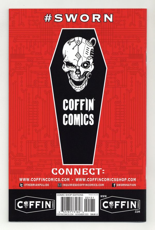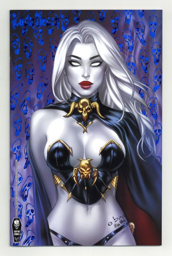 Tags: Lady DeathPublished Nov 2023 by Coffin Comics.$18.00Written by Brian Pulido, Mike MacLean. Art by Diego Bernard. Cover by e.Bas & Ula Moss. Lady Death is thrust into an alternative dystopian future earth where her evil persona 'Empress Death'' has nearly extinguished the human race. Now Empress Death's mission is to murder the last 999 souls on earth and finally achieve megadeath, the death of all life on Earth. Can Lady Death, weaponless and alone, navigate this nightmare and defeat the most-evil foe she has ever faced and return to her timeline unscathed? Lady Death's reality will be upended! Are you ready for this? This premium edition, limited to quantities ordered, features intricate, cutting edge foil enhancements! 32 pages, full color.