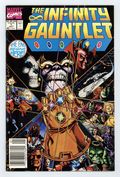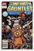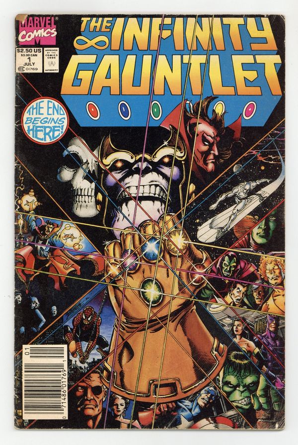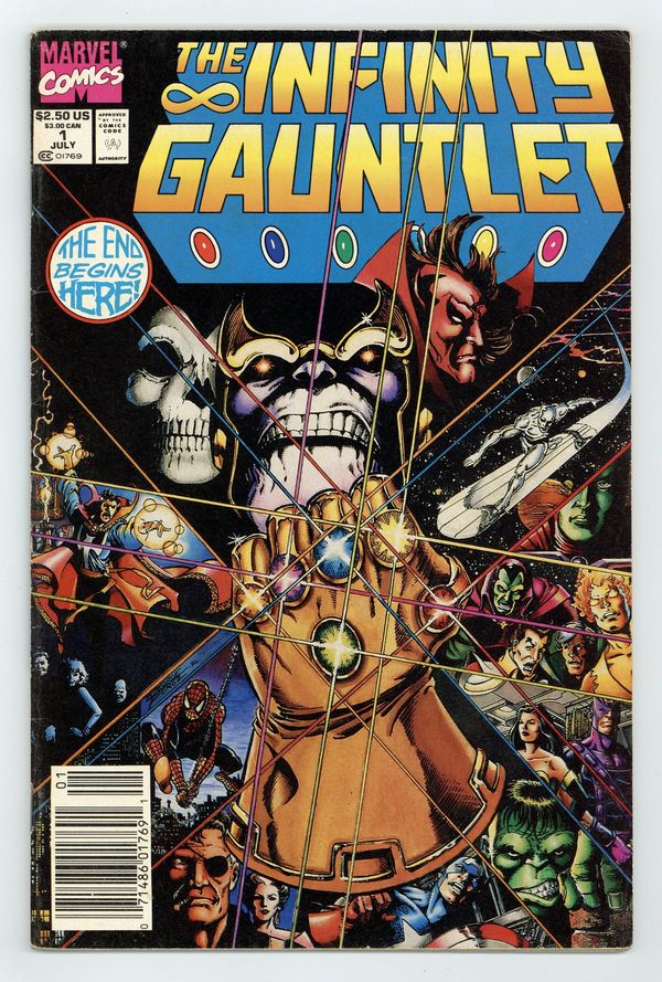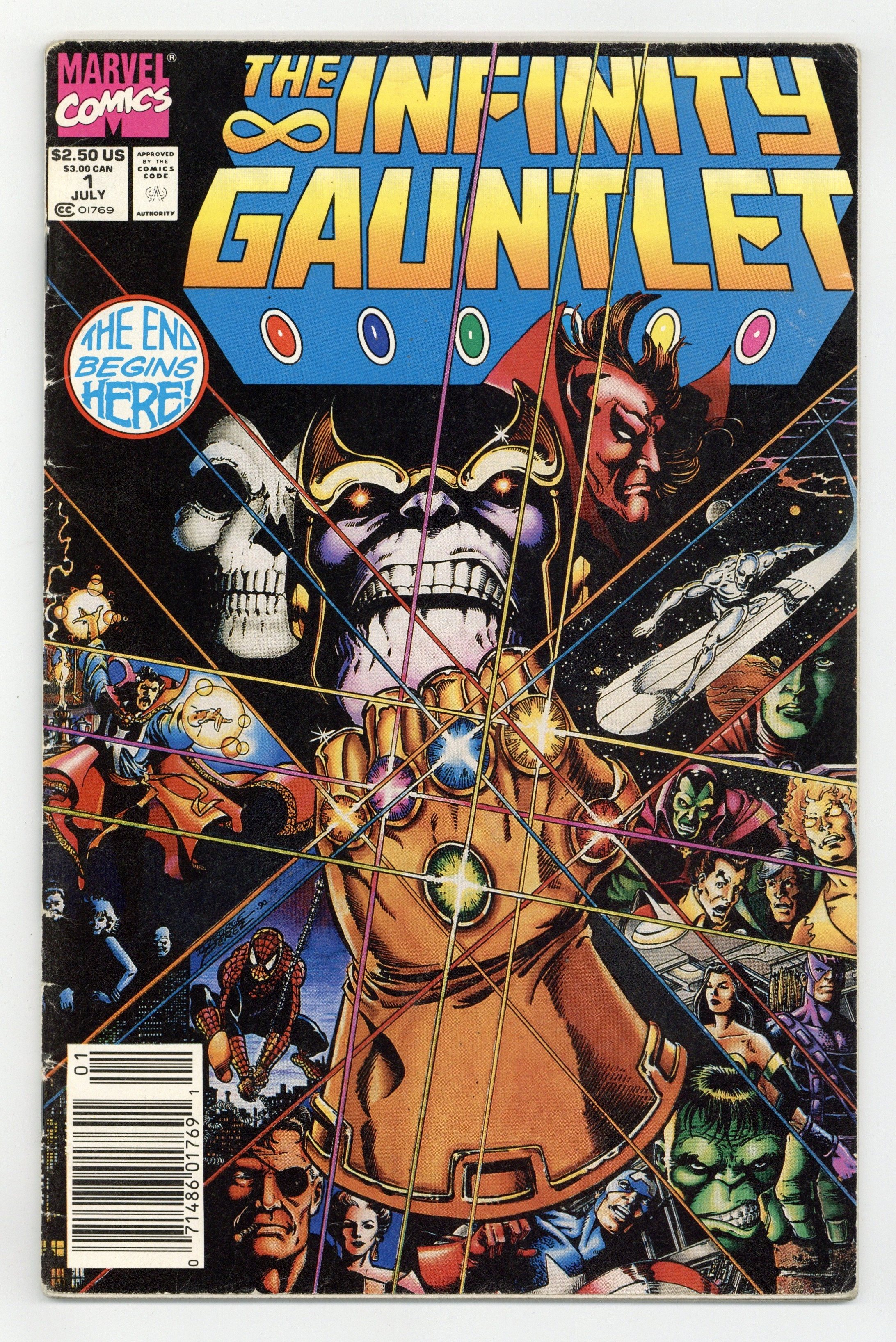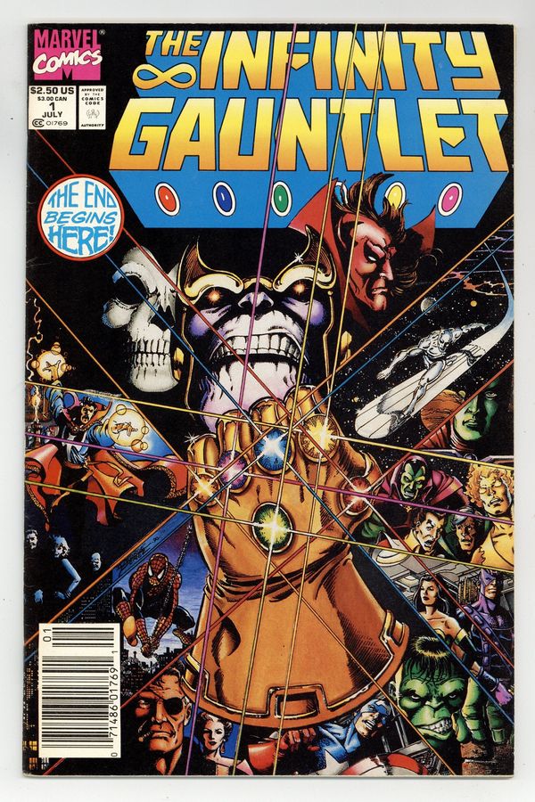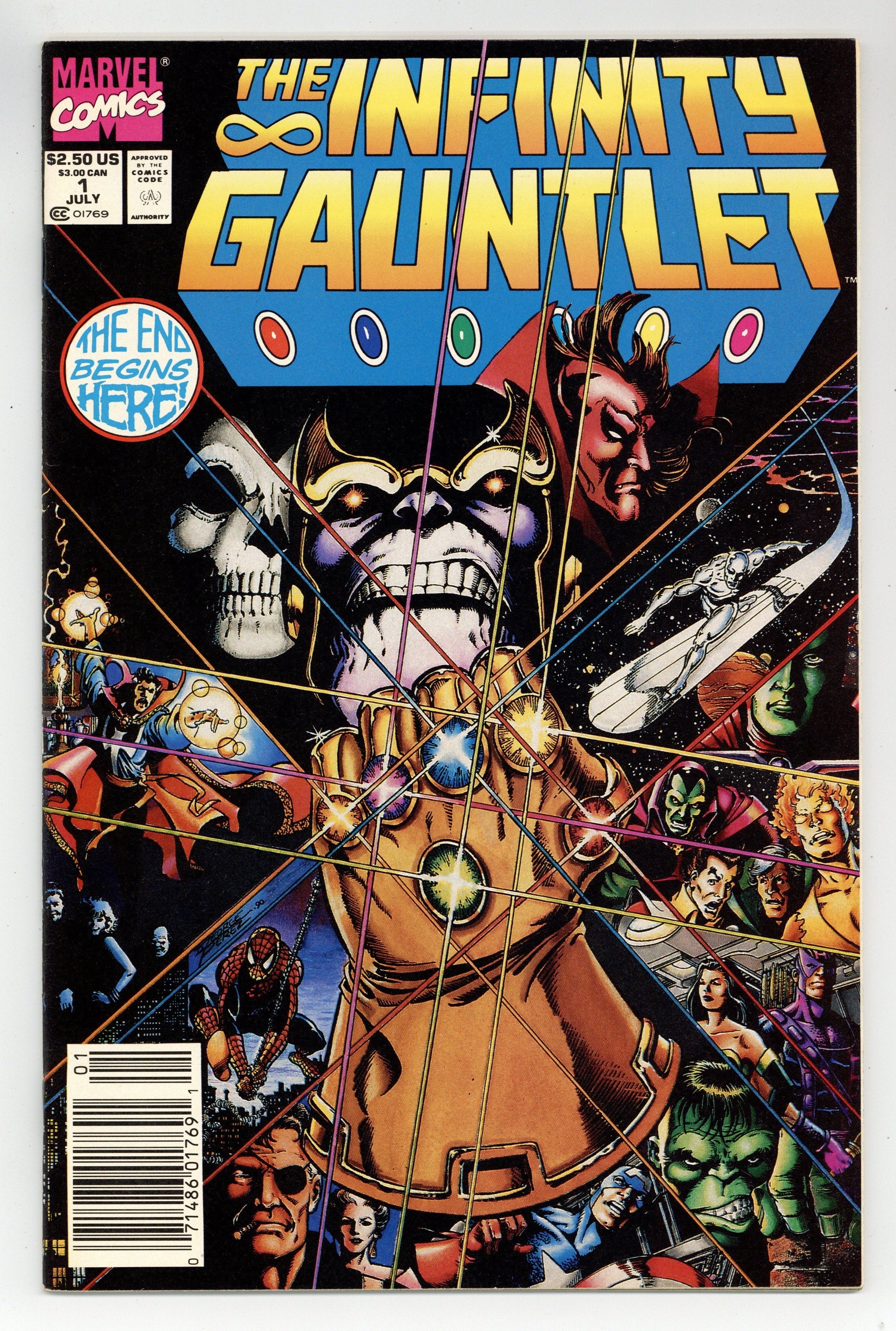 Newsstand Edition. Part 1 of 6. "God!" Story by Jim Starlin. Art by George Perez, Joe Rubinstein and Tom Christopher. Story continued from Thanos Quest #1-2 and Silver Surfer (1987-98 2nd Series) #50. The Silver Surfer crashes to earth and into the Sanctum Sanctorum of one Doctor Strange. The Sentinel of the Spaceways, barely alive after a grueling ordeal, arrives with the warning that the mad Titan, Thanos, has achieved ultimate power. Combining the Infinity Gems into the ominous Infinity Gauntlet, Thanos has become master of the mind, space, time, power, reality and the soul. And with his first act of nigh-omnipotent power Thanos eradicates half the population in the universe. Can the surviving heroes of Earth mount an offensive against this supreme power for evil and destruction, plus who are the mysterious new players who've just arrived on the scene? Cover price $2.50.