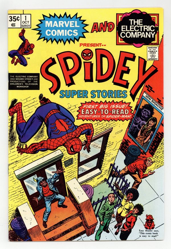 Starts Apr 4 Simplified Spider-Man stories. 11 page origin story, "Spider-Man is Born!" Script by Jean Thomas (with help from Bill Effros, based on the original story by Stan Lee), pencils by Winslow Mortimer, inks by Mike Esposito. Also in this issue: "Spidey Signs Up," "Spidey Meets the Spoiler" (based on the Electric Company script by Tom Whedon), and "Help! I'm Spider-Man!" (based on a story by Byron Preiss). John Romita Sr. cover. Cover price $0.35.