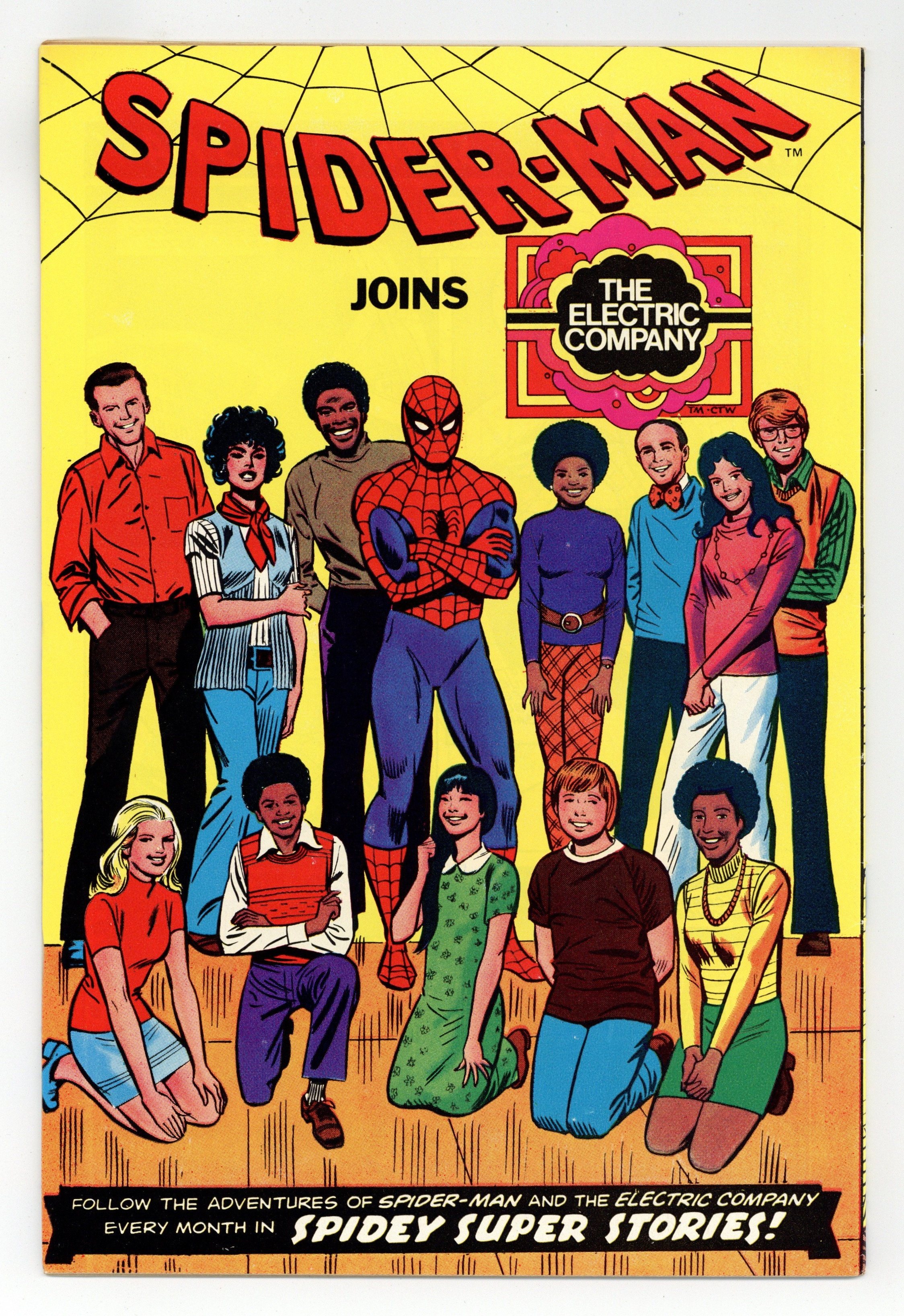 Simplified Spider-Man stories. 11 page origin story, "Spider-Man is Born!" Script by Jean Thomas (with help from Bill Effros, based on the original story by Stan Lee), pencils by Winslow Mortimer, inks by Mike Esposito. Also in this issue: "Spidey Signs Up," "Spidey Meets the Spoiler" (based on the Electric Company script by Tom Whedon), and "Help! I'm Spider-Man!" (based on a story by Byron Preiss). John Romita Sr. cover. Cover price $0.35.