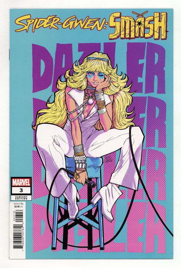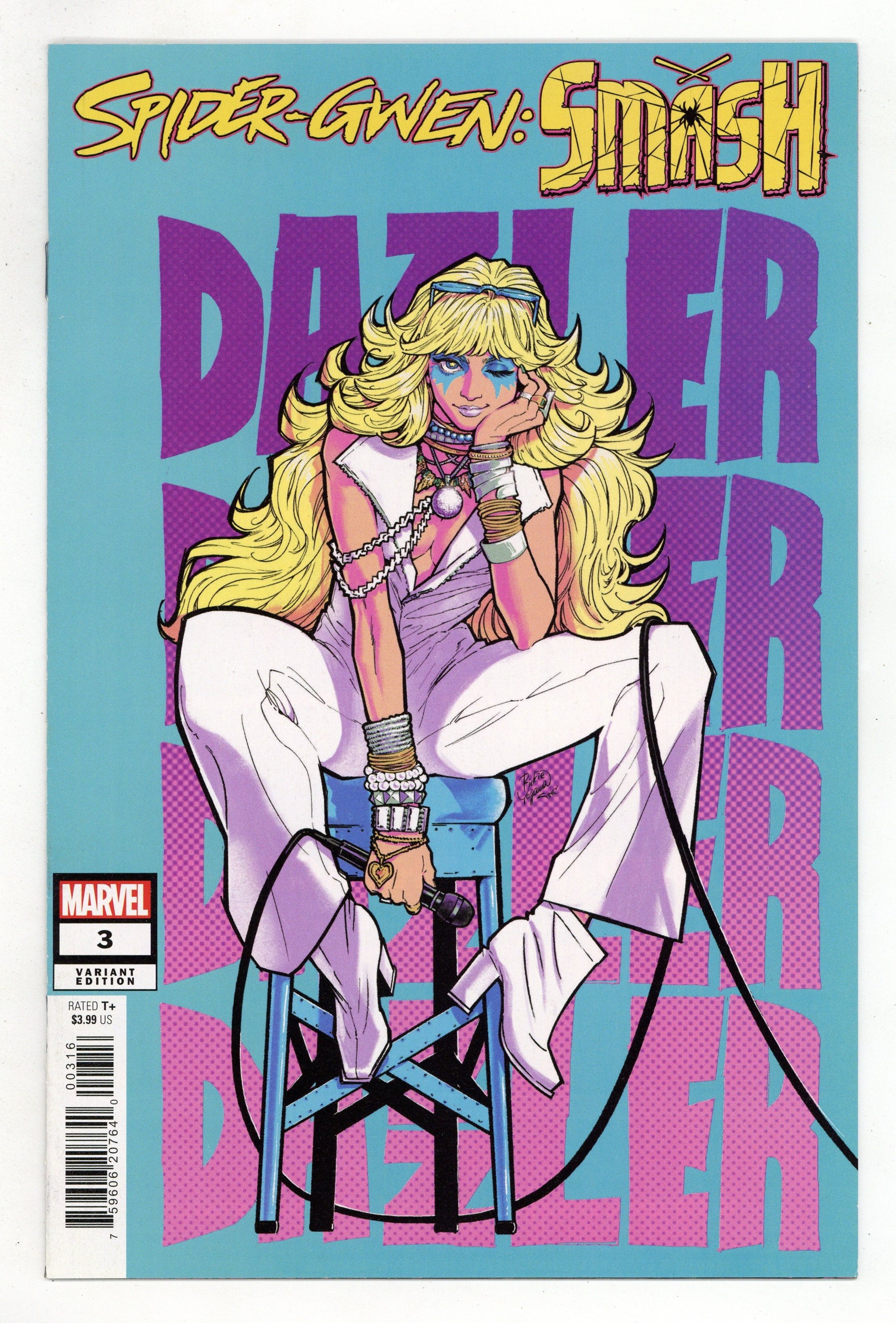 Tags: Spider-Gwen$21.00Limited 1 for 25 Retailer Incentive Variant Cover. Written by Melissa Flores. Art by Enid Balam. Cover by Rickie Yagawa. After an amazing concert in Los Angeles, Gwen is hoping for a quiet day off with the Mary Janes, but that is quickly ruined when Dazzler goes missing! Plus the secret origin of Earth 65's HULK is finally revealed! 28 pages, full color. Rated T+ Cover price $3.99.