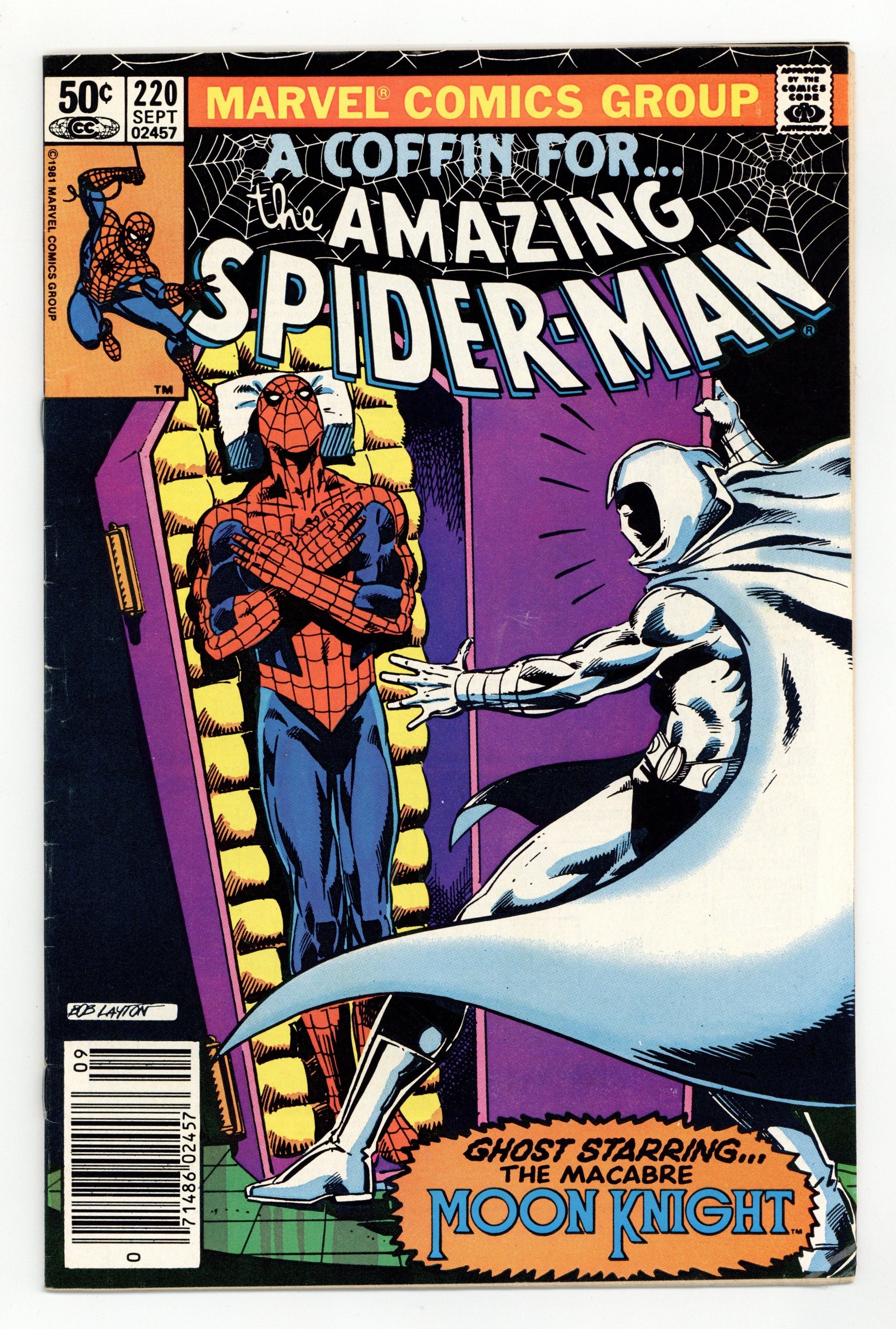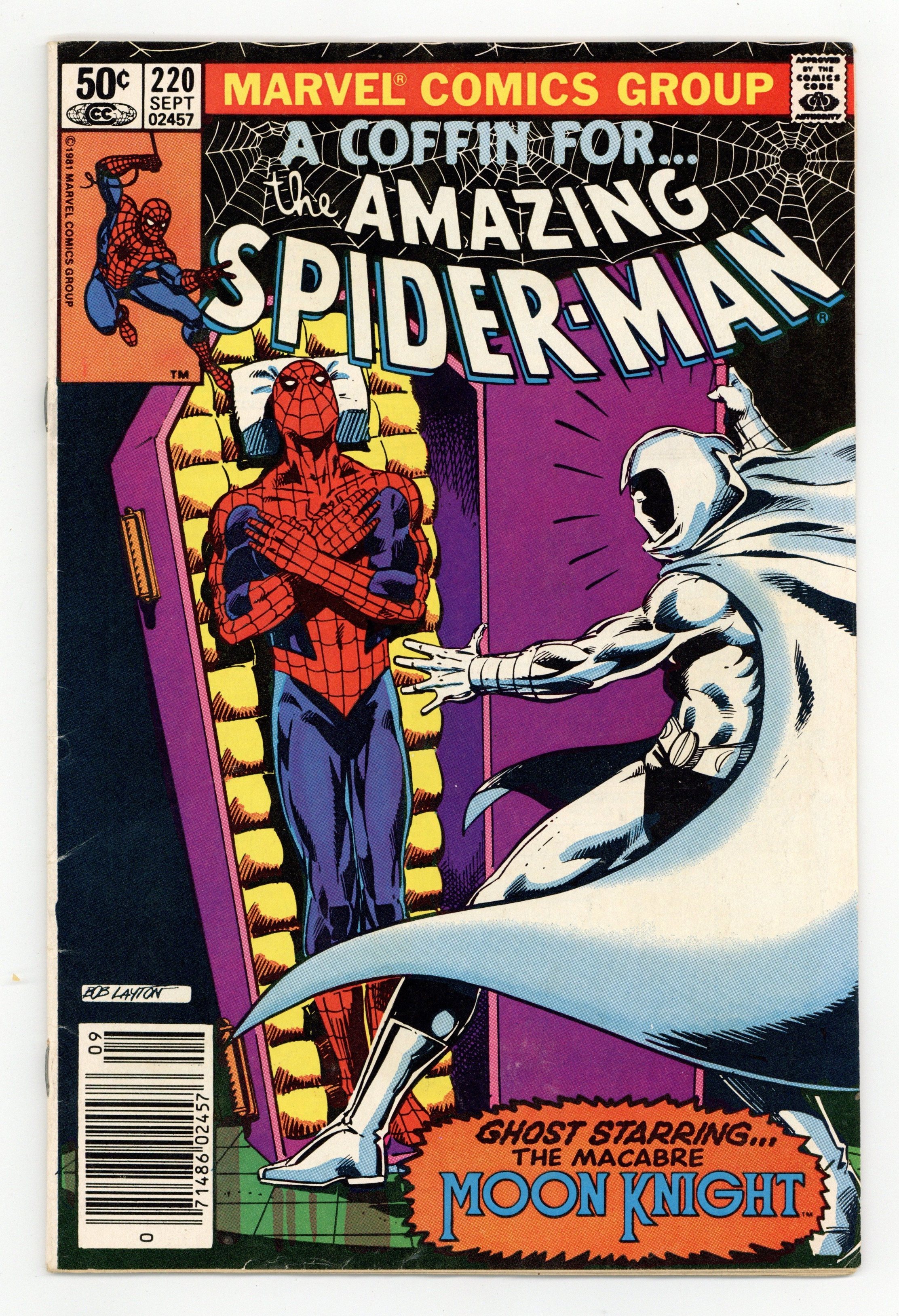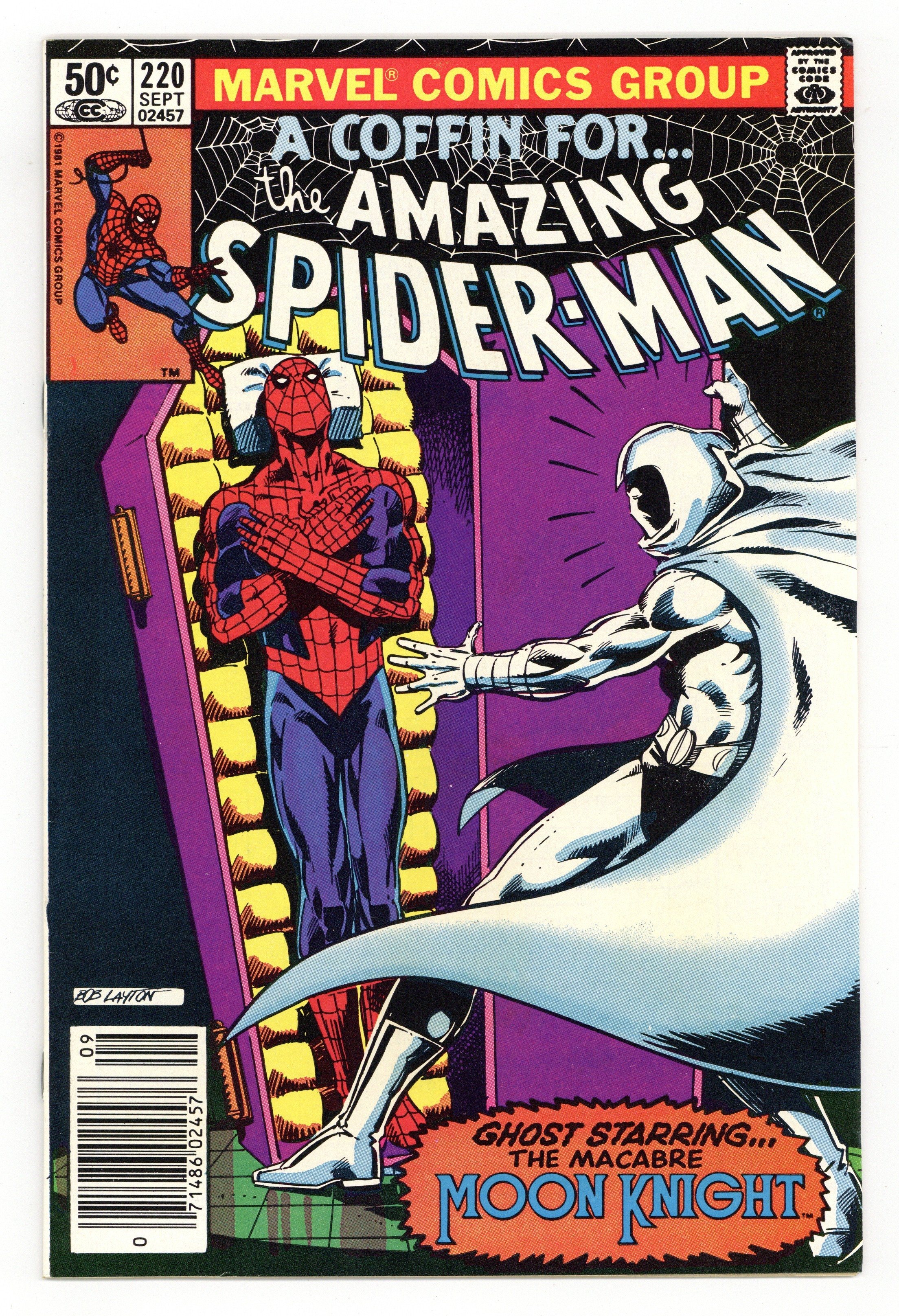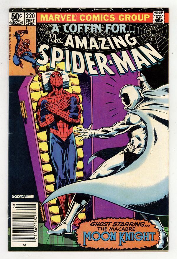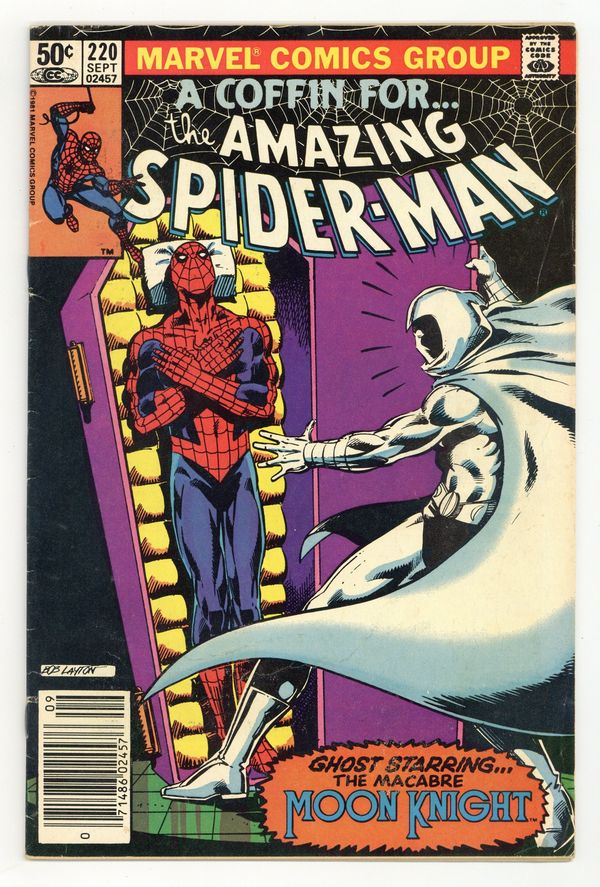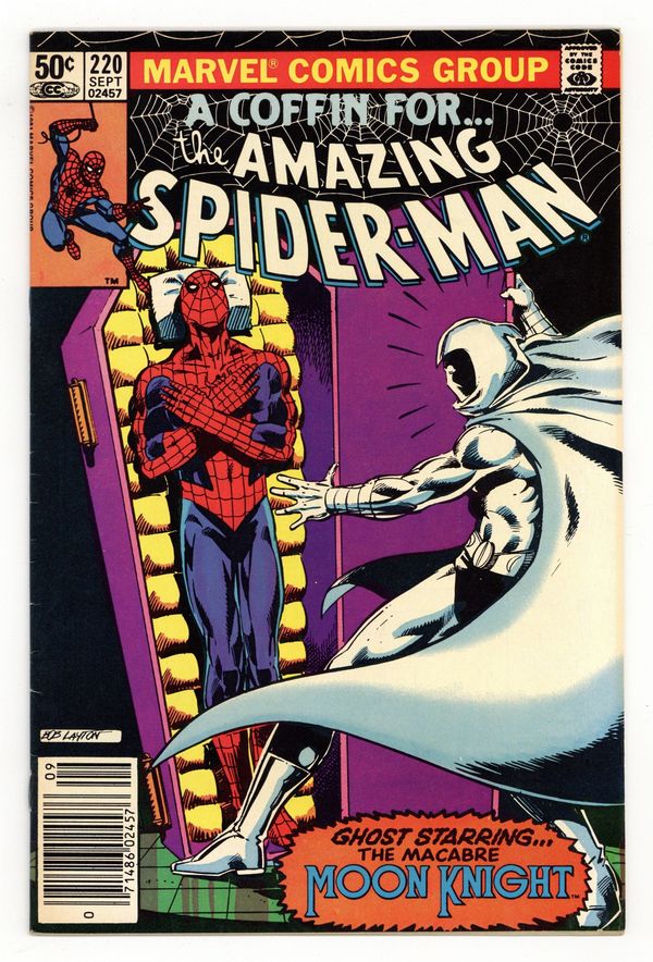Newsstand Edition. "A Coffin for Spider-Man!" Guest-starring Moon Knight. Script by Michael Fleisher. Art by Bob McLeod. Cover by Bob Layton. A crime wave is sweeping across New York City! And the leader of the outbreak is Moon Knight! Hold on, isn't the knight one of the heroes in this town? That's what the web-slinger thought! At the Metropolitan Museum of Art, Spider-Man interrupts Moon Knight's next heist! But then he helps his lunar adversary escape! Is the wall-crawler joining or stopping the (crime) wave? Cameo appearances by J. Jonah Jameson and Frenchie. Second story: "The Nursing Home Caper" Script by Mike W. Barr. Art by Win Mortimer. With quick thinking Aunt May stops a robbery at her nursing home. Cameo appearances by Anna Watson and Spider-Man. (Note: The web-slinger and Moon Knight previously met in Spectacular Spider-Man 22 & 23 and Marvel Team-Up Annual 4.) 36 pages. 50 cent cover price. Cover price $0.50.