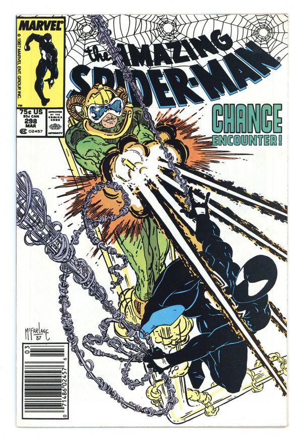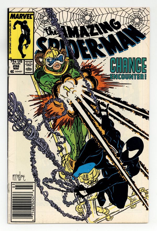 Tags: Spider-Man$99.00Newsstand Edition. "Chance Encounter!" Part 1 of 2. Script by David Michelinie. Pencils by Todd McFarlane. Inks by Bob McLeod. Cover by Todd McFarlane. Chance is back in business and working a new job for the Life Foundation! The clandestine organization wants Chance to steal an arms shipment coming into the west side docks! That should be a piece of cake for the high-flying mercenary! However, the Daily Bugle dispatches an undercover photographer to observe the delivery! And beneath the moonlit sky, fireworks explode when Chance and the Amazing Spider-Man throw down on the docks! First appearance (and cameo on the last page) by Eddie Brock (aka Venom). First appearance of Carlton Drake of the Life Foundation. Cameo appearances by Mary Jane Watson, Joy Mercado, and Joe Robertson. (Notes: Chance previously appeared in Web of Spider-Man 15. This issue begins Todd McFarlane's 2-year run as the penciler of the Amazing Spider-Man series.) 36 pages. Cover price $0.75.