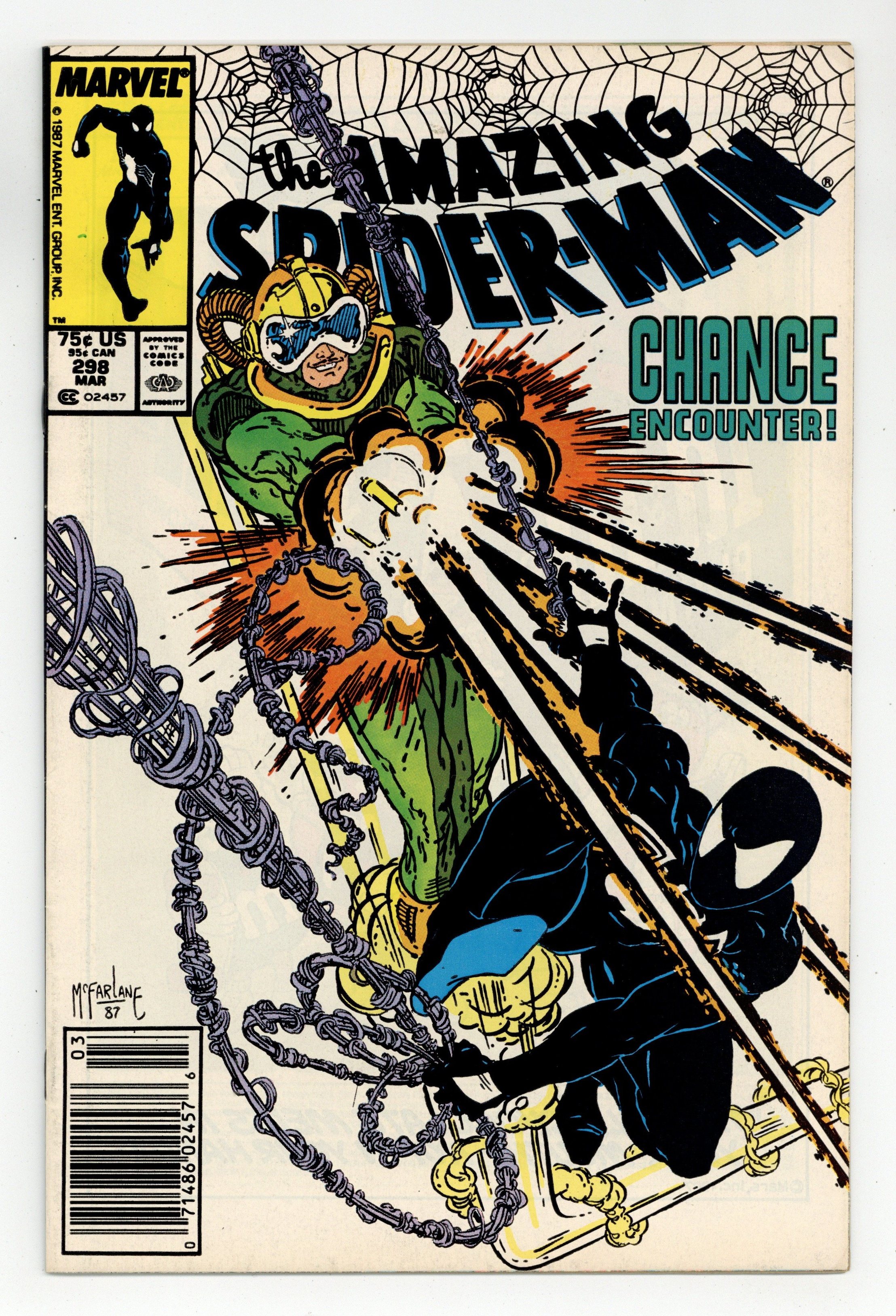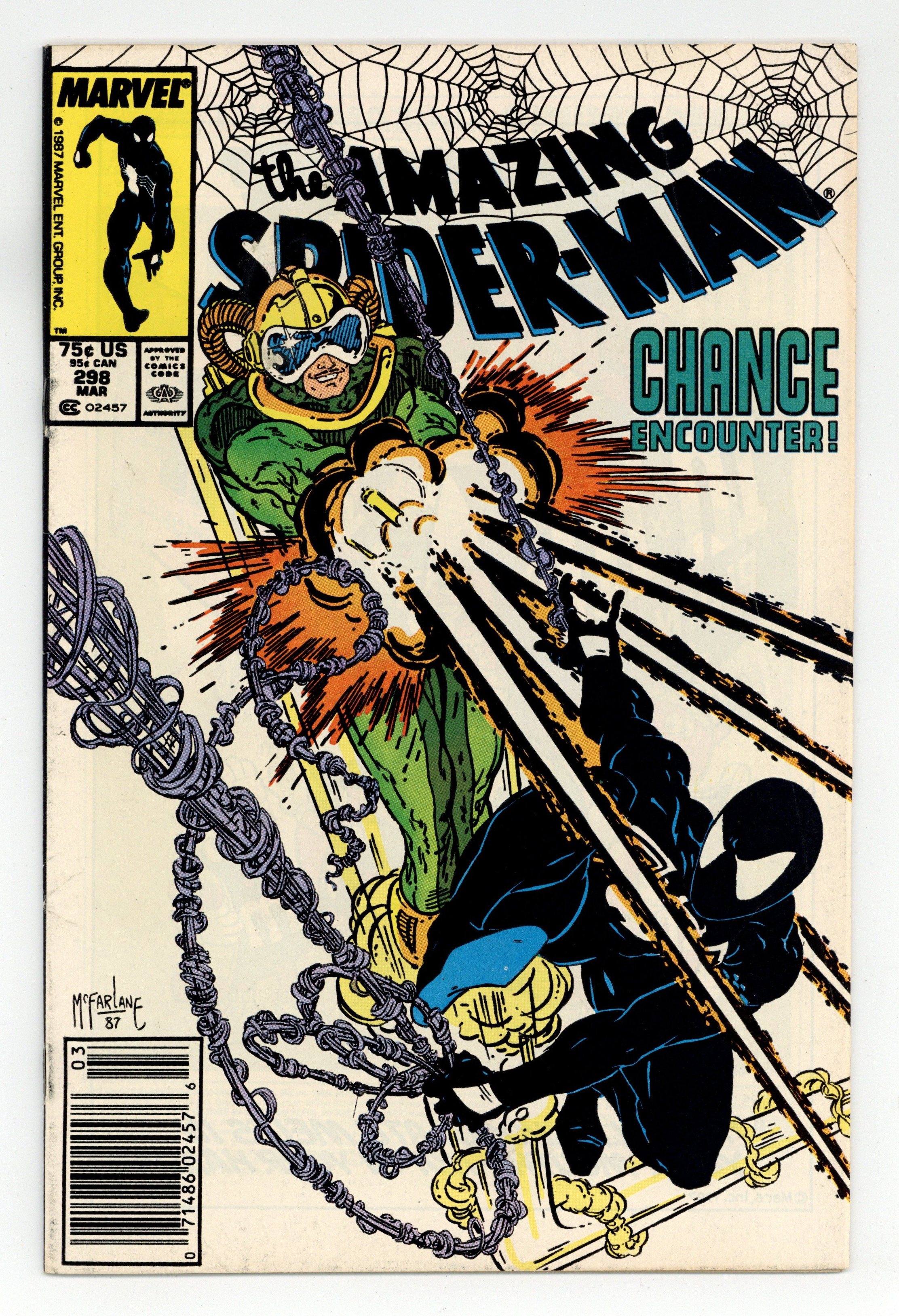 Newsstand Edition. "Chance Encounter!" Part 1 of 2. Script by David Michelinie. Pencils by Todd McFarlane. Inks by Bob McLeod. Cover by Todd McFarlane. Chance is back in business and working a new job for the Life Foundation! The clandestine organization wants Chance to steal an arms shipment coming into the west side docks! That should be a piece of cake for the high-flying mercenary! However, the Daily Bugle dispatches an undercover photographer to observe the delivery! And beneath the moonlit sky, fireworks explode when Chance and the Amazing Spider-Man throw down on the docks! First appearance (and cameo on the last page) by Eddie Brock (aka Venom). First appearance of Carlton Drake of the Life Foundation. Cameo appearances by Mary Jane Watson, Joy Mercado, and Joe Robertson. (Notes: Chance previously appeared in Web of Spider-Man 15. This issue begins Todd McFarlane's 2-year run as the penciler of the Amazing Spider-Man series.) 36 pages. Cover price $0.75.