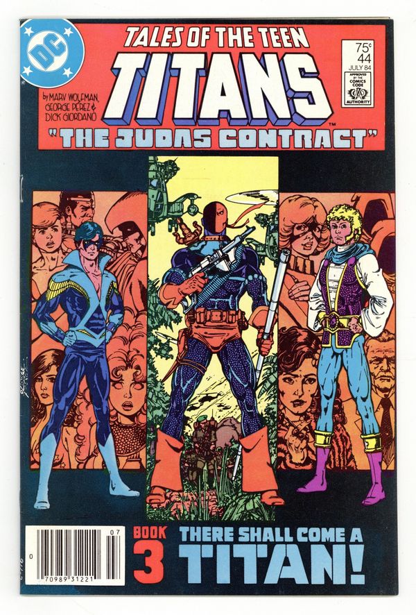 Newsstand Edition. The Judas Contract: Part 3 of 4: There Shall Come a Titan! - Written by Marv Wolfman & George Perez. Art by George Perez, Dick Giordano and Mike DeCarlo. Cover by George Perez. Adeline Wilson tells Dick Grayson of the origin of Deathstroke, and Dick assumes the name Nightwing for the first time! Starring Nightwing (intro), Jericho (intro), Deathstroke the Terminator, Terra, Adeline Wilson, H.I.V.E., Wintergreen, Grant Wilson (flashback/cameo) and Jackal. Concludes in New Teen Titans (1980) Annual #3. 36 pages, full color. Cover price $0.75.