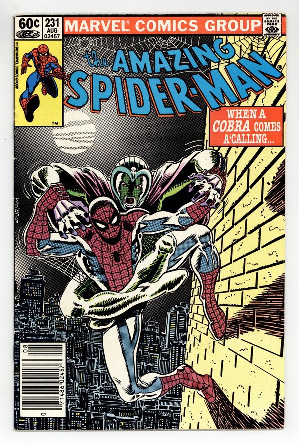 Newsstand Edition. Caught in the Act..." Part 1 of 2. Script by Roger Stern. Art by John Romita Jr. (breakdowns) and Jim Mooney (finishes). Cover by John Romita Jr. and Al Milgrom. All roads lead to Maxie's Bar for a pow-wow with the notorious underworld informant Nose Norton! Four people wanting to shake down the Nose gather outside this shady west side dive: Ned Leeds, Marla Madison, Spider-Man, and the Cobra! And as expected a major fracas breaks out! But Spidey isn't overly concerned because he's beaten the Cobra before (and most recently in Spectacular Spider-Man 46). However unbeknownst to the amazing one, someone else is also on the way to Maxie's Bar! Someone the web-slinger has never met. Unfortunately, it's not Doctor Jekyll...its Mister Hyde! Wow! Things are about to get real next issue! Appearances by J. Jonah Jameson and Betty Brant Leeds. Cameo by Mister Hyde. Flashback cameo by Captain America. (Notes: This story was reprinted in Spider-Man Magazine 4.) 36 pgs. Cover price $0.60.