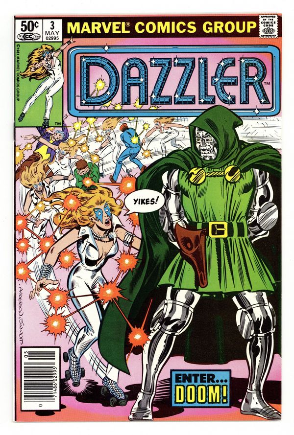 Newsstand Edition. Cover pencils by Brent Anderson, inks by Joe Sinnott. The Jewels of Doom!, script by Tom DeFalco, pencils by John Romita, Jr. (pages 1-17) and Alan Kupperberg (pages 18-30), inks by Danny Bulanadi (pages 1-17) and Armando Gil (pages 18-30); The Fantastic Four examines Dazzler's powers; Dazzler is to perform at the UN building, where an exhibition also is held with the Latverian crown jewels; Dr Doom drops by to get the stones and the Merlin stone in particular. 32 pgs. $0.50. Cover price $0.50.