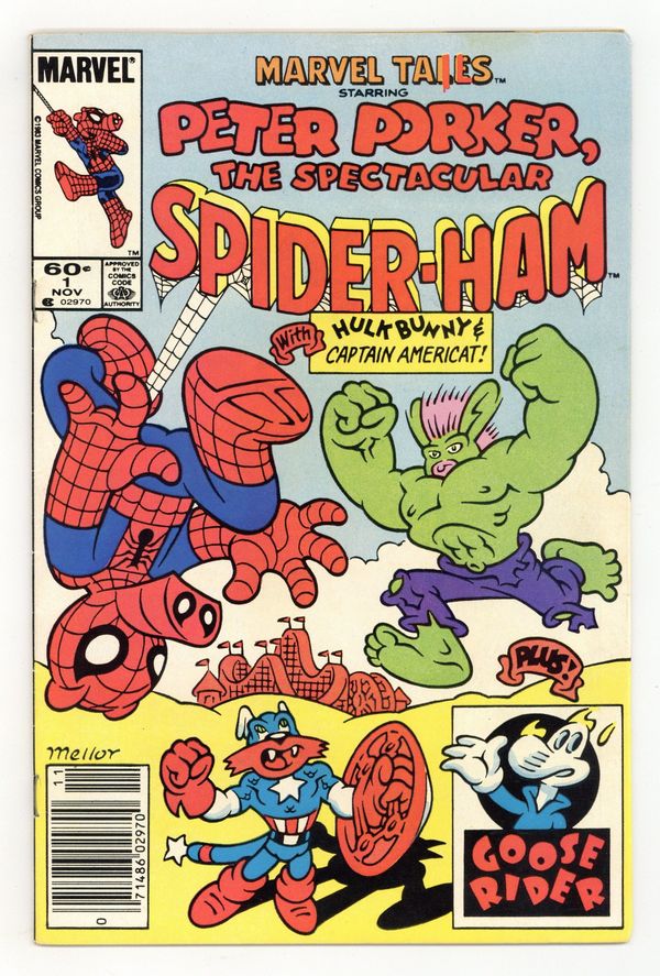 $31.50Newsstand Edition. 1st appearances of Spider-Ham, Hulk Bunny, Goose Rider and more. Cover by Steve Mellor. Written by Tom DeFalco and Steve Mellor. Art by Mark Armstrong, Steve Mellor and Joe Albelo. Captain Americat and Spider-Ham investigate a saboteur destroying a video arcade and run up against Hulk Bunny in "If He Should Punch Me!" by Tom DeFalco, Mark Armstrong and Joe Albelo. Characters in this story: Spider-Ham [Peter Porker]; Captain Americat; Hulk Bunny; J. Jonah Jackal; The Gopher Gang (villain); Masked Marauder (villain). Plus: "Goose Rider" back-up story by Steve Mellor. Characters in this story: Goose Rider; Chainsaw (villain). 32 pages, full color. Cover price $0.60.