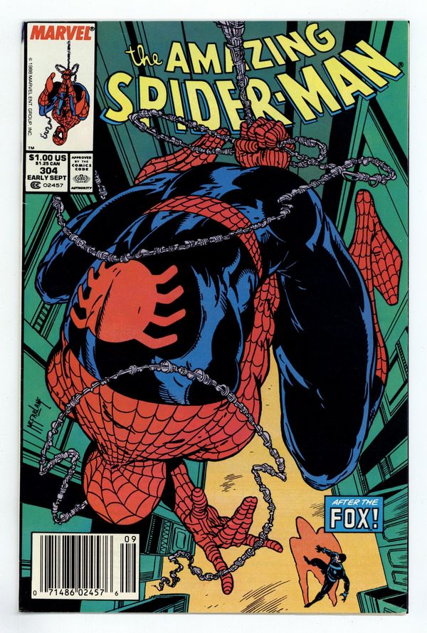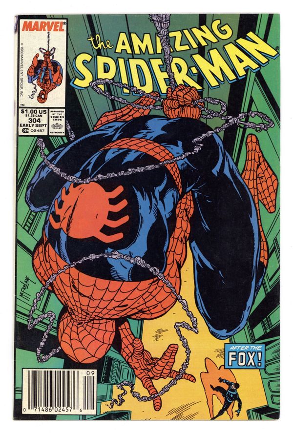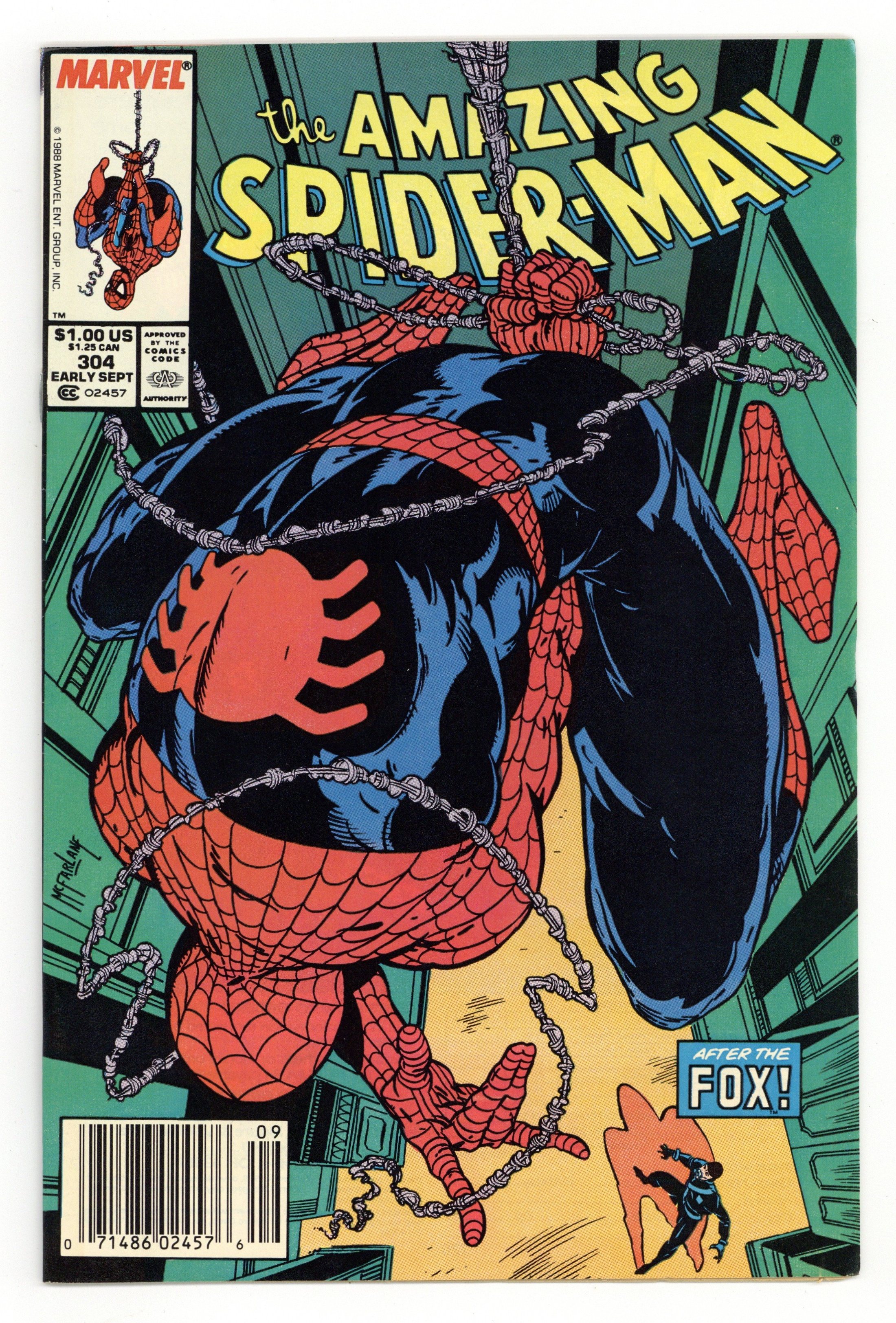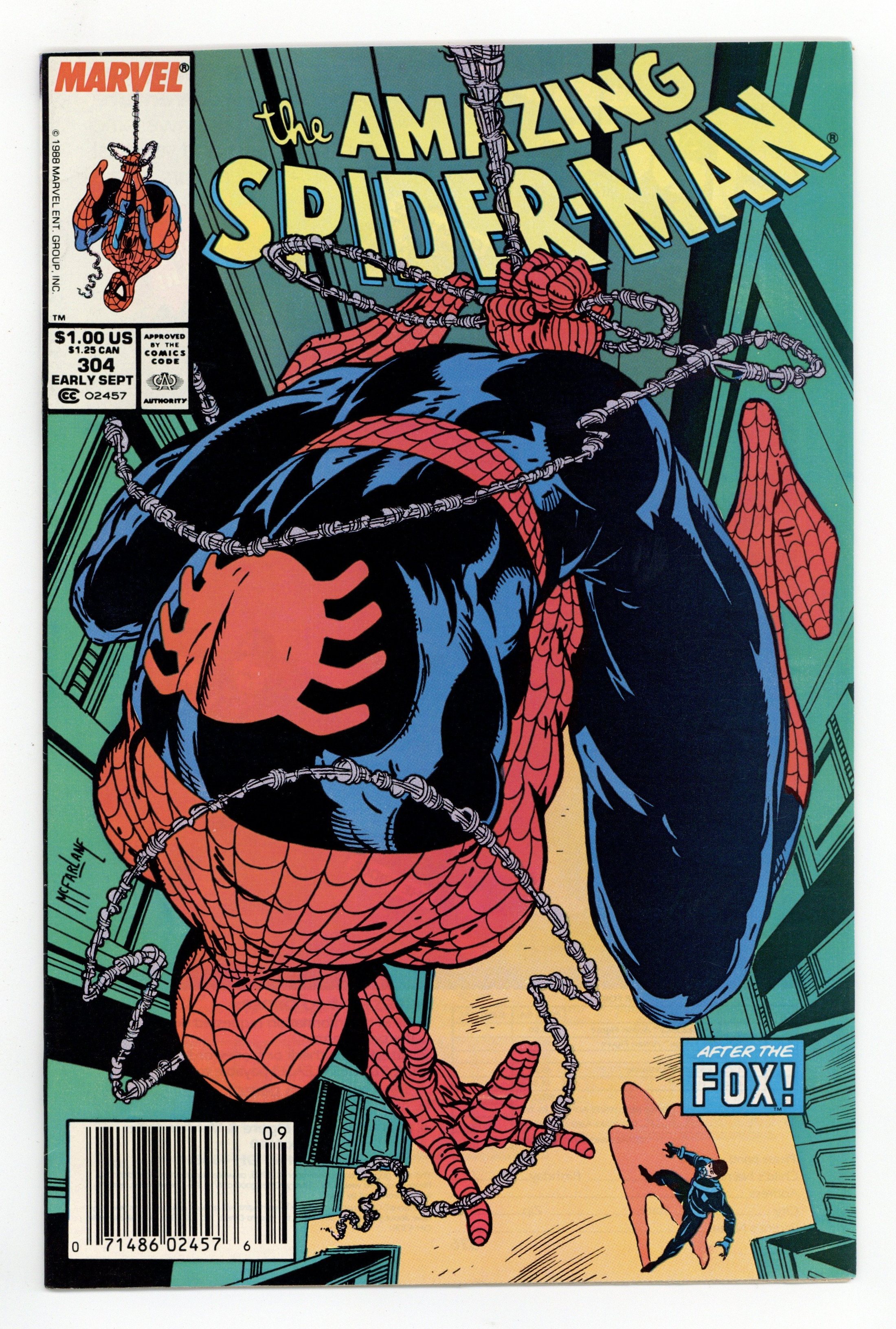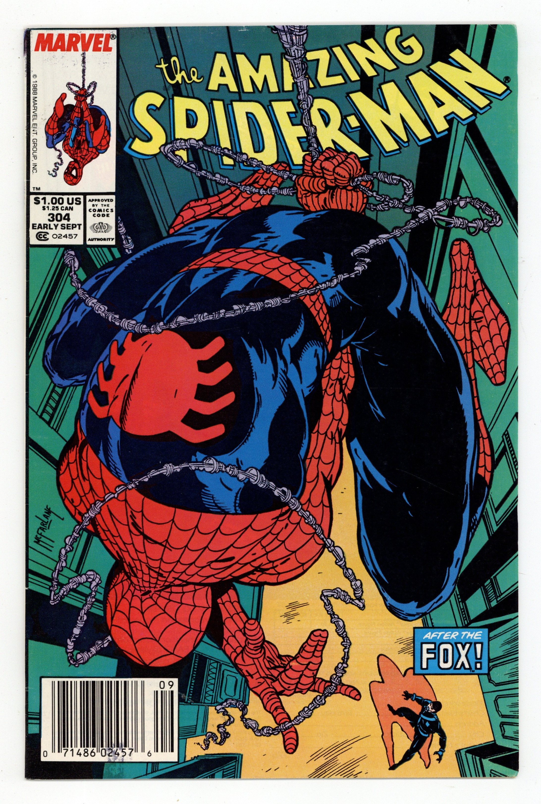 Tags: Spider-Man$15.00Newsstand Edition. "California Schemin'!" Part 1 of 2. Script by David Michelinie. Pencils by Todd McFarlane. Finishes by Joe Rubinstein. Cover by Todd McFarlane. The Daily Bugle publishes a book featuring Peter Parker's best photos of Spider-Man! And now the Bugle's ace photographer and Mary Jane are on their way to Los Angeles for the publicity tour! It should be all fun in the sun in the city of angels! But Peter's first promotional event at the L.A. civic center hits a snag when an old acquaintance shows up: the Black Fox! The wily fox steals a priceless chalice and the chase is on! Is the web-slinger ready for his Hollywood debut? Cameo appearances by Aunt May, J. Jonah Jameson, and the Prowler. First appearance of Jonathan Caesar. (Notes: The Black Fox previously appeared in Web of Spider-Man 15. The Amazing Spider-Man title was published bi-monthly for the next 5 issues.) 36 pgs. Cover price $1.00.