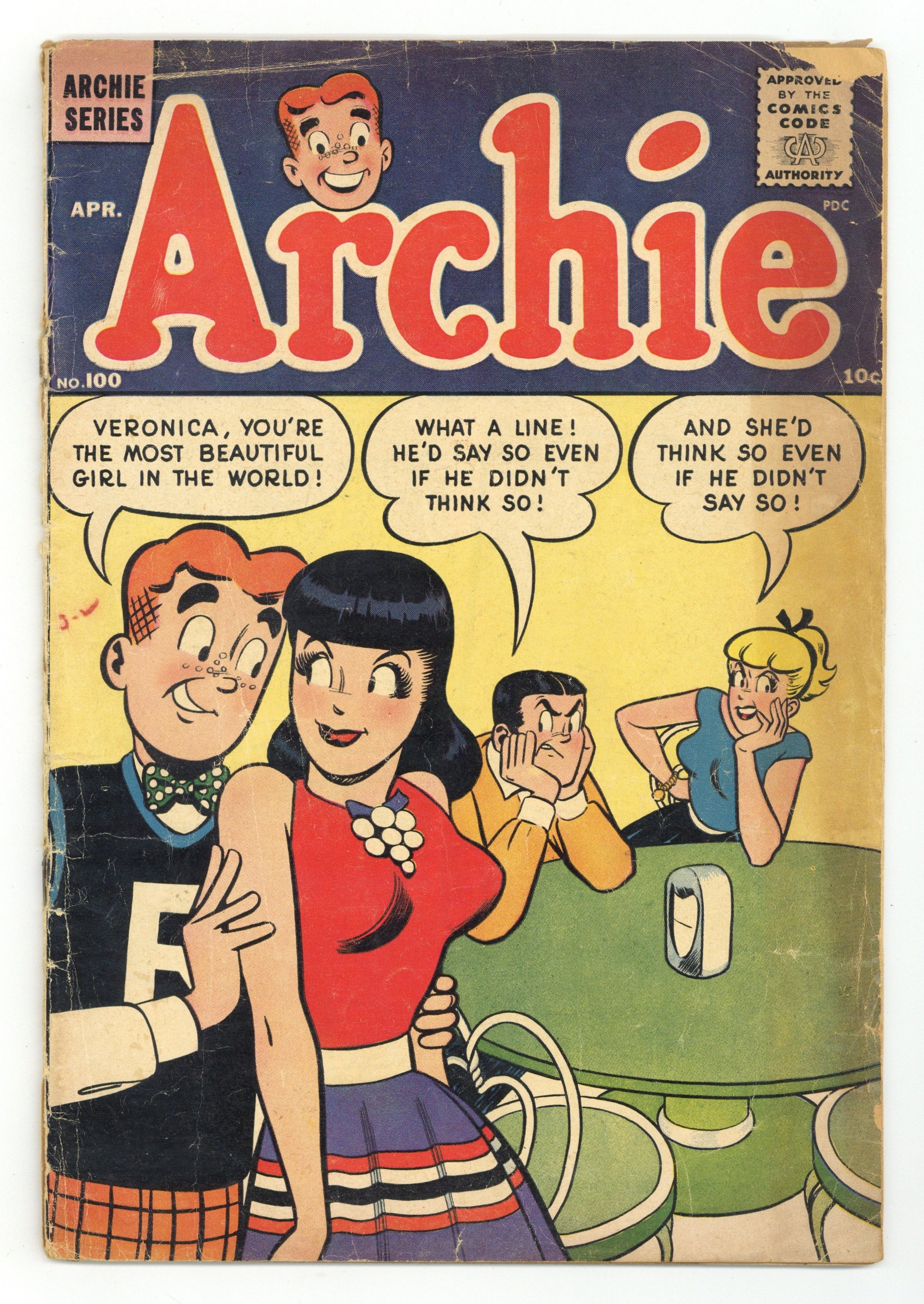 Stories by unknown. Art by unknown. Archie and Jughead secure the door to the new clubhouse in "Something to a Door"! Plus: Jughead discusses the three types of parties in the 1-pager "Professor Jughead's Educational Corner"; Archie and Reggie in an old vaudeville routine in the 1-pager "Off the Cob"; Archie and Reggie wrestle while waiting for Veronica to choose a dress for her date with Reggie in "A Wrestled Development"; Jughead gives money to a bum in the half-pager "Hobo Holiday"; Jughead buys some eggs in the half-pager "Great Eggs-Pectations"; Betty thinks Archie is sick in "Prescription for Two"; and Archie gives Jughead a ride to school in the jalopy in "Auto-Suggestion"! 32 pages, full color. Cover price $0.10.