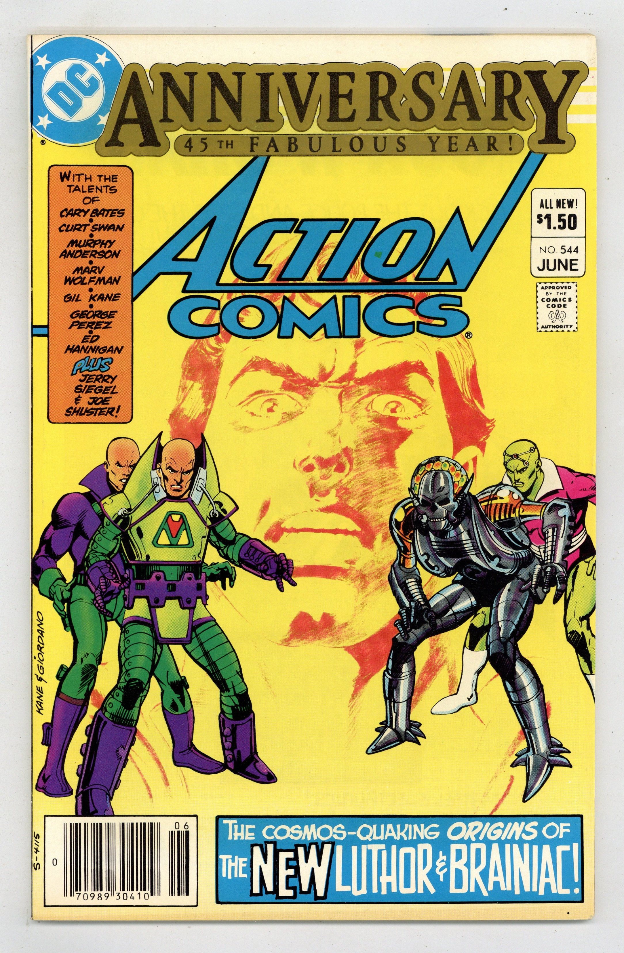 Newsstand Edition. Special 45th anniversary issue. Cover pencils by Gil Kane, inks by Dick Giordano. "Luthor Unleashed!", script by Cary Bates, pencils by Curt Swan, inks by Murphy Anderson; Barely alive after his latest fight with Superman, Luthor heads to Lexor to recover, where he meets his son for the first time; Meanwhile, back on Earth, one of Luthor's robots takes revenge in his master's stead. Luthor illustration by George Perez. Happy 45th Anniversary, Superman! article by Jerry Siegel and Joe Shuster. Congratulations, Superman! illustration by Joe Shuster. "Rebirth!", script by Marv Wolfman, art by Gil Kane; With Superman's unwitting help, Brainiac escapes his prison, experiences the depth and breadth of the universe, and reforms as an entirely new kind of being; Then Brainiac lures Superman to Systus 2, where he robs the hero of his powers, and greets him in his new form for the first time. The New Brainiac illustration by Ed Hannigan and Dick Giordano. 68 Pages, Full Color, $1.50. Cover price $1.50.