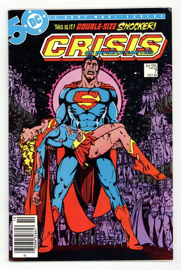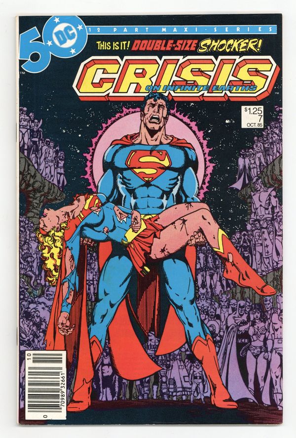 Newsstand Edition. "Beyond the Silent Night!" Written by Marv Wolfman. Art by George Perez, Dick Giordano, and Jerry Ordway. At last the origins of the most mysterious players in this story are revealed. Learn the secret pasts of Pariah, and why he is destined to witness world after world die, the tragic past of Harbinger, the mysterious Monitor, and evil incarnate, the Anti-Monitor. Plus, in order to stop the Anti-Monitor from destroying the last remaining Earths in the multiverse, a cadre of the DCU's most powerful heroes mount an all out assault on the villain's stronghold in the dangerous Anti-Matter Universe. It is a task not everyone will survive. Featuring the heroic and tragic death of Supergirl. Cover price $1.25.