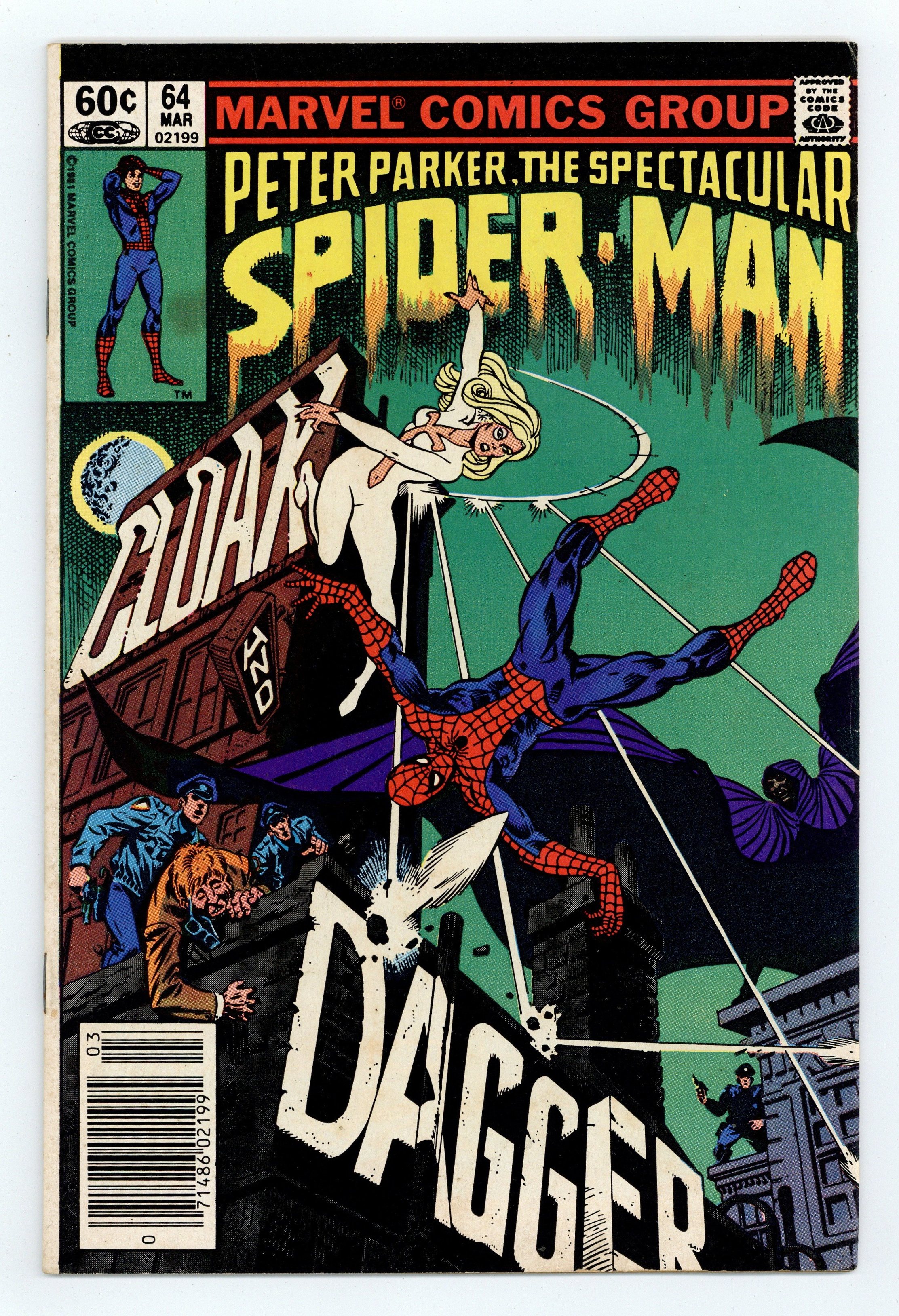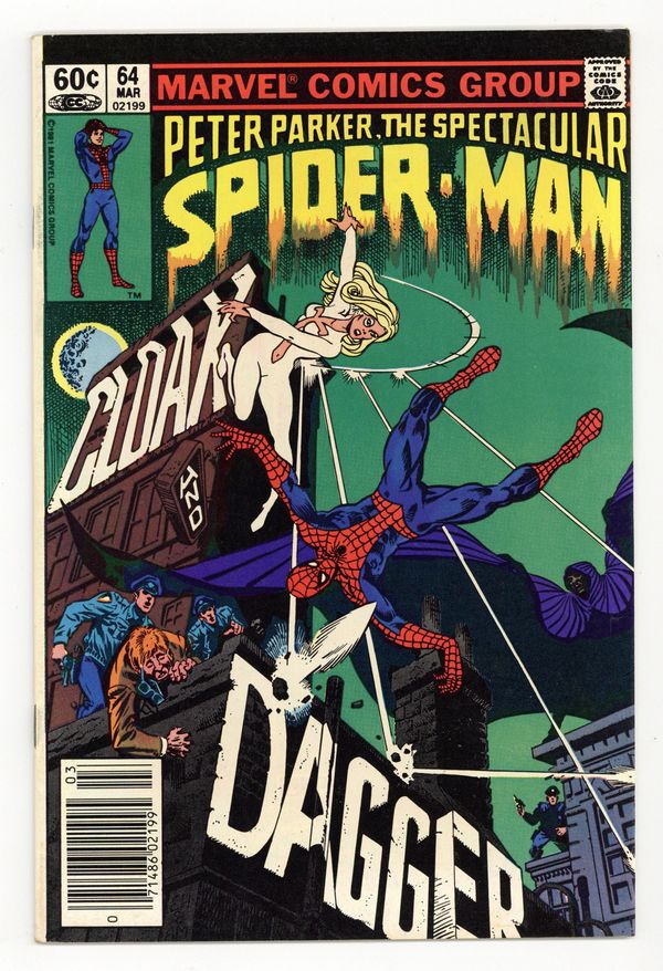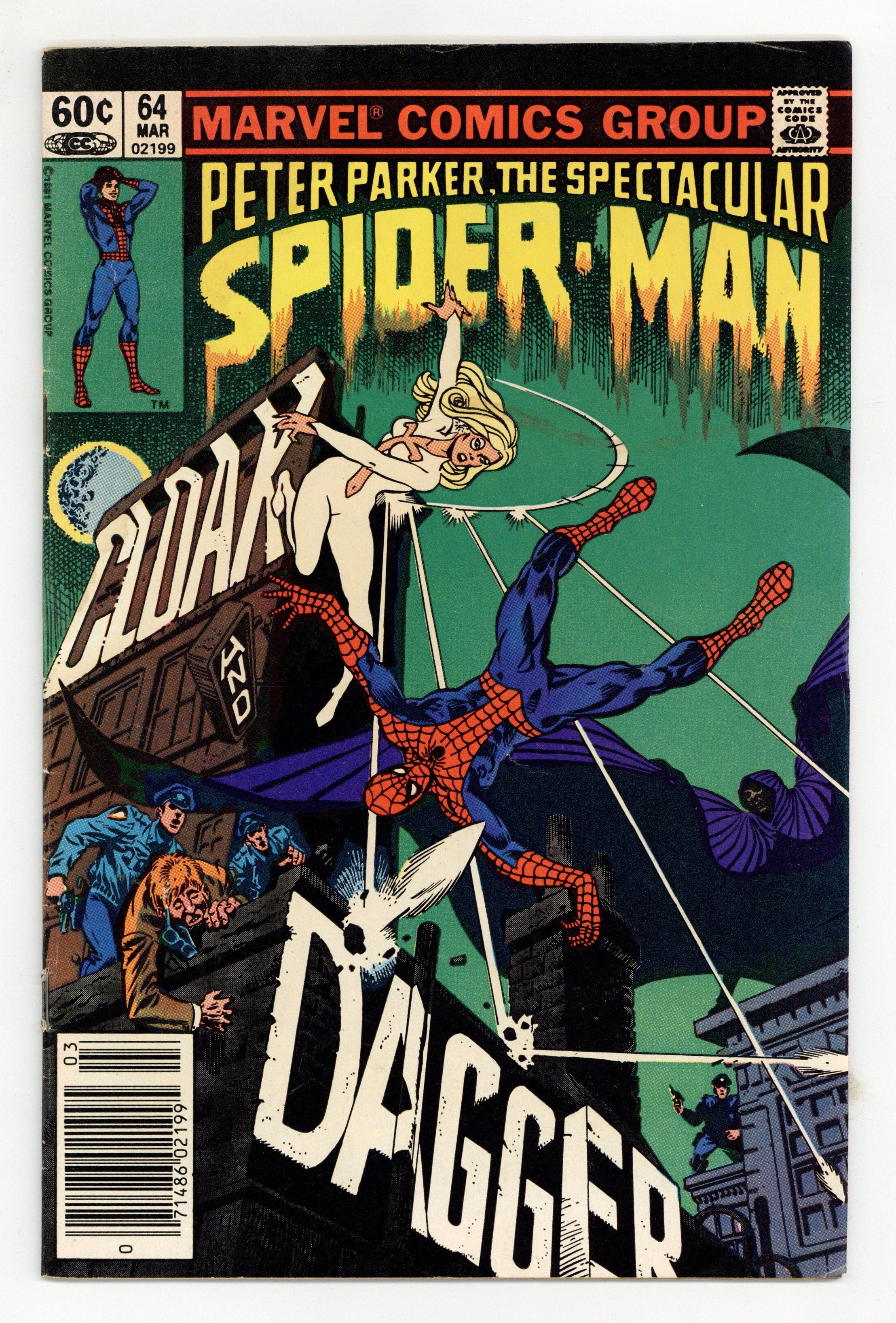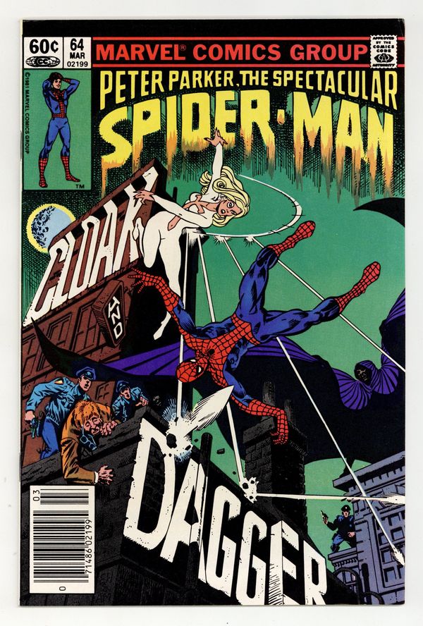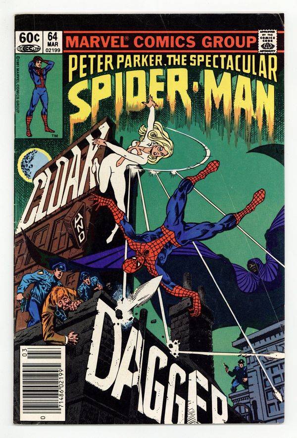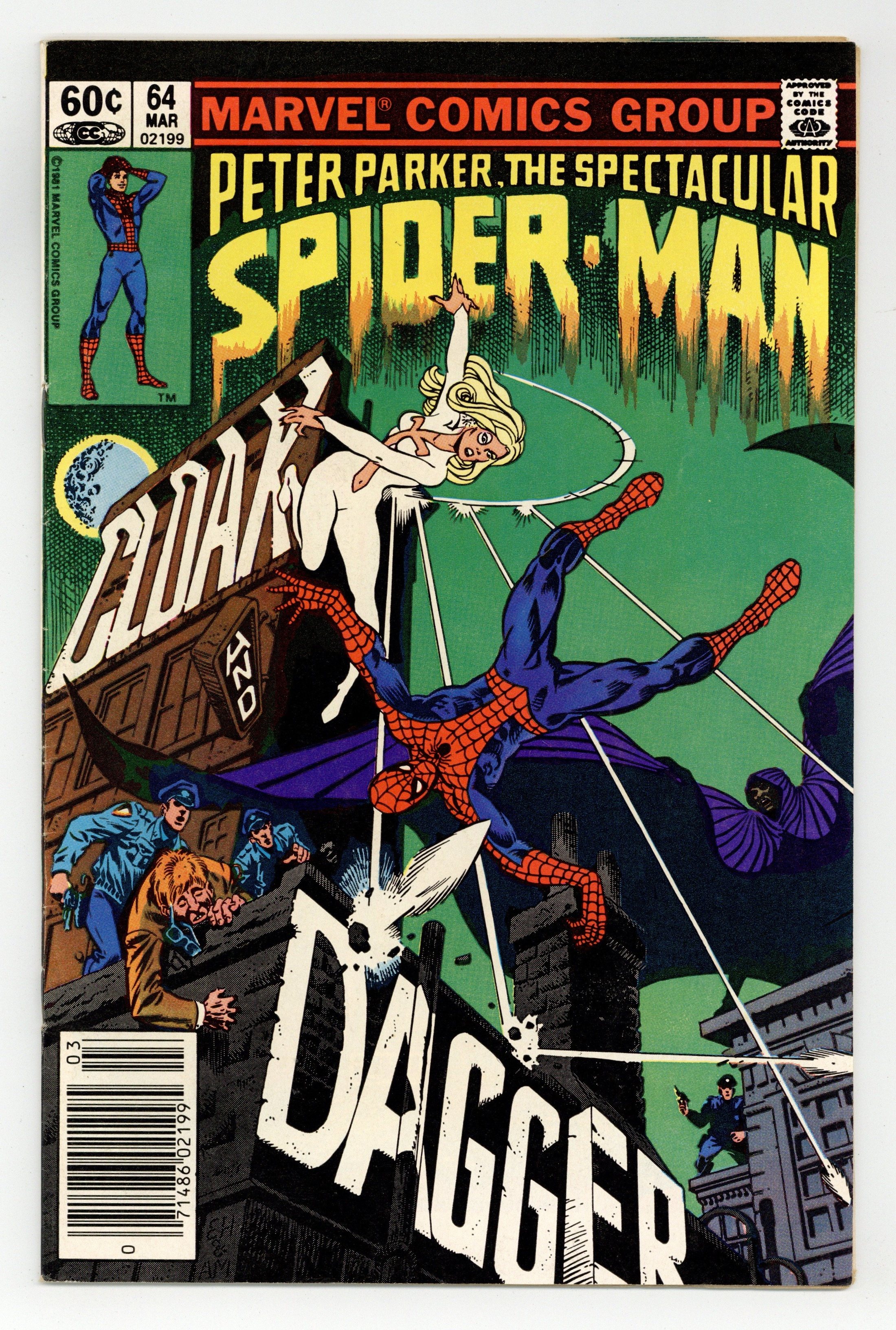 Newsstand Edition. "Cloak and Dagger!" Script by Bill Mantlo. Pencils by Ed Hannigan. Inks by Al Milgrom. Cover by Ed Hannigan and Al Milgrom. On a quiet night in Manhattan, the web-slinger is traveling across the city when he suddenly hears a desperate plea for help from a man running for his life! The frantic pharmacist is trying to escape from...Cloak and Dagger! The wall-crawler quickly engages the light-and-dark pair, but falls in battle to the duo's unusual powers. The next day Peter Parker picks up the investigation, and the trail of Cloak (aka Tyrone Johnson) and Dagger (aka Tandy Bowen) leads to Ellis Island! Is the Spectacular Spider-Man ready for round two with Cloak and Dagger? First appearance of Cloak and Dagger. (Notes: This issue includes a full-page ad/pin-up of Spider-Man fighting Dr. Octopus and promoting his four monthly titles. Bill Mantlo's script provides a nice history of Ellis Island. On page two Jim Mooney is erroneously listed as the inker. Al Milgrom is acknowledged as the correct inker in the letters page of issue 68. The back cover contains a Dungeons and Dragons ad with art by Bill Willingham. Cloak and Dagger appear next in Spectacular Spider-Man 69 and 70.) 32 pages Cover price $0.60.