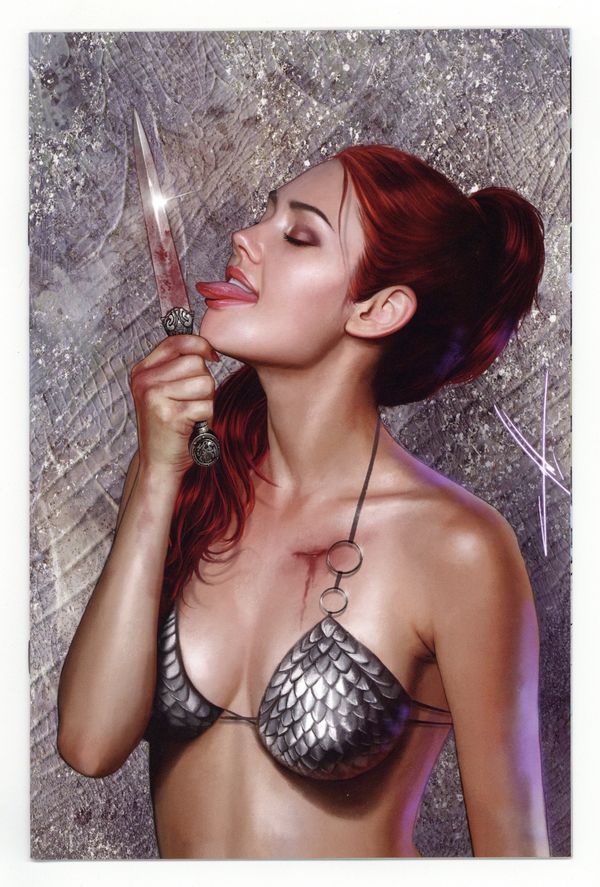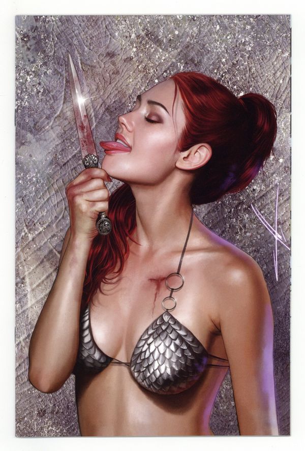 The 616 Comics Exclusive "Red Sonja" Virgin Cover by Carla Cohen. Written by Dan Abnett. Art by Alessandro Ranaldi. It's a monumental clash of titans that had to happen, from master storyteller Dan Abnett! Both Vampirella and Red Sonja were recruited by the Project, a cosmic collection of superheroes sworn to protect all known universes. But Vampirella is now considered a murderous criminal - and she's capable of defeating any hero. Unfortunately for her, Red Sonja is no hero… It's a universe-spanning, action-packed battle royal from start to finish, by Dan Abnett (Dejah Thoris) and Alessandro Ranaldi (Jennifer Blood)! 32 pages, full color. Rated teen