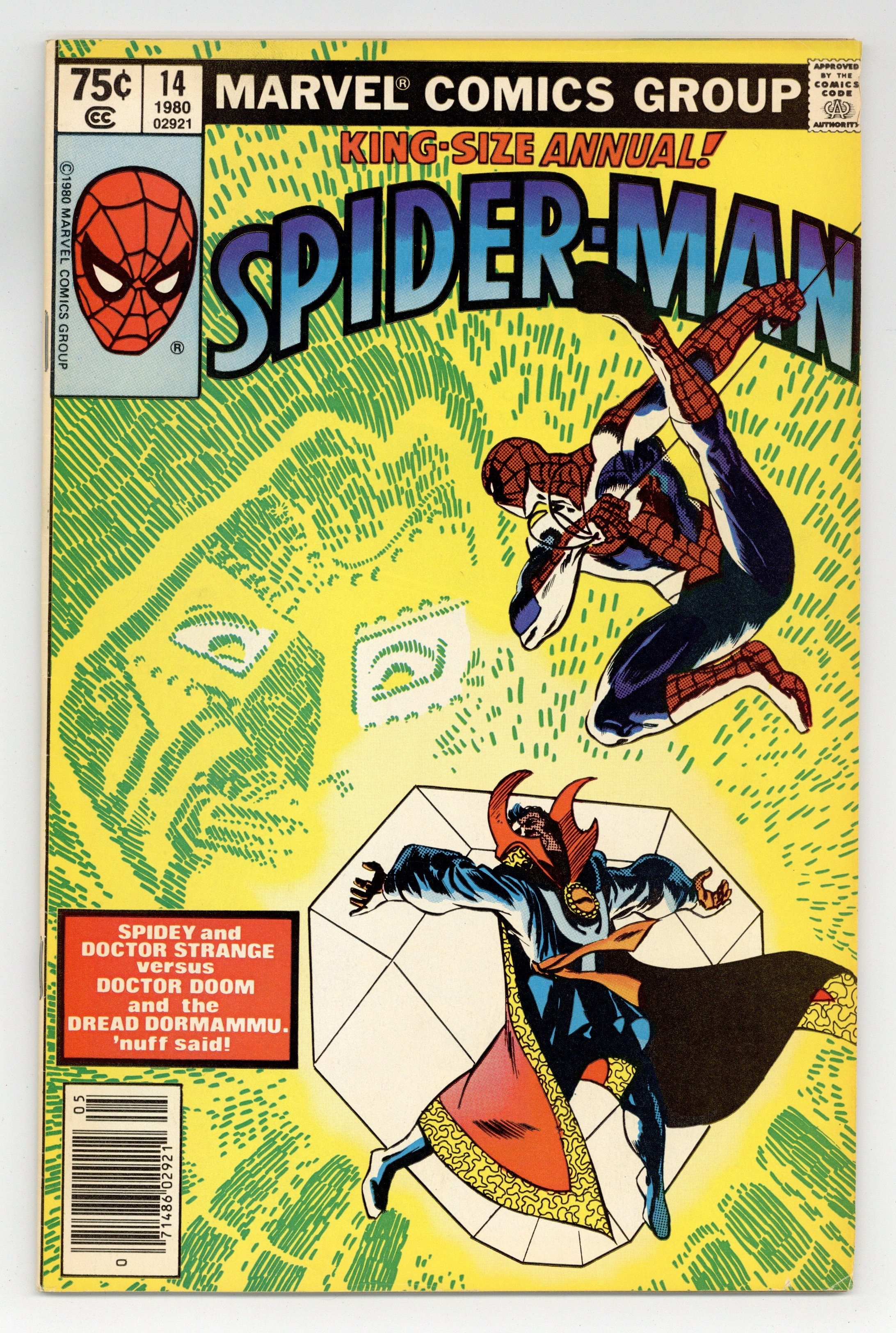 Newsstand Edition. "The Book of the Vishanti" Guest-starring Doctor Strange. Script by Denny O'Neil. Pencils by Frank Miller. Inks by Tom Palmer. Cover by Frank Miller. Doctor Doom and the Dread Dormammu conspire to bring the Bend Sinister phenomenon to Earth's dimension! And the Master of the Mystic Arts is the only person who understands the great evil that now threatens the planet! However Doom and Dormammu's earthly pawn captures Dr. Strange with a surprise attack in Greenwich Village! But before the good doctor goes down, he sends forth a psychic flare for help...to any superhero available in the Big Apple! On this moonlit night, there is only one hero present to answer the call: the Amazing Spider-Man! The web-slinger usually deals with modest villains and small-time criminals; but tonight, the wall-crawler tangles with the heavyweights! Earth's precarious future lies in the hands of your friendly neighborhood Spider-Man! (Notes: This issue features outstanding artwork by Frank Miller and Tom Palmer. This story was reprinted in Marvel Tales 200 and also in the (1994) Complete Frank Miller Spider-Man.) 52 pages. Cover price $0.75.