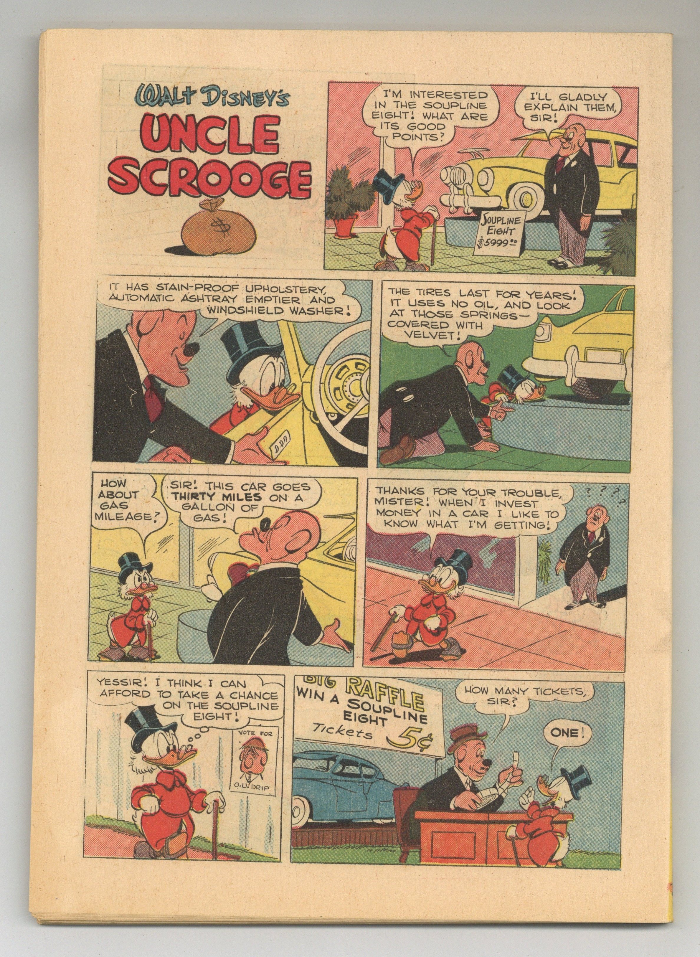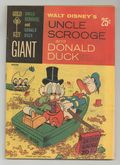 $50.00# on cover: 30026-509. 25c. A 68-page giant size comic with non-slick paper covers reprinting a variety of Donald Duck and Scrooge McDuck stories including two long classic stories by the grand old Duck man, writer/artist Carl Barks: "Only A Poor Old Man," (from Four Color #386) in which Scrooge, Donald, and Huey, Dewey, and Louie move Scrooge's money to a new hiding place when the Beagle Boys start construction in the lot next to the money bin (This story has the famous Scrooge McDuck philosophy: "NO man is poor who can do what he likes to do once in a while! And I like to dive around in my money like a porpoise! And burrow through it like a gopher! And toss it up and let it hit me on the head!"), and the Four Color #29 reprint, "Donald Duck and the Mummy's Ring" in which a mysterious ring with three serpents on it lead Donald, Huey, Dewey, and Louie into a perilous adventure to Egypt. Issue also has three untitled Donald and Scrooge stories and two one-page gag strips. The gag strips are by Barks and story/art credits are unknown on the untitled stories. NOTE: This comic is very rare in the higher grades. This saddle-stitched (with three staples) reprints Four Color #386 (Uncle Scrooge #1) and the first story from Four Color #29. Rather than being printed on slick paper, the cover is newsprint. Gold Key briefly experimented with newsprint covers on several of their giant comics and Uncle Scrooge and Donald Duck #1 was one of them. As might be expected, the results were less than satisfactory, and the experiment was soon dropped. Cover price $0.25.