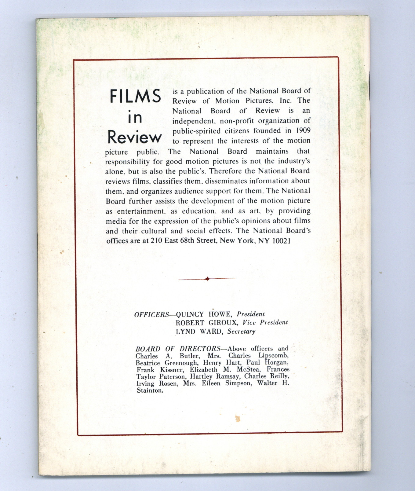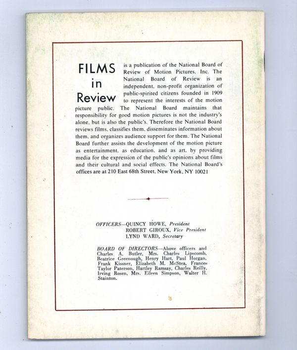 Film in Review is a publication of the National Board of Review of Motion Pictures, Inc, an independent, non-profit organization of public citizens founded in 1909 to represent the interests of the motion picture public. This National Board further assists the development of the motion picture as a source of entertainment, as education, and as art, by providing media for the expression of the public's opinion about films and their cultural and social effects. 5 1/2-in. x 7 1/2-in., 64 pages, B&W. Cover price $1.00.