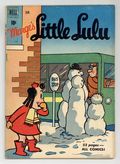 Published Jan 1951 by Dell/Gold Key.$23.00Cover art by Irving Tripp. Adventures In Africa; Lulu tells Alvin about when she accidentally took a trip to Africa. Untitled Little Lulu story, script and art by John Stanley; Tubby plans on lots of kissing games at his birthday party. Cry Baby, script and art by John Stanley; Lulu thinks there is a bear in her bedroom closet. Untitled Little Lulu story, script and art by John Stanley; Lulu ruins the boys' snowballs with salt. Ten Pennies, script and art by John Stanley; Lulu wins ten pennies at school but Miss Feeny doesn't want her to buy candy for her friends. The Big Fish, script and art by John Stanley; Tubby catches a huge fish while ice fishing. Two-page text story, Lulus Diry ("Diary"). Back cover has advertisement for Dell Comics Club. 52 pages, full color. Cover price $0.10.