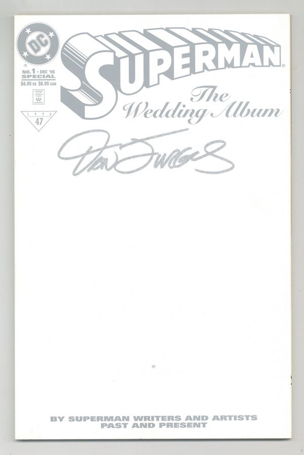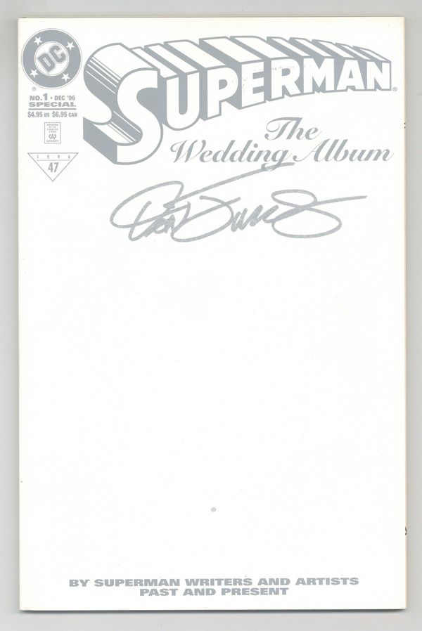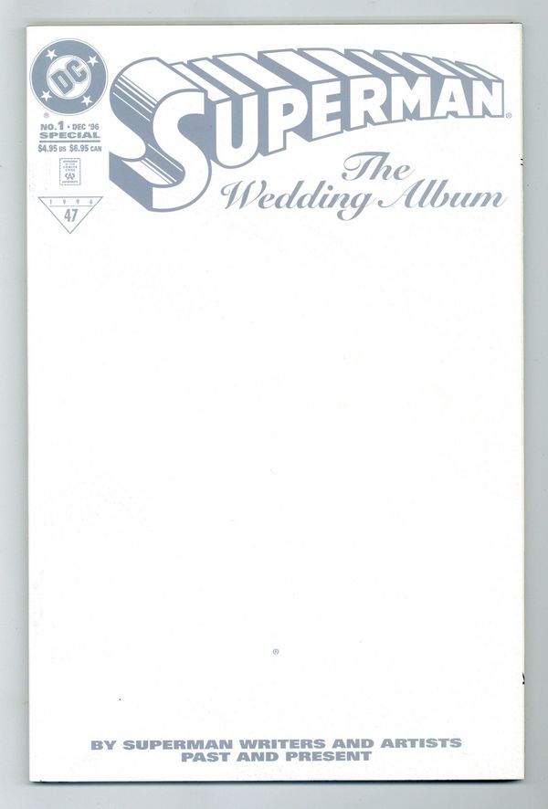 Collector's Edition. Clark Kent marries Lois Lane! By Superman writers and artists past and present! Batman appearance. Story by Dan Jurgens, Karl Kesel, David Michelinie, Louise Simonson & Roger Stern. Art by John Byrne & Terry Austin, Kerry Gammill & Murphy Anderson, Gil Kane & Bob McLeod, Stuart Immonen & Jose Marzan, Jr., Paul Ryan & Brett Breeding, Jon Bogdanove & Dennis Janke, Kieron Dwyer & Doug Hazlewood, Tom Grummett & Denis Rodier, Dick Giordano & Art Thibert, Jim Mooney & George Perez, Curt Swan & Jackson Guice, Nick Cardy, Al Plastino, Barry Kitson & Ray McCarthy, Ron Frenz & Joe Rubinstein, Dan Jurgens & Jerry Ordway. Cover price $4.95.