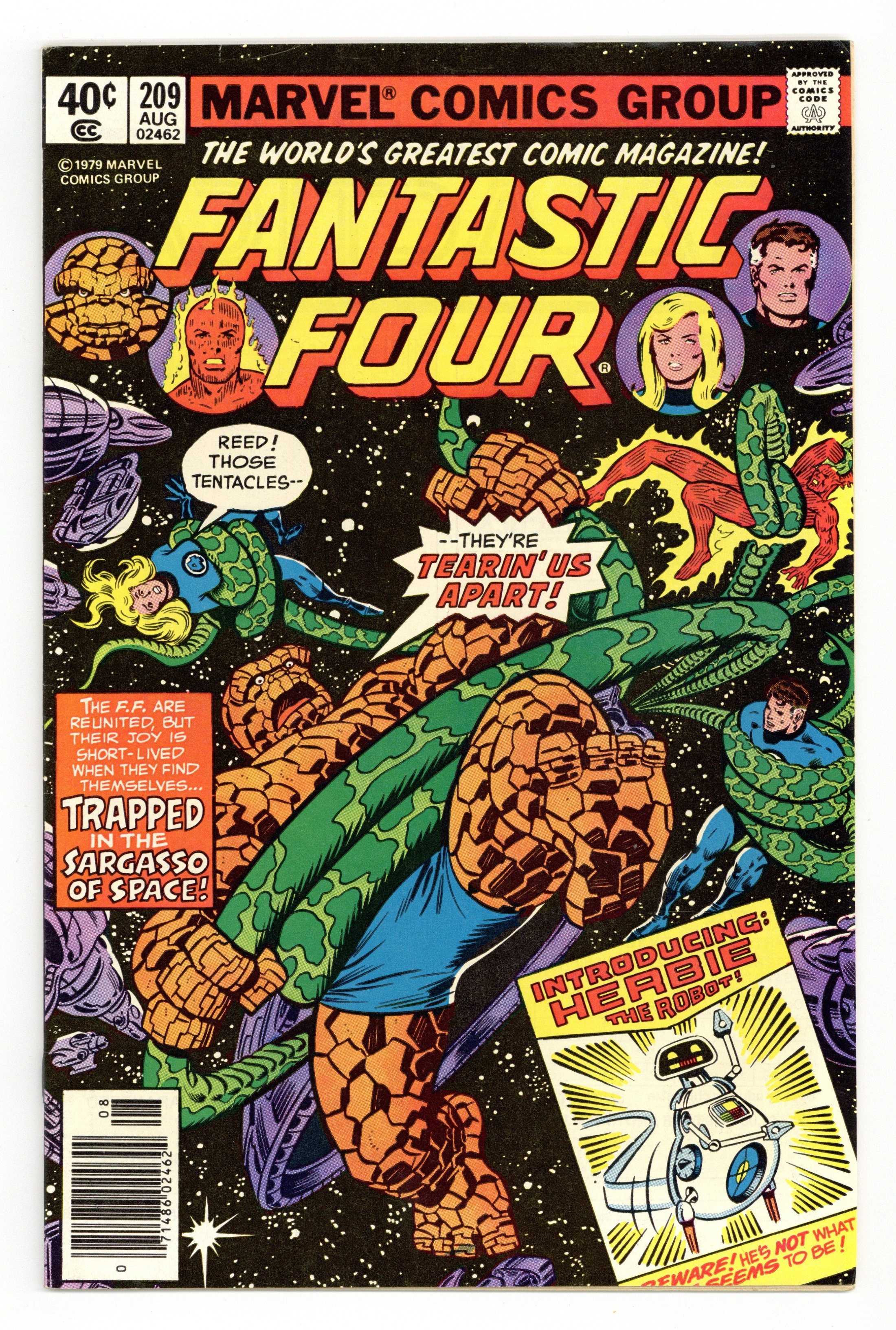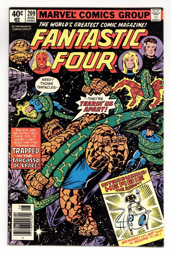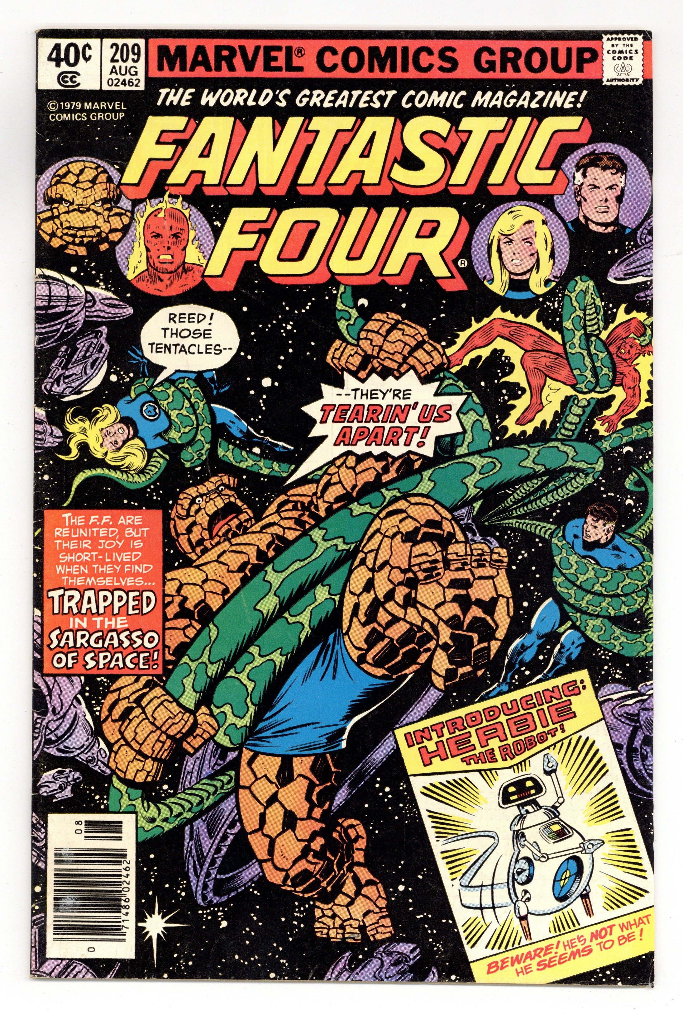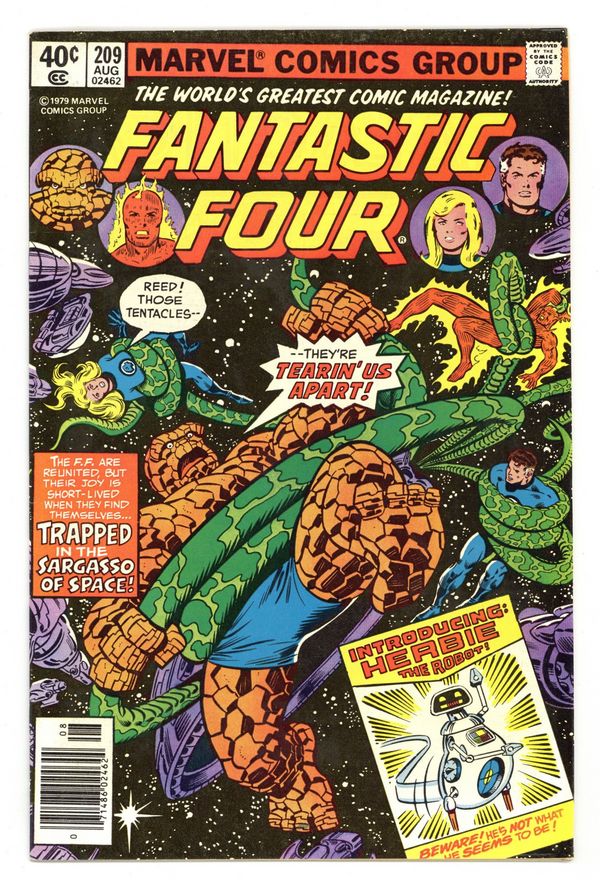 Newsstand Edition. "Trapped in the Sargasso of Space!" Written by Marv Wolfman. Pencils by John Byrne (first work on the series). Inks by Joe Sinnott. Cover by Keith Pollard and Joe Sinnott. Reed Richards has decided that only one person in the entire universe can prevent the Sphinx from destroying the Earth...Galactus! But first, can the FF find the Ravager of Worlds? And second, can they convince him to journey to Earth and save the planet? The quest begins in the Sargasso of space! Cameo appearances by Nova, Comet, Crimebuster, Diamondhead, and Powerhouse. Note: First appearance of Herbie the Robot, who was the fourth member of the Fantastic Four (instead of the Human Torch) on the FF's Saturday morning cartoon show. NOTE: To learn the final fate of Nova (Richard Rider) follow his story in the pages of Rom (1979) #24. - Odinson, mycomicshop Archivist. 36 pgs. Cover price $0.40.